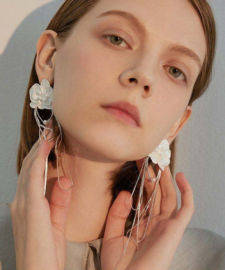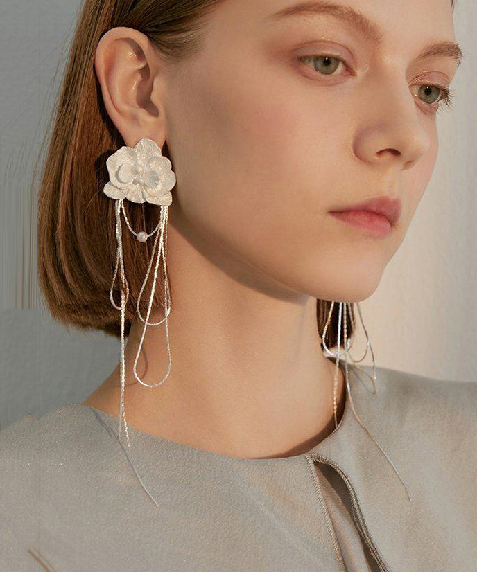 Elegant White Flower Tasseled Metal Drop Earrings