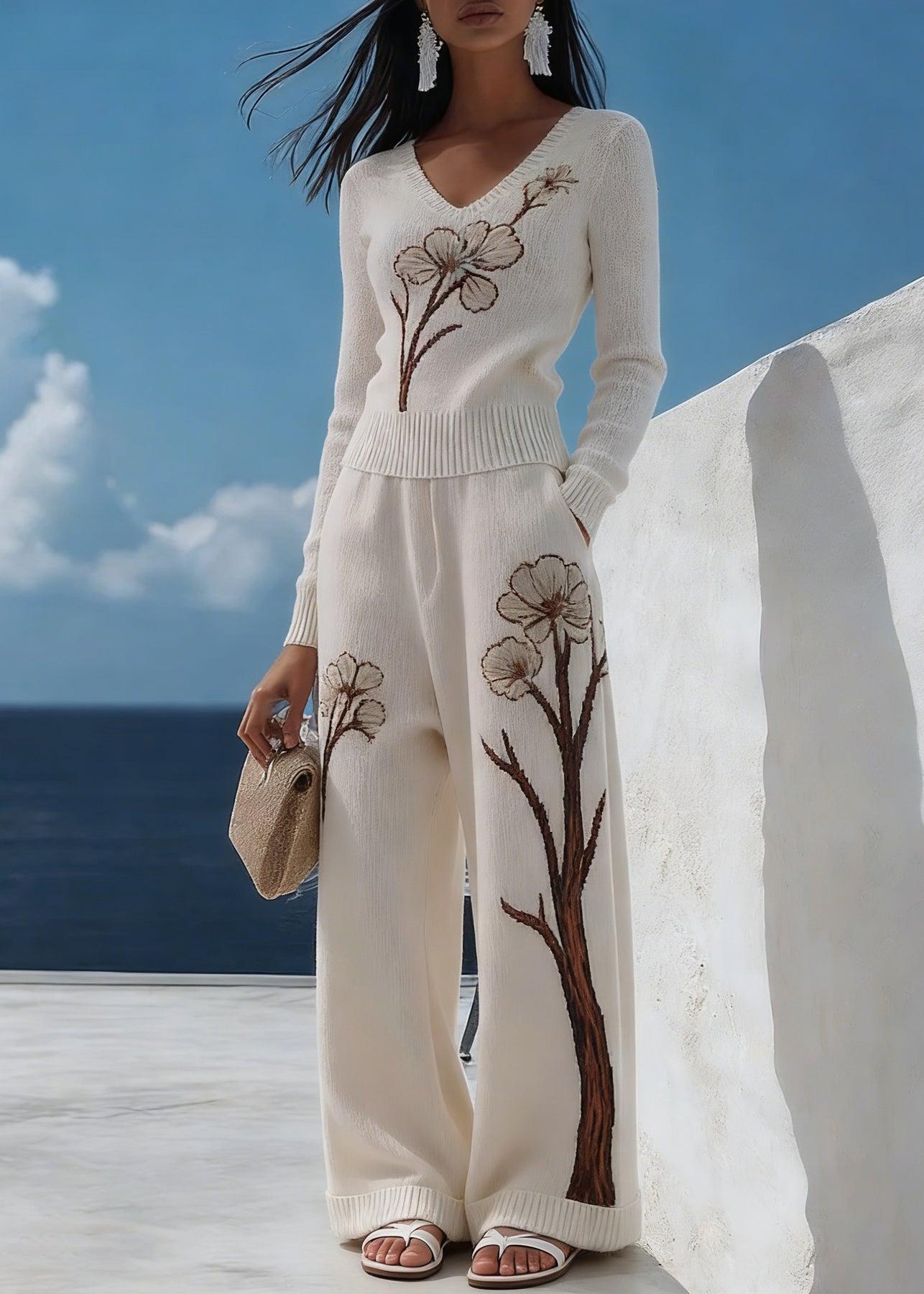 Art White V Neck Print Pockets Knit Two Pieces Set Spring - Omychic