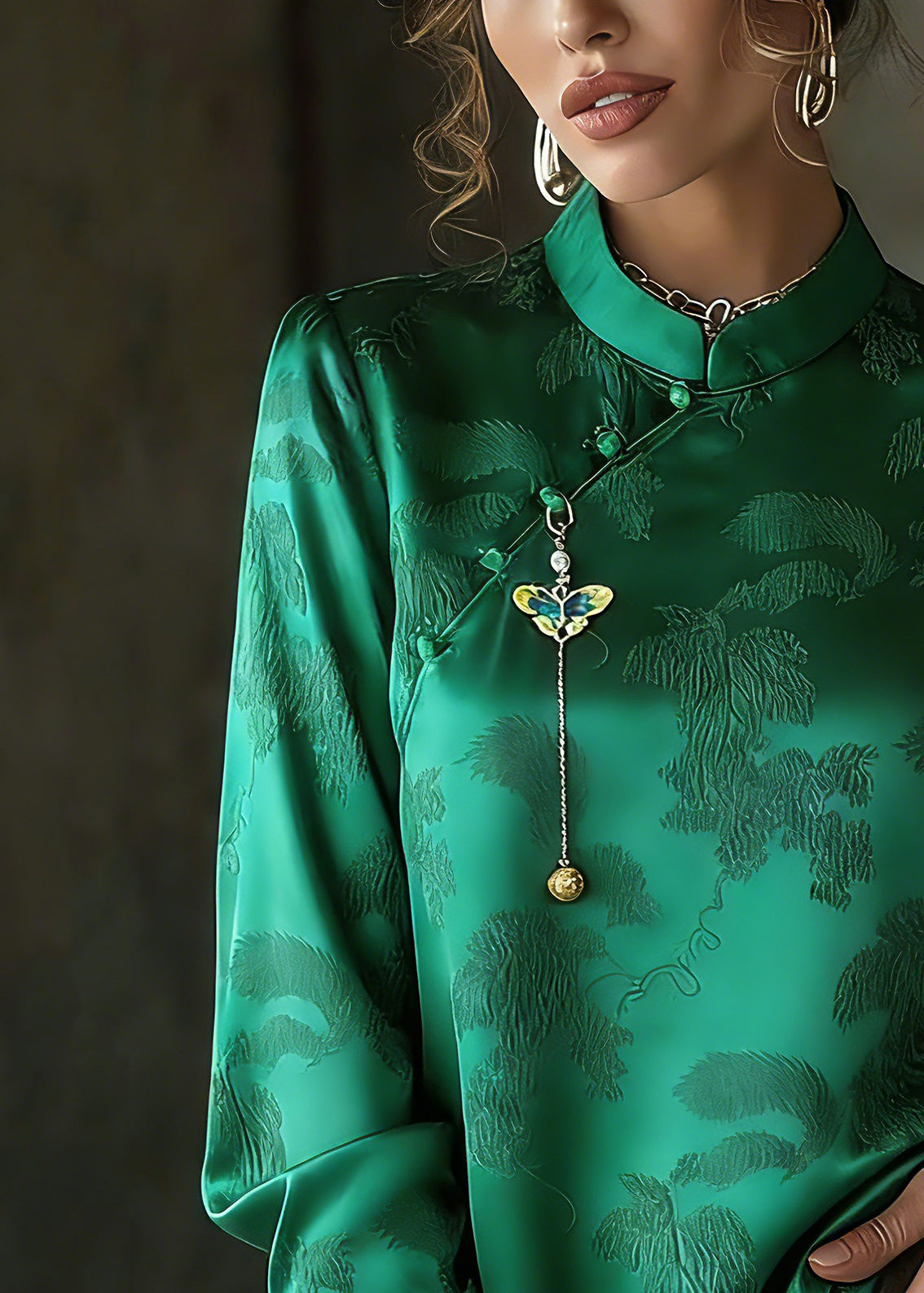 Fitted Green Stand Collar Embroidered Silk Shirts Spring
