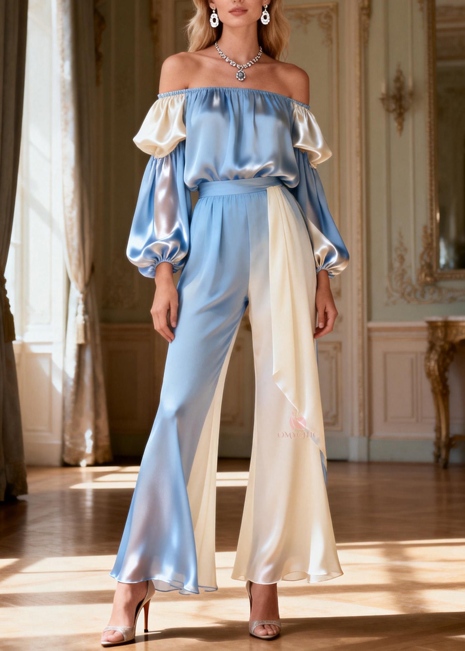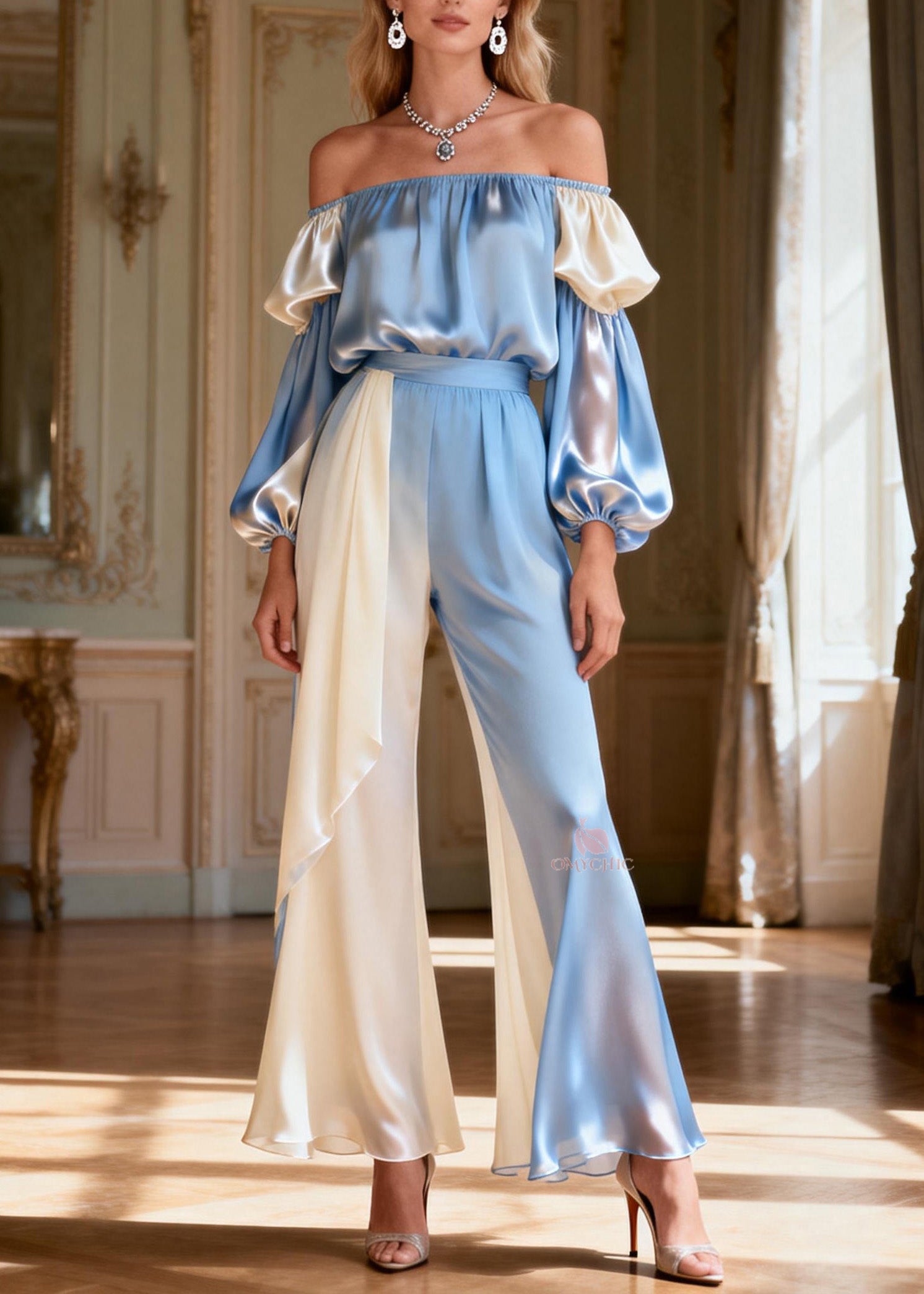 Chic Slash Neck Patchwork Silk Two Pieces Set Spring