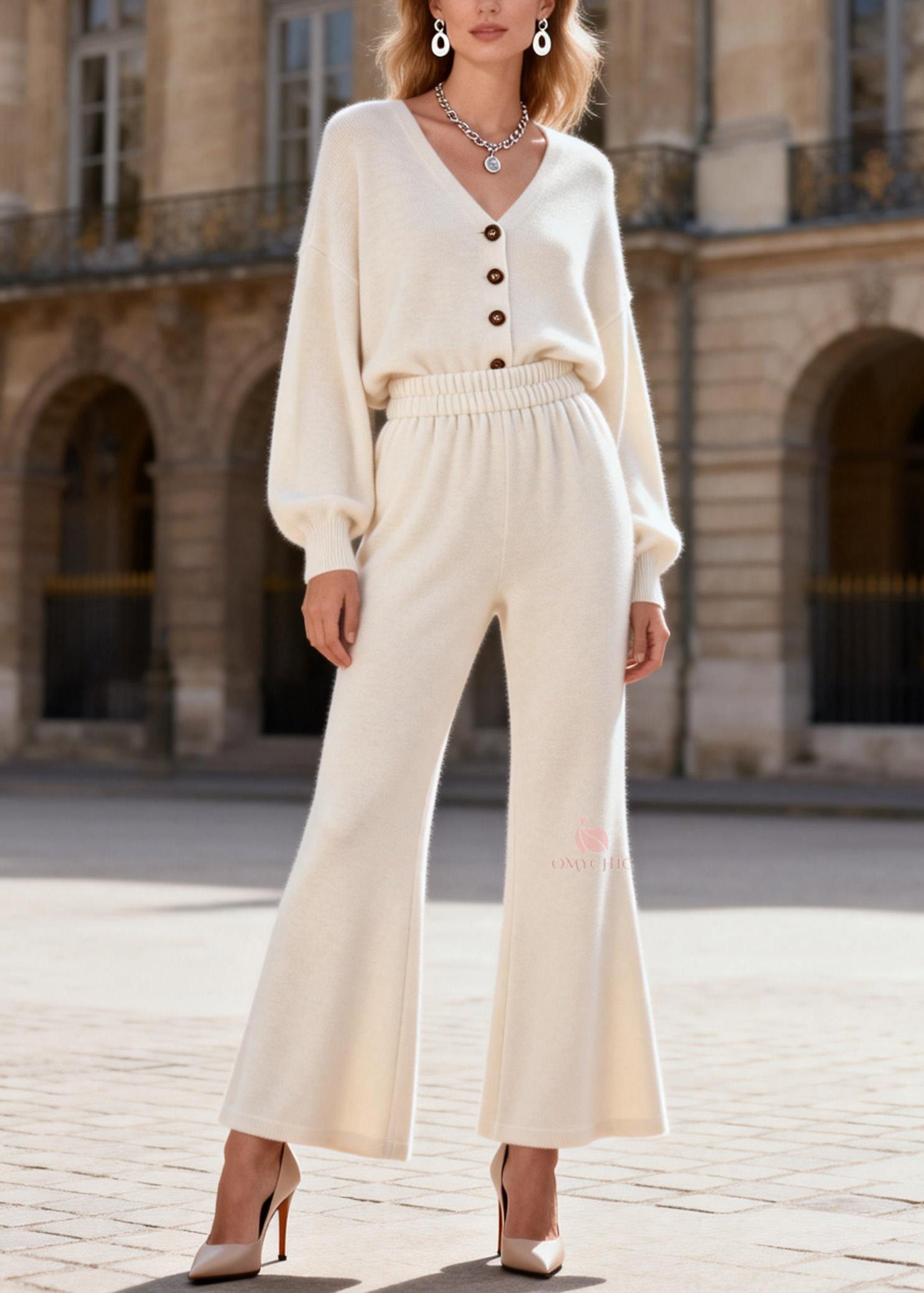 Loose V Neck Button Top And Pants Knit Two Pieces Set Spring