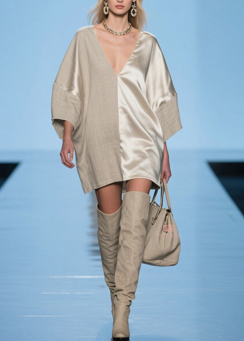 Modern V Neck Patchwork Linen Silk Mid Dress Spring