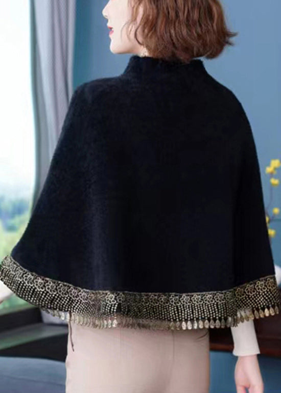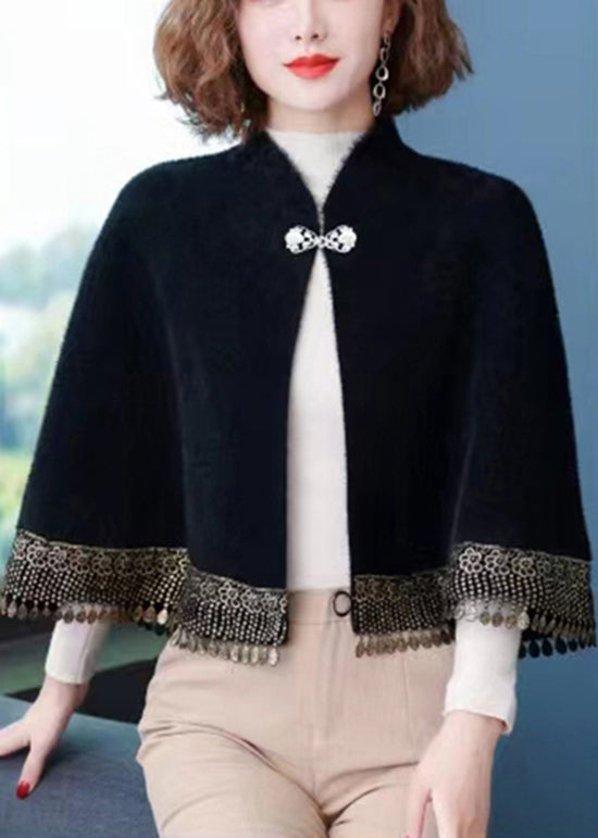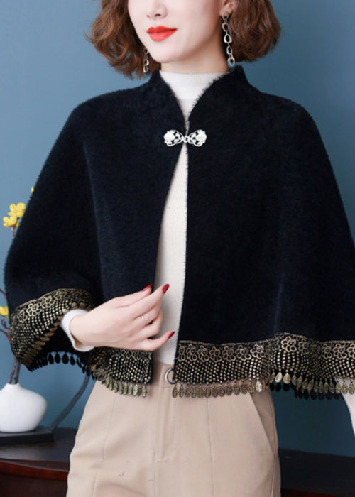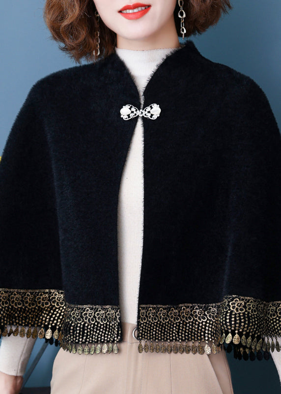 Black Button Patchwork Loose Mink Velvet Coats Tasseled Batwing Sleeve