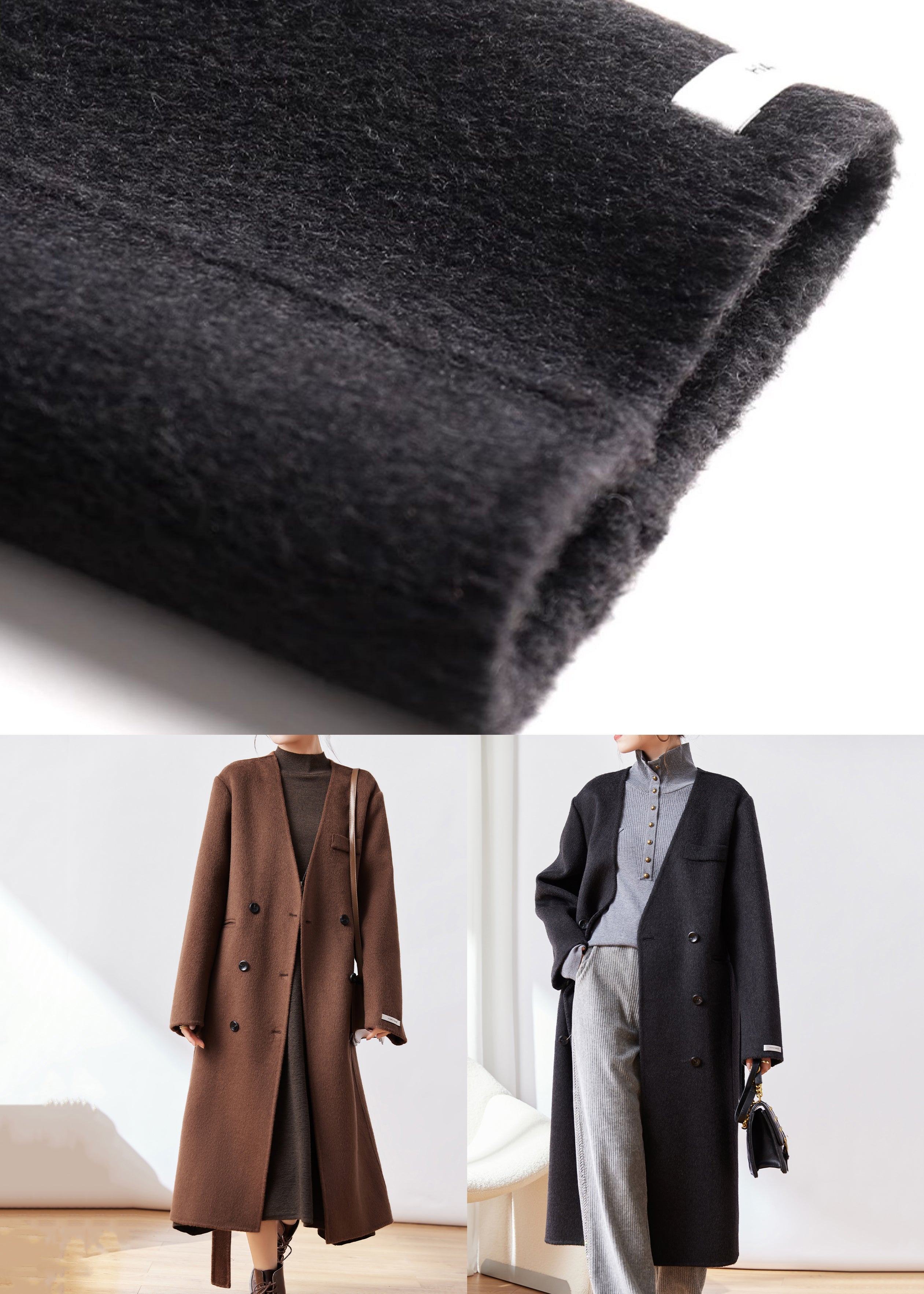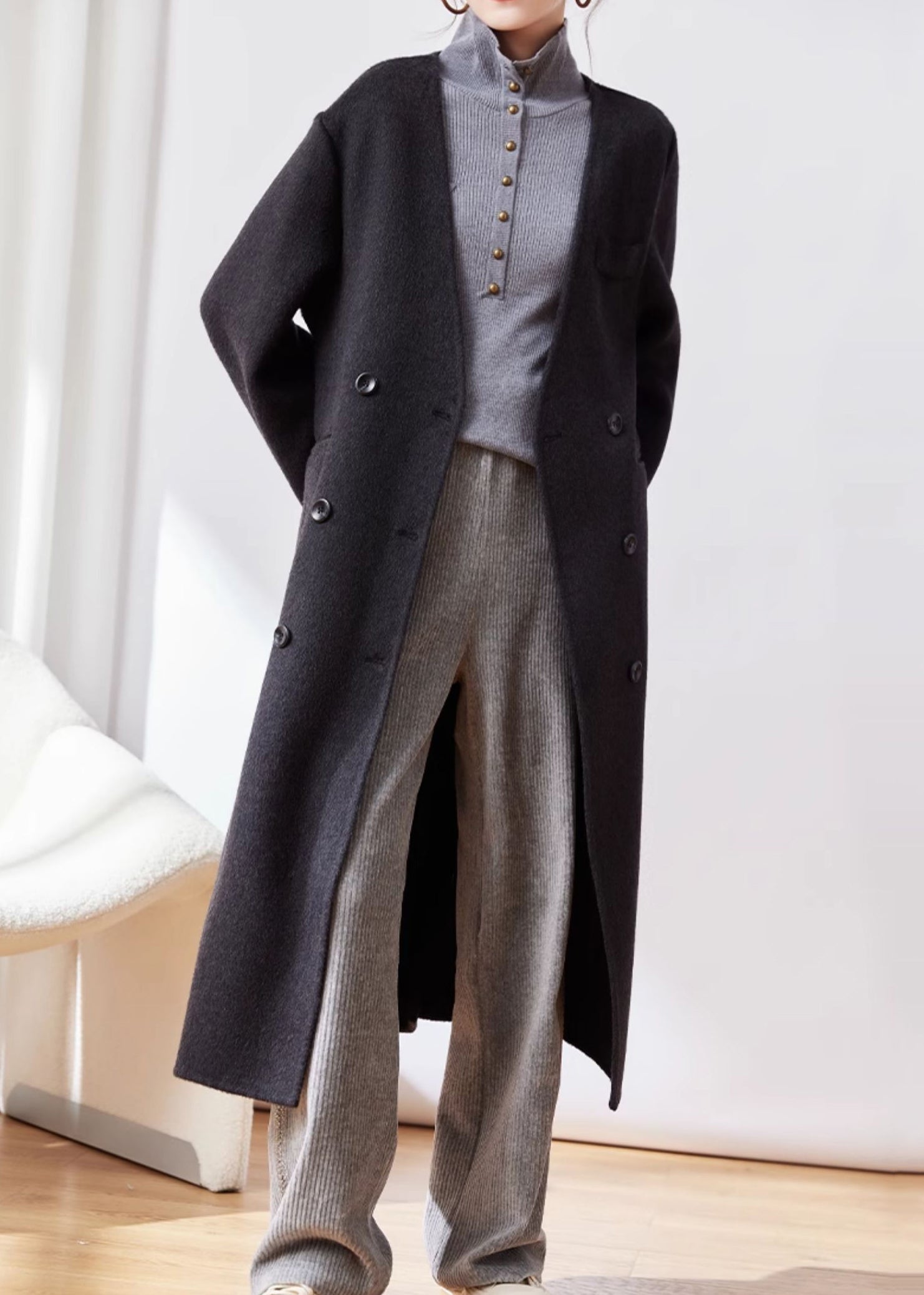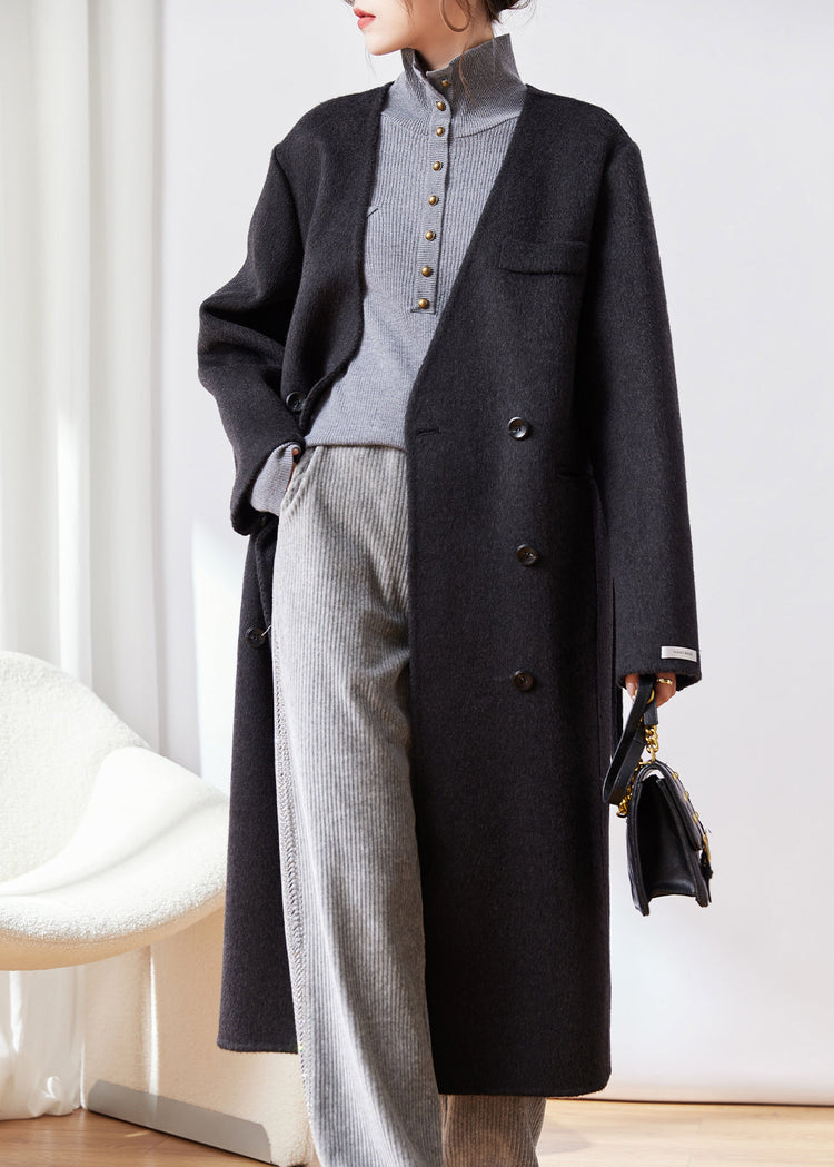 Black Button Patchwork Woolen Coat V Neck Long Sleeve