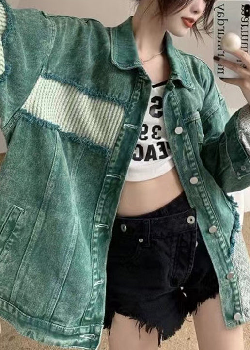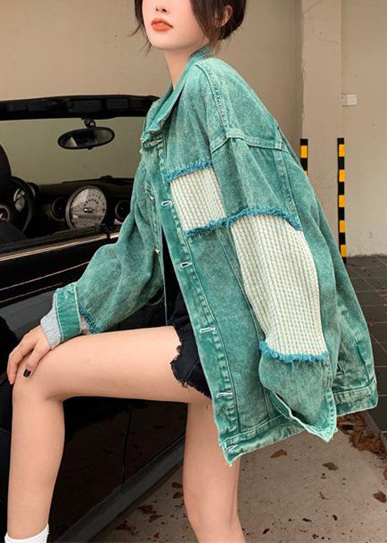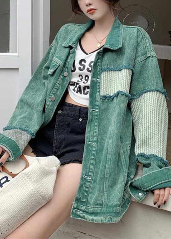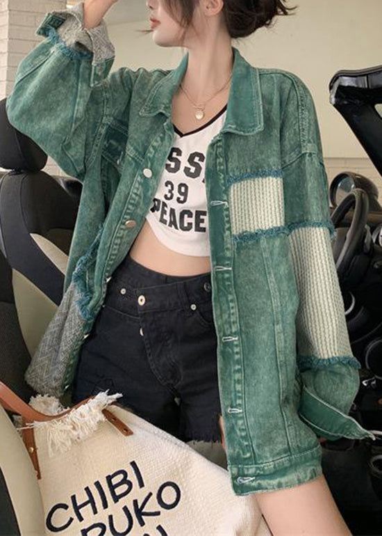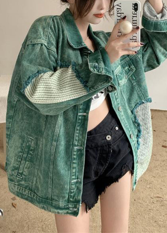 French Green Peter Pan Collar Pockets Patchwork Denim Coats Spring