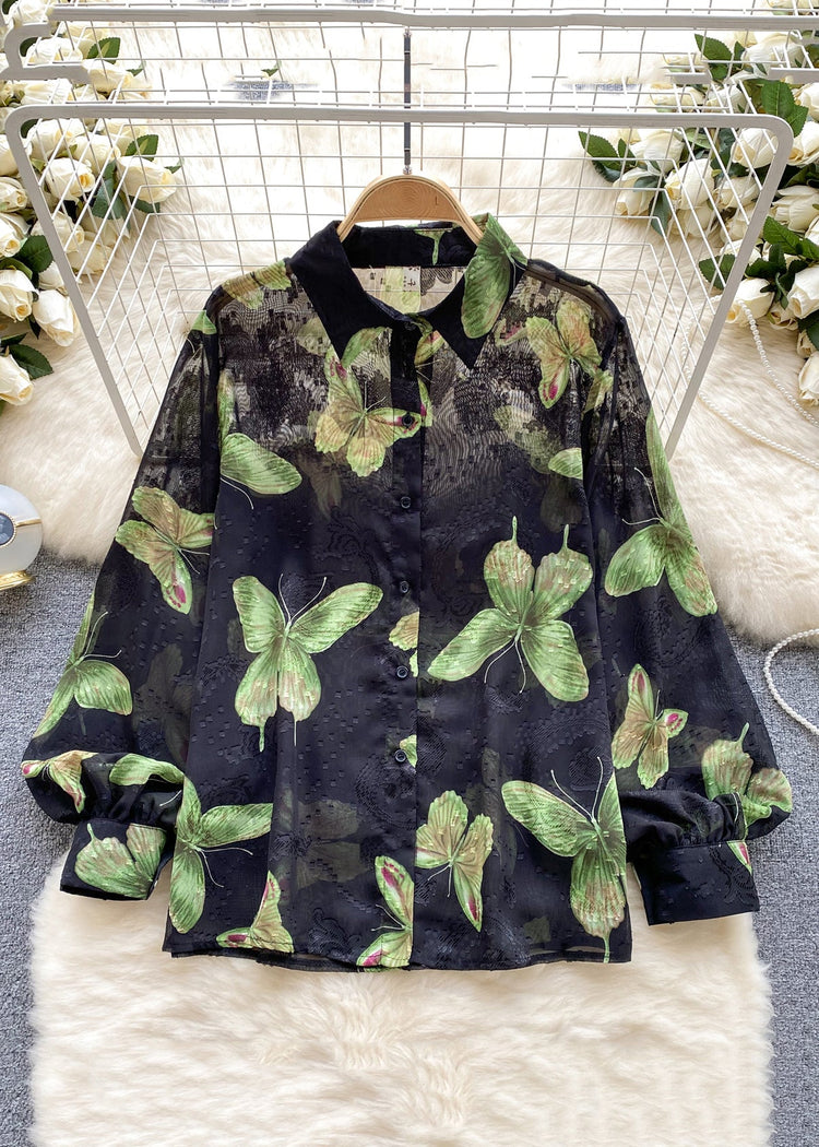French Green Peter Pan Collar Print Button Chiffon Shirt Long Sleeve