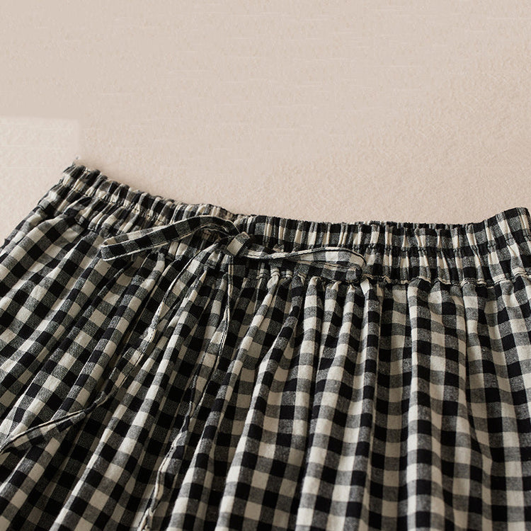 French Large Plaid Pockets Elastic Waist Linen Crop Pants Summer