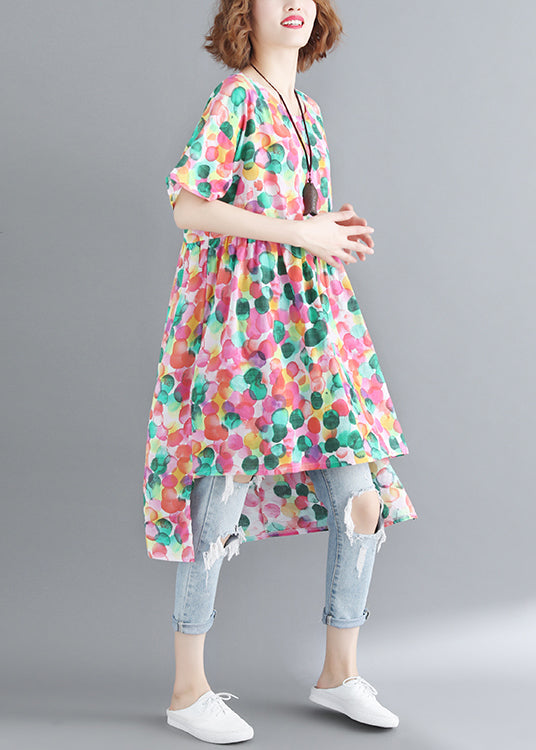 French O-Neck Cinched Dot Print low high design Dress Short Sleeve