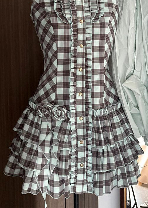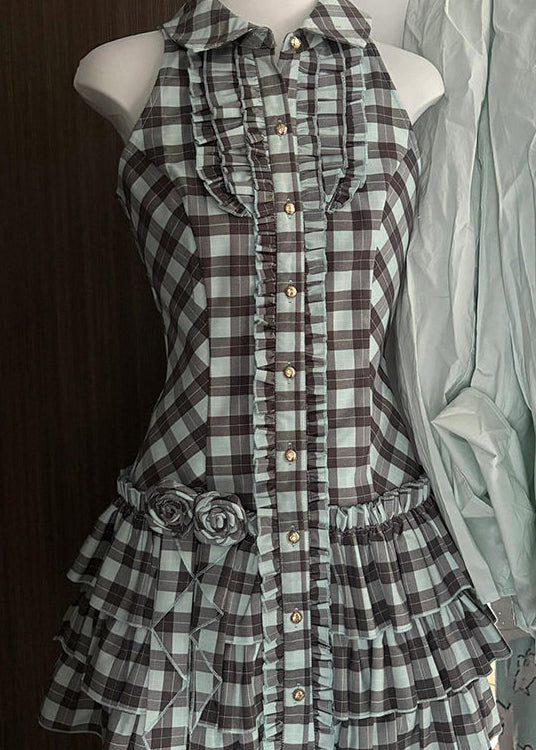 French Peter Pan Collar Plaid Ruffled Cotton Mid Dress Sleeveless