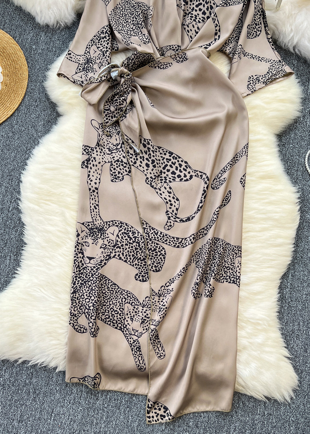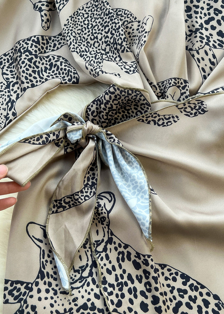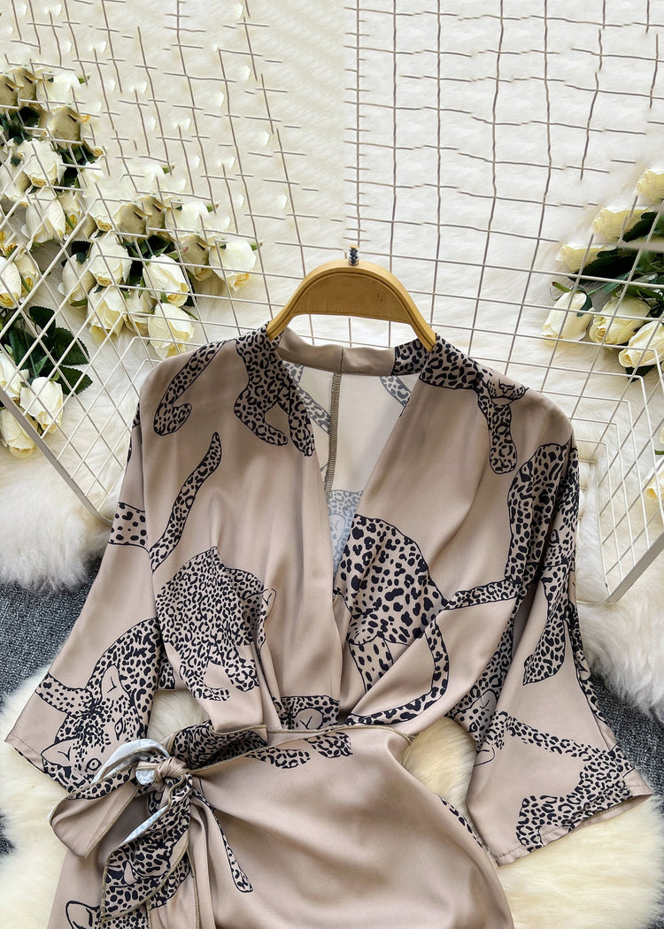 French Photo Color Print Lace Up Silk Dress Half Sleeve