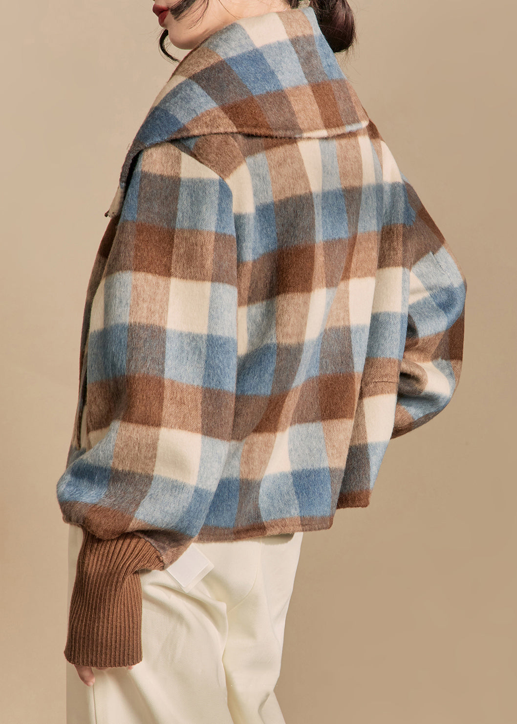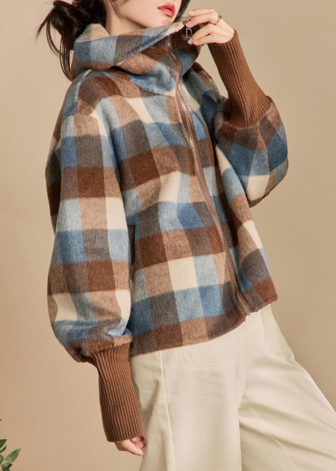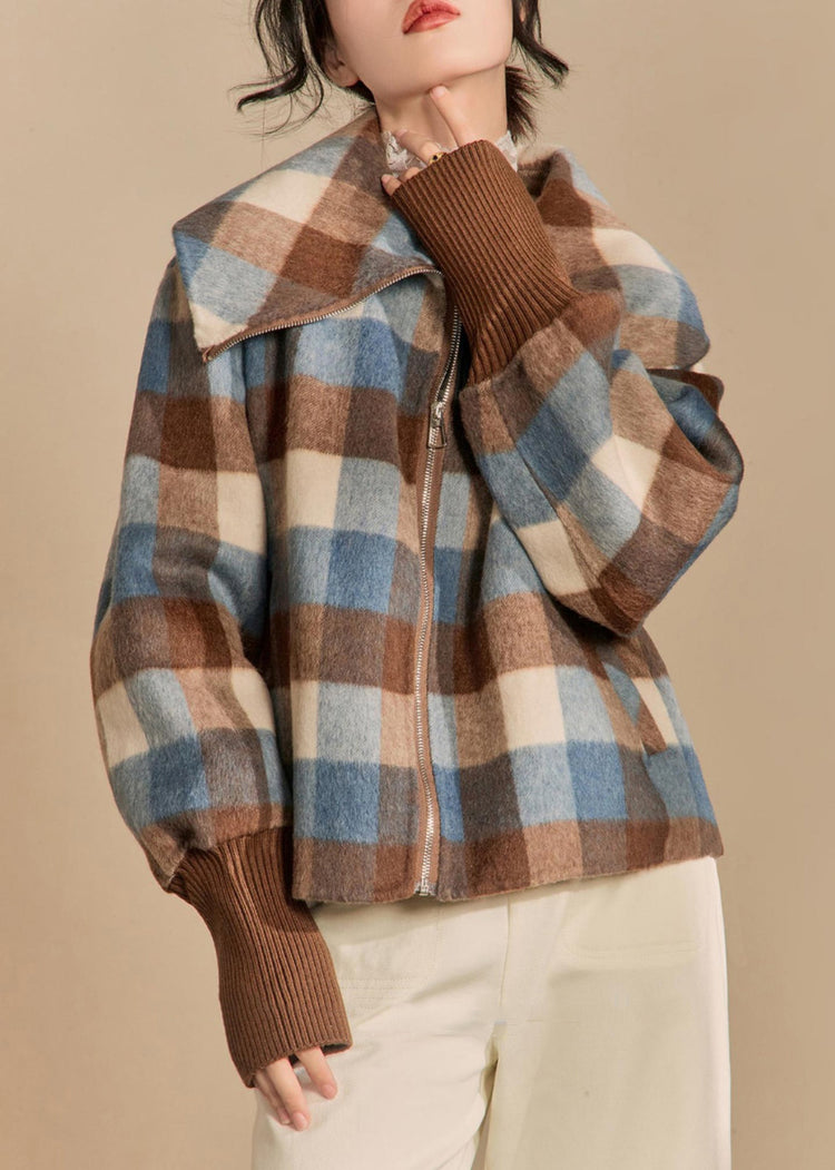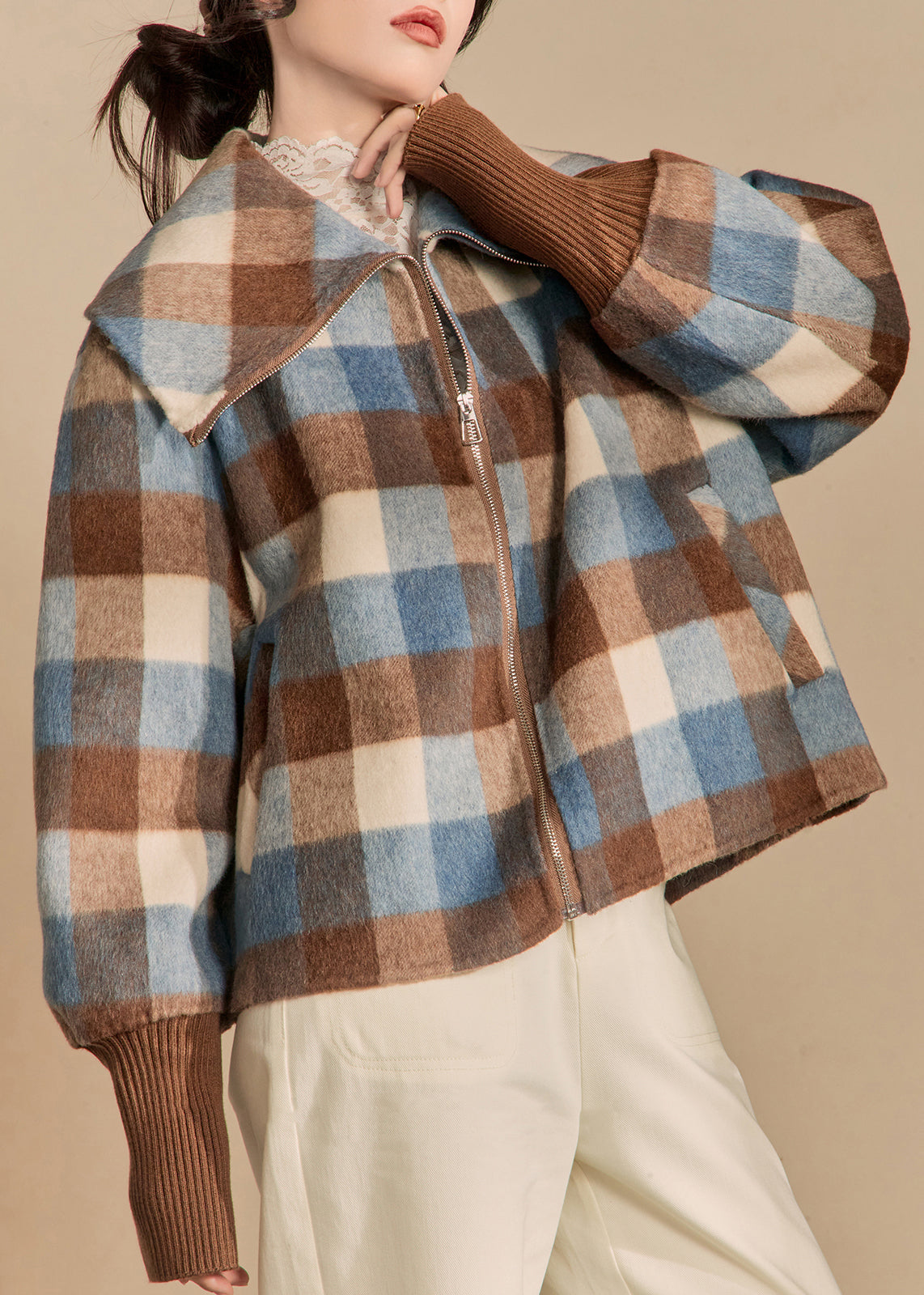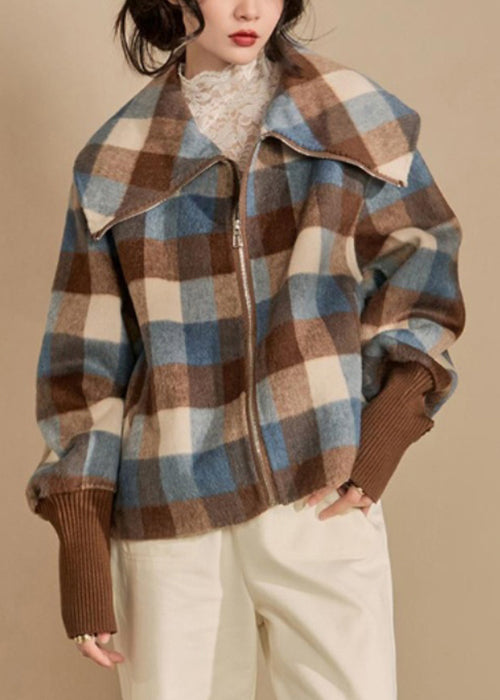 French Plaid Zip Up Patchwork Woolen Coats Winter