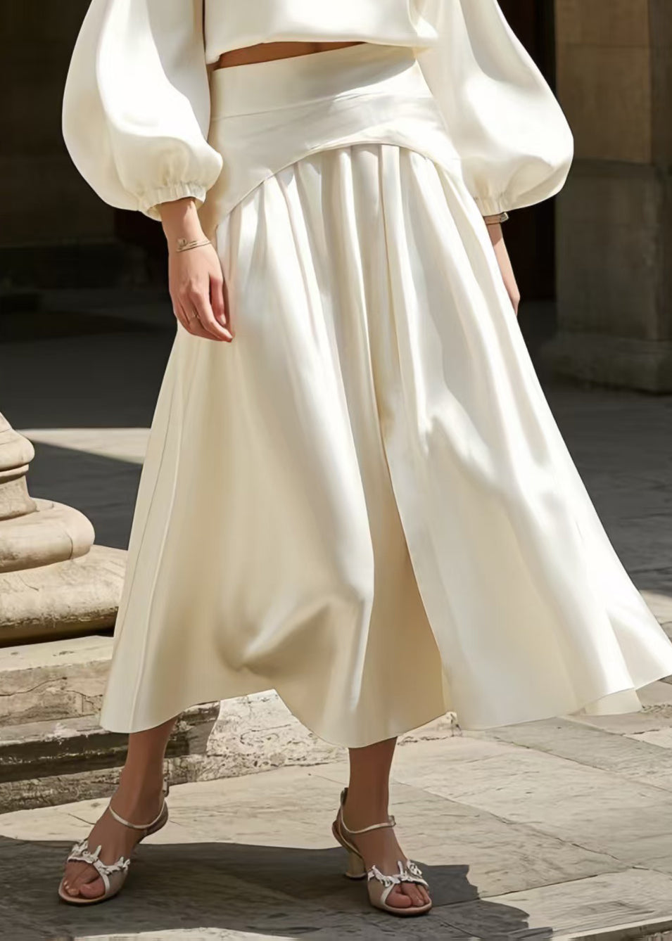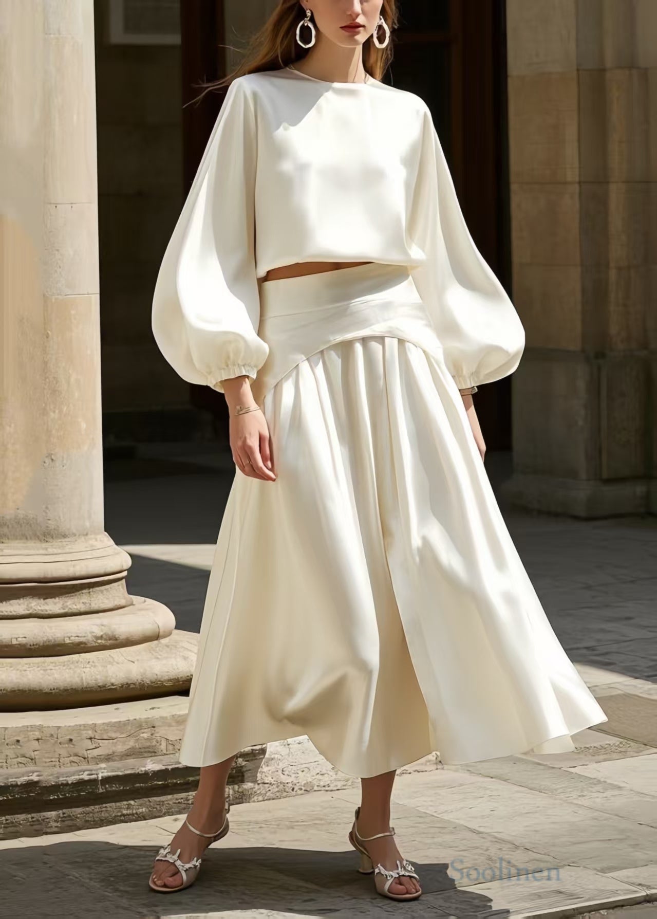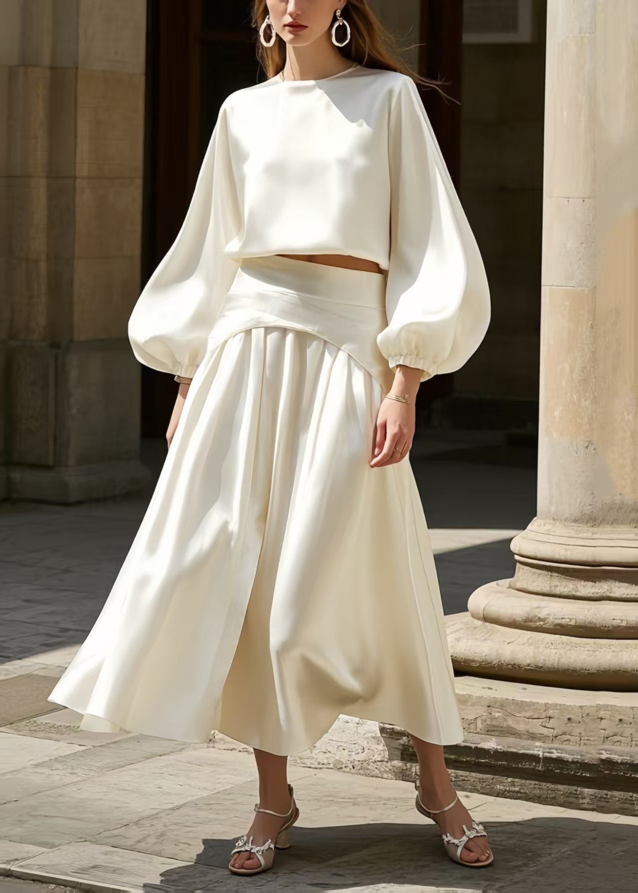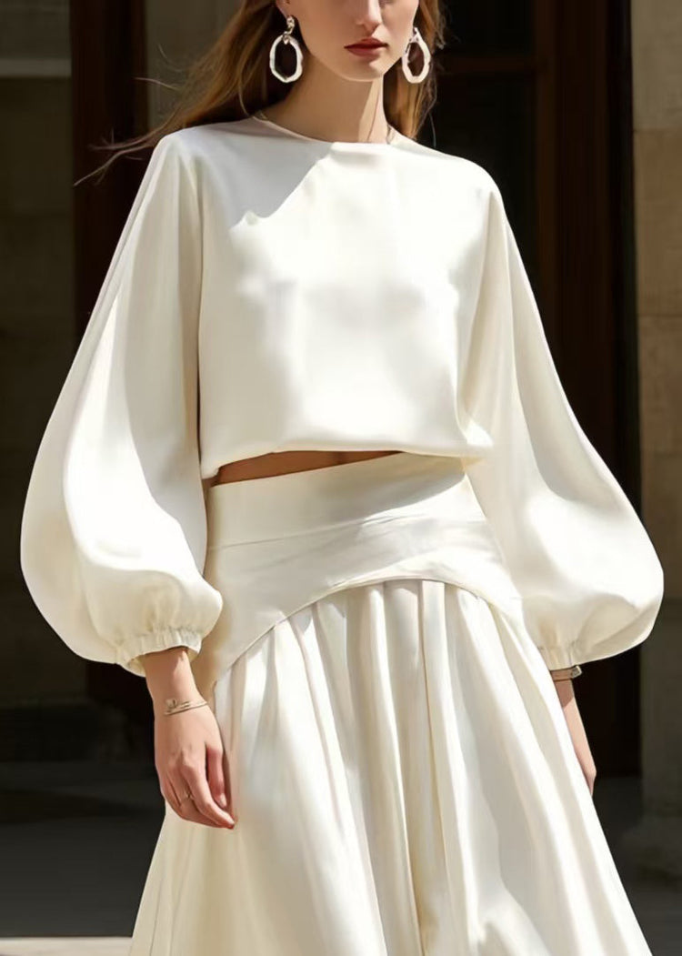 French White Exra Large Hem Draping Silk Two Pieces Set Lantern Sleeve