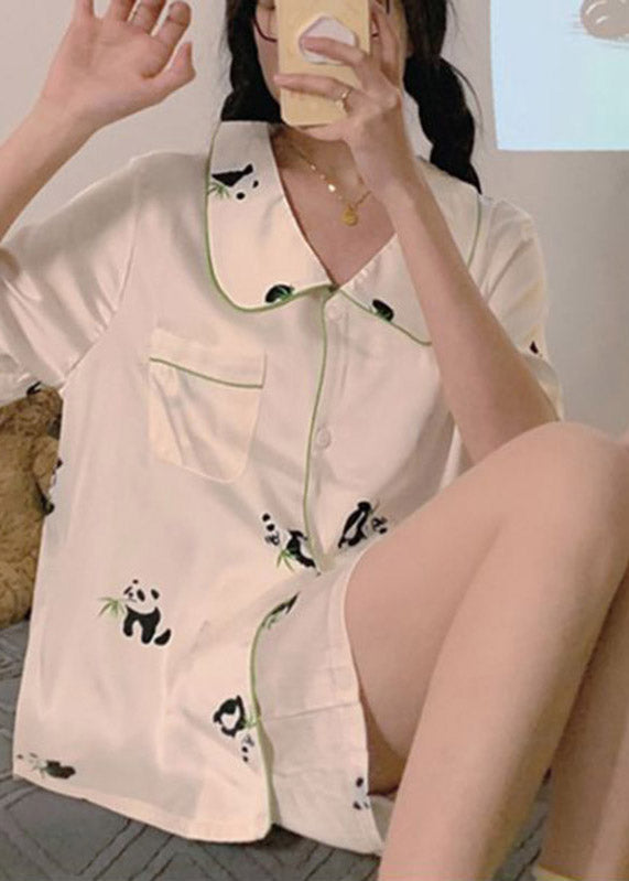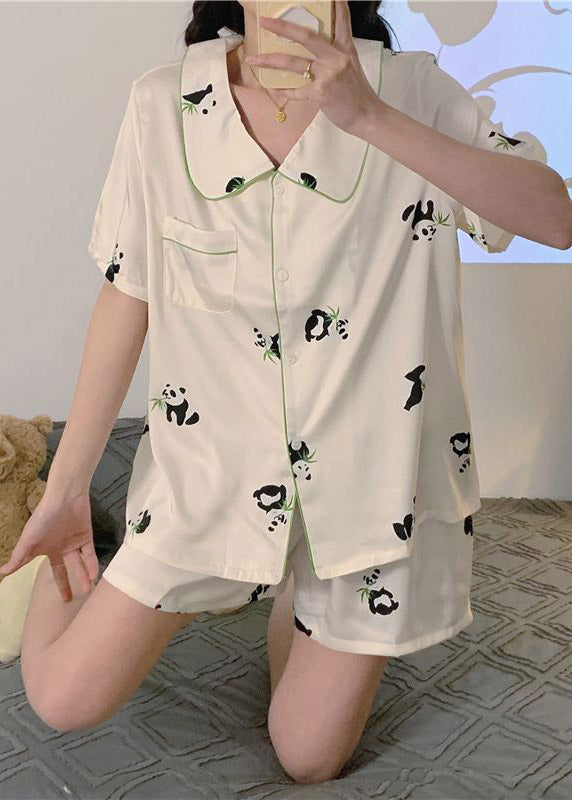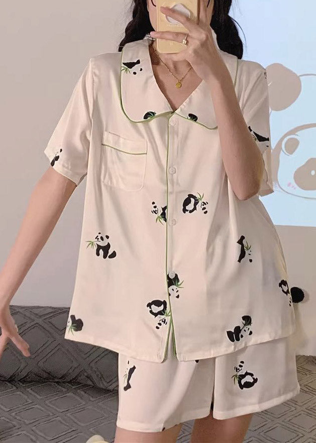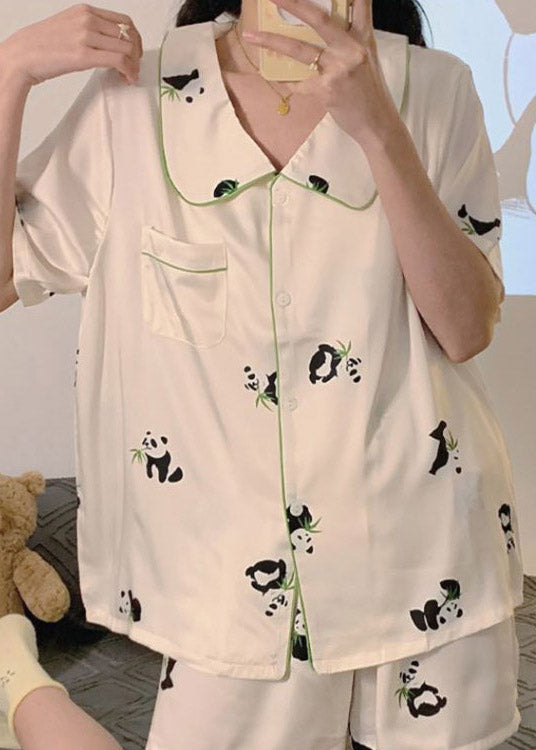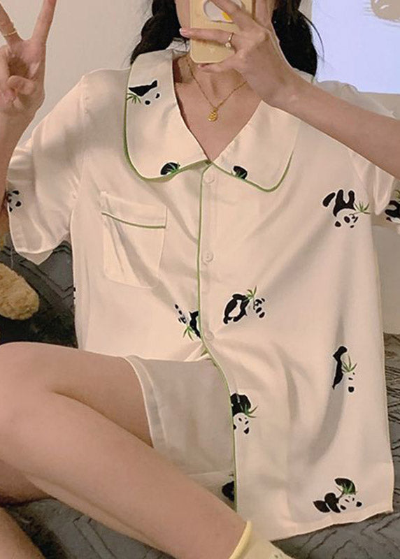 French White Peter Pan Collar Animal Print Patchwork Ice Silk Pajamas Two Piece Set Summer