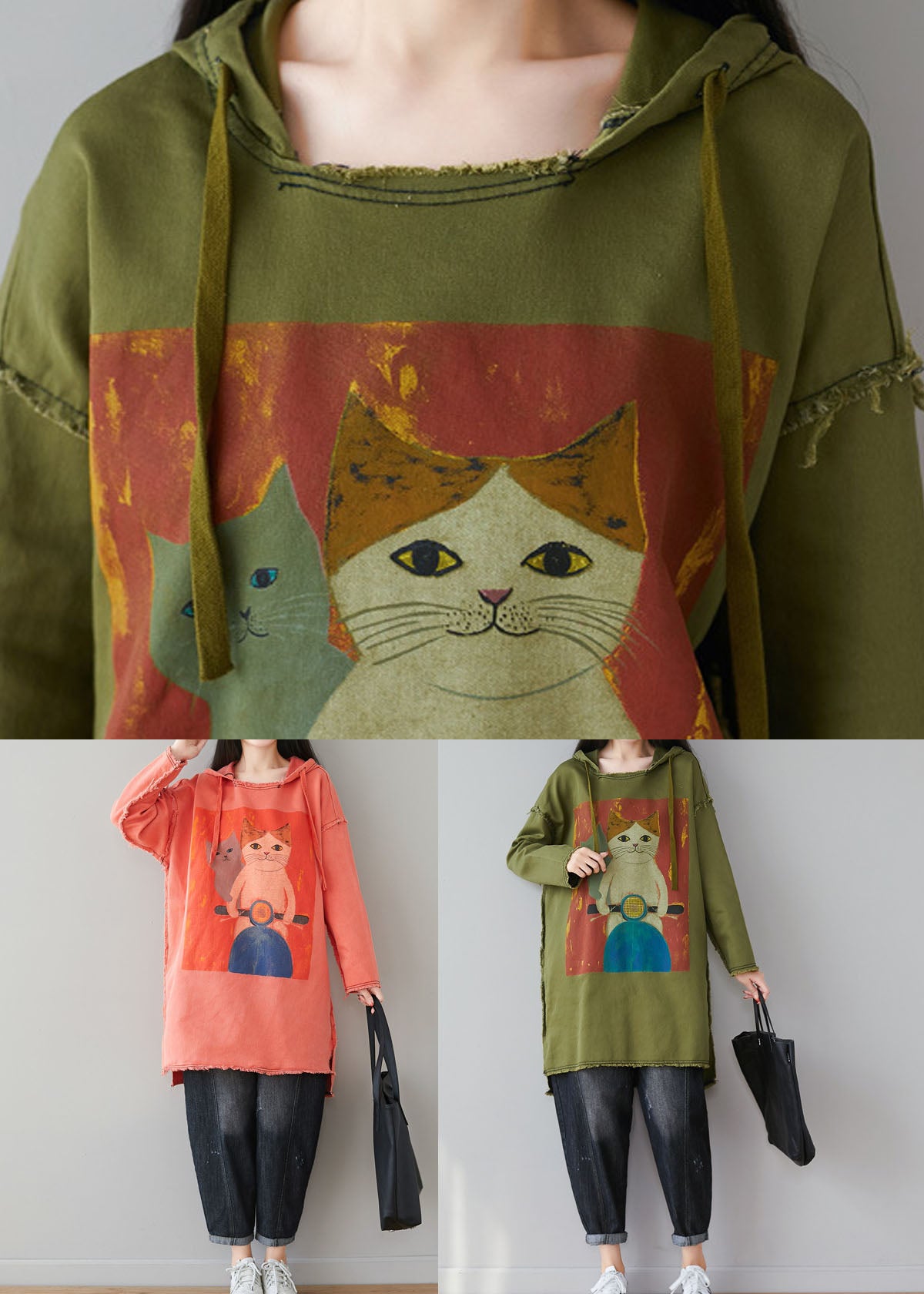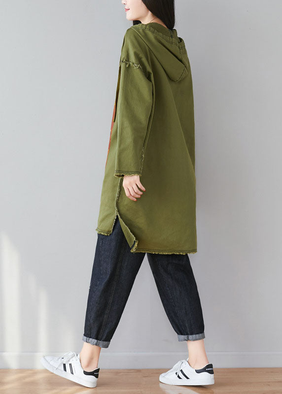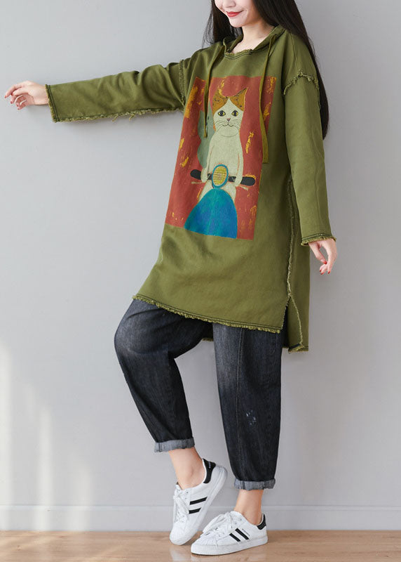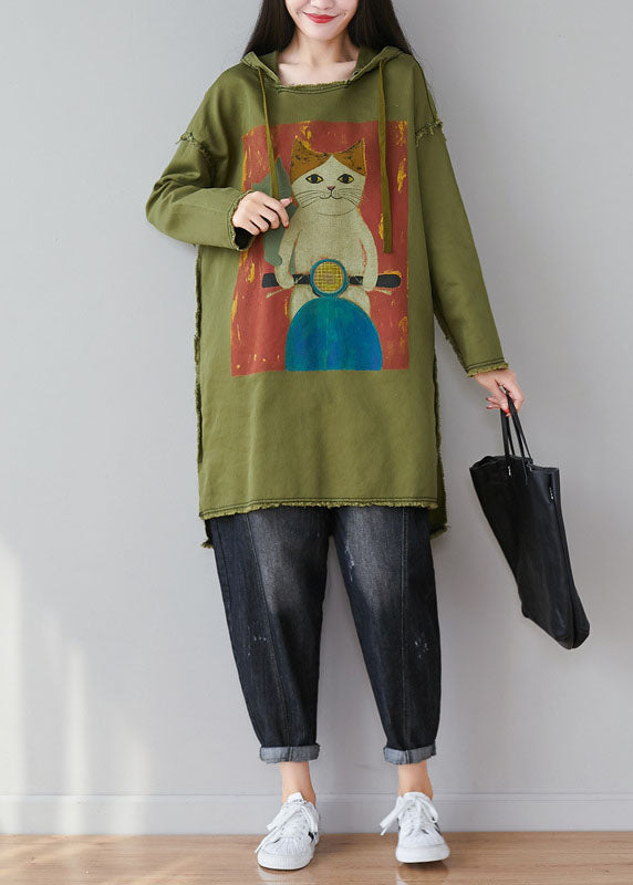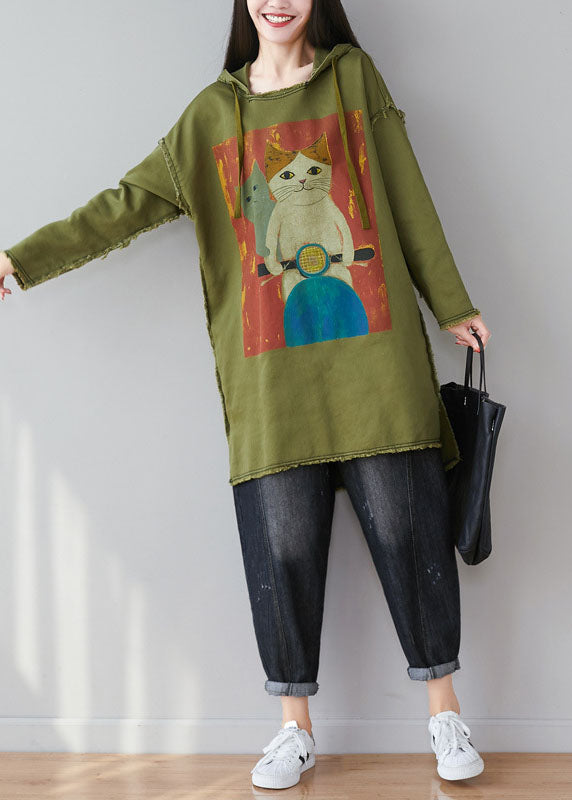 Green Patchwork Cartoon Print Cotton Tops Hooded Spring