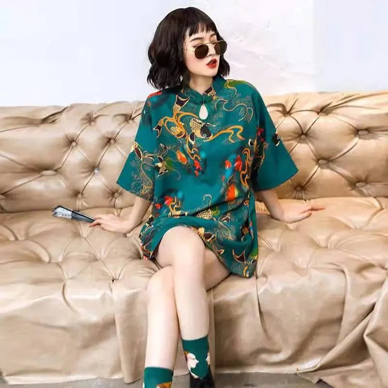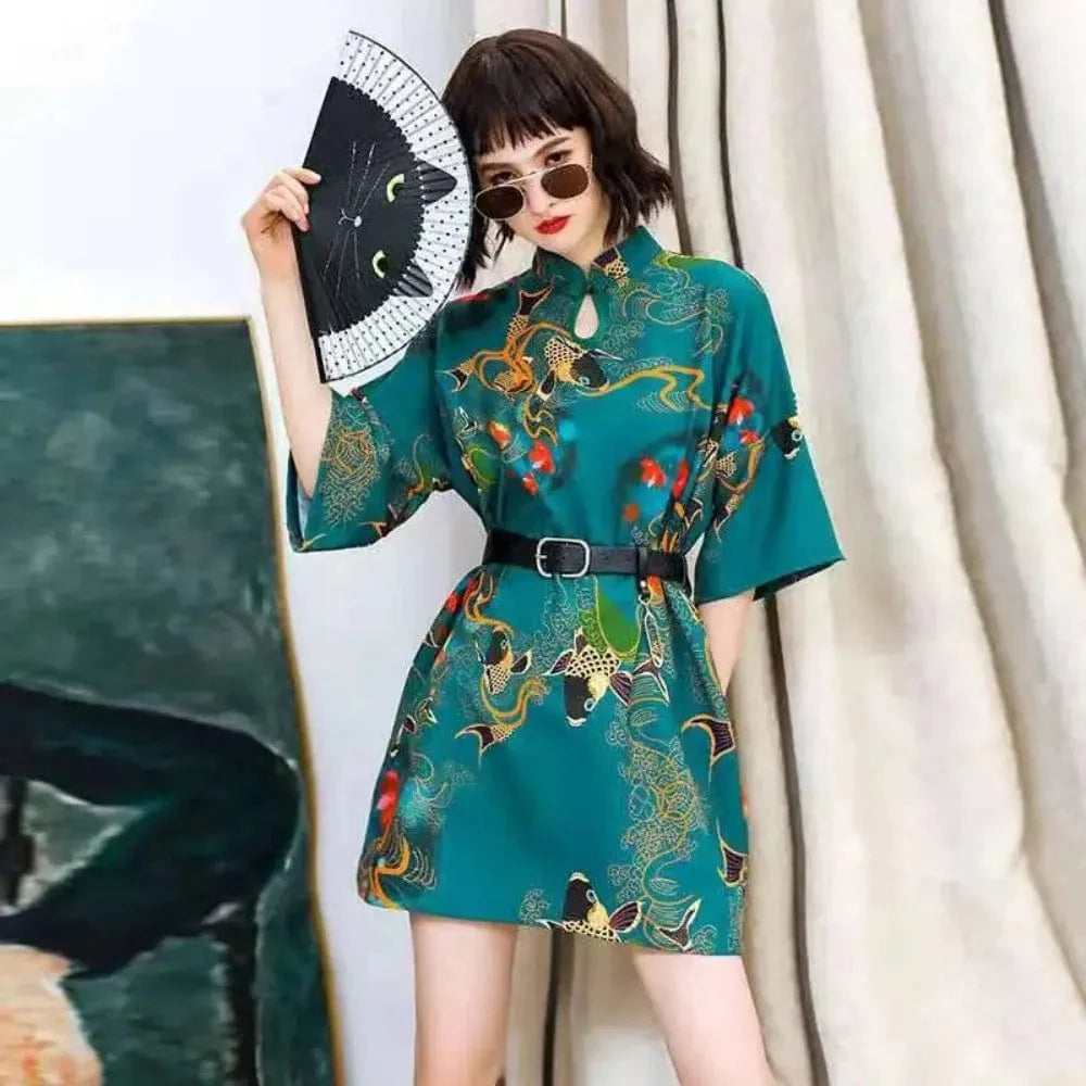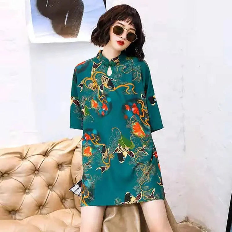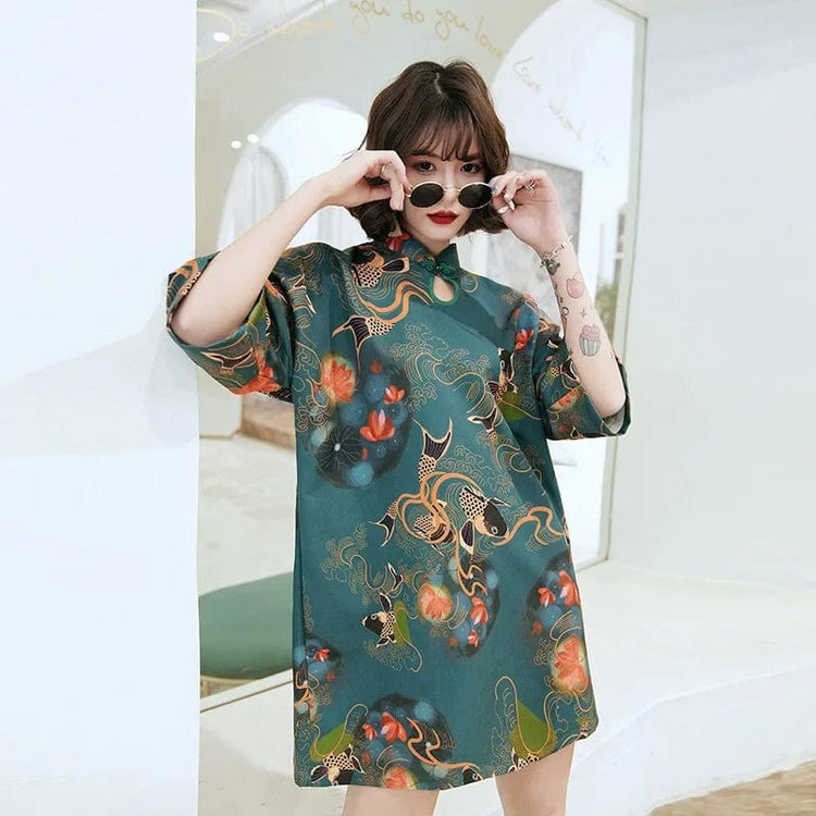 Green Tranquil Jade Carp Cheongsam Dress Half Sleeve