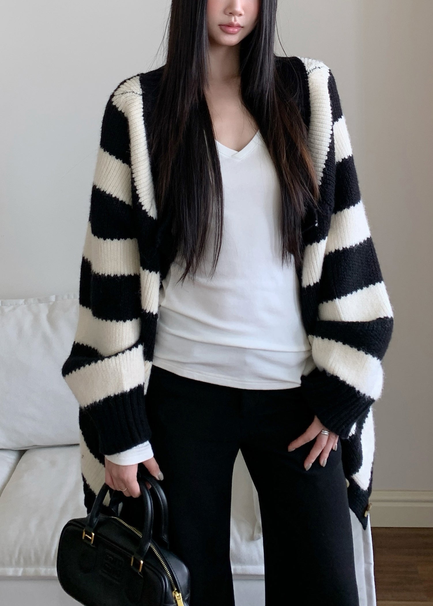 French Striped V Neck Button Knitted Cotto Cardigan Fall