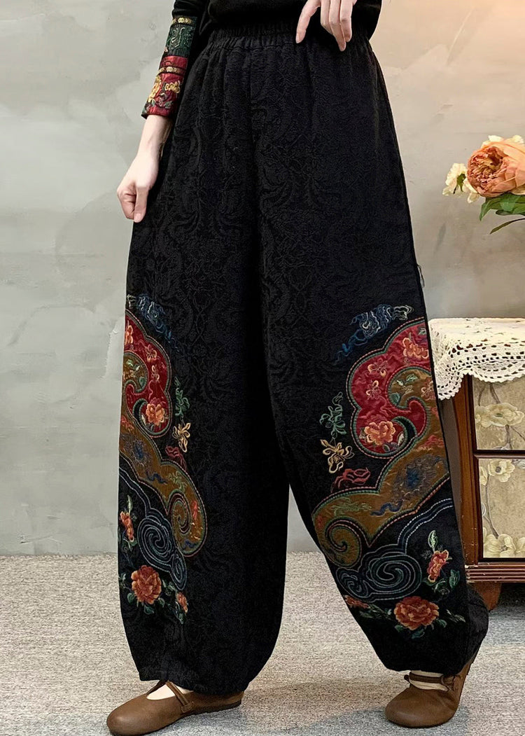 Elegant Black Embroidered Oversized Linen Pants Spring