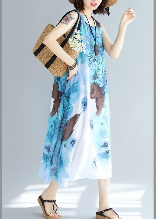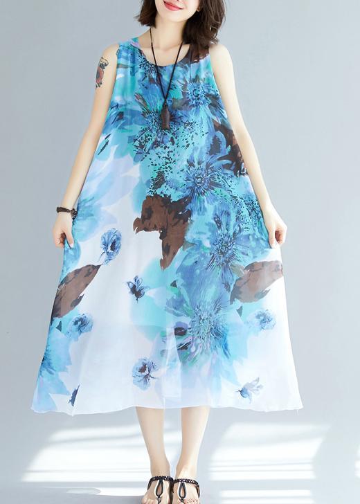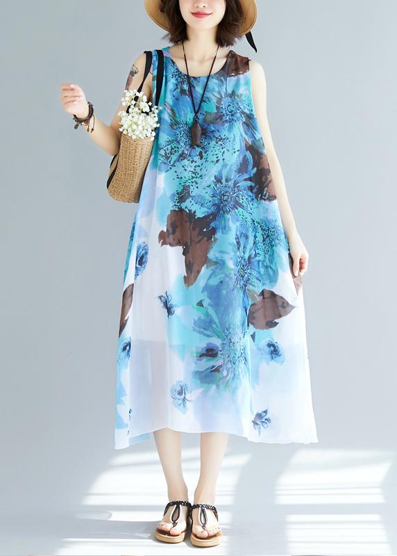 Stylish Blue Print Chiffon Sleeveless Summer Vacation Dress