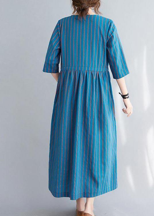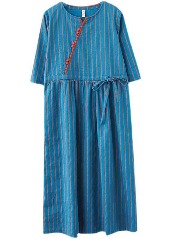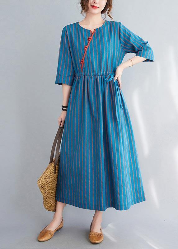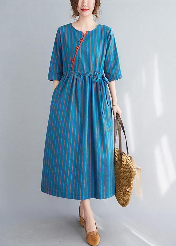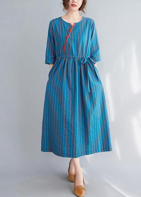 Stylish Blue Striped tie waist Long Summer Cotton Dress - Omychic
