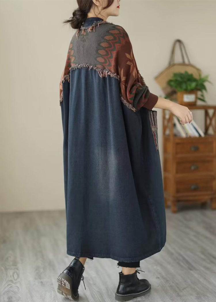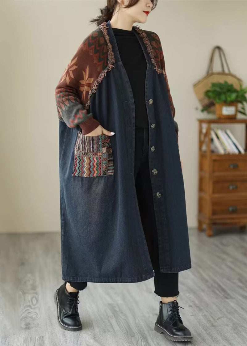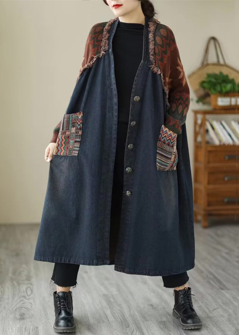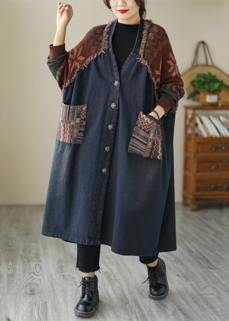 Blue Pockets Patchwork Denim Long Coats V Neck Fall