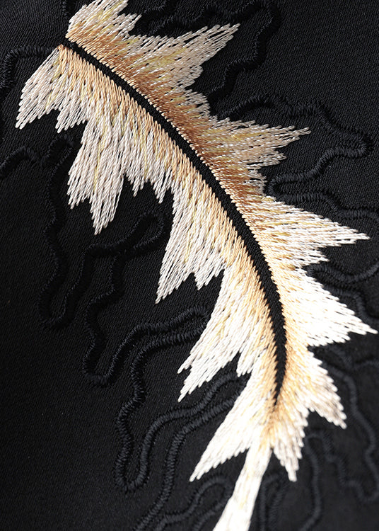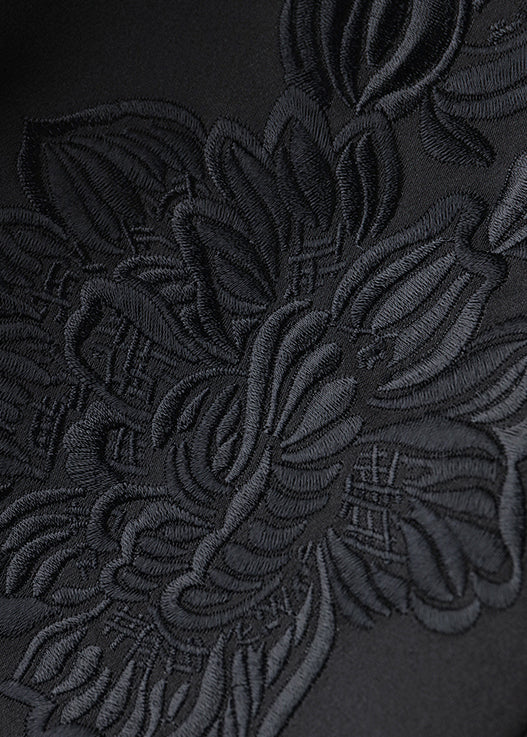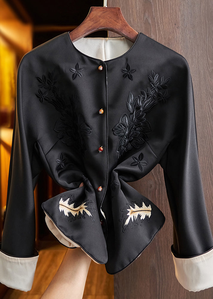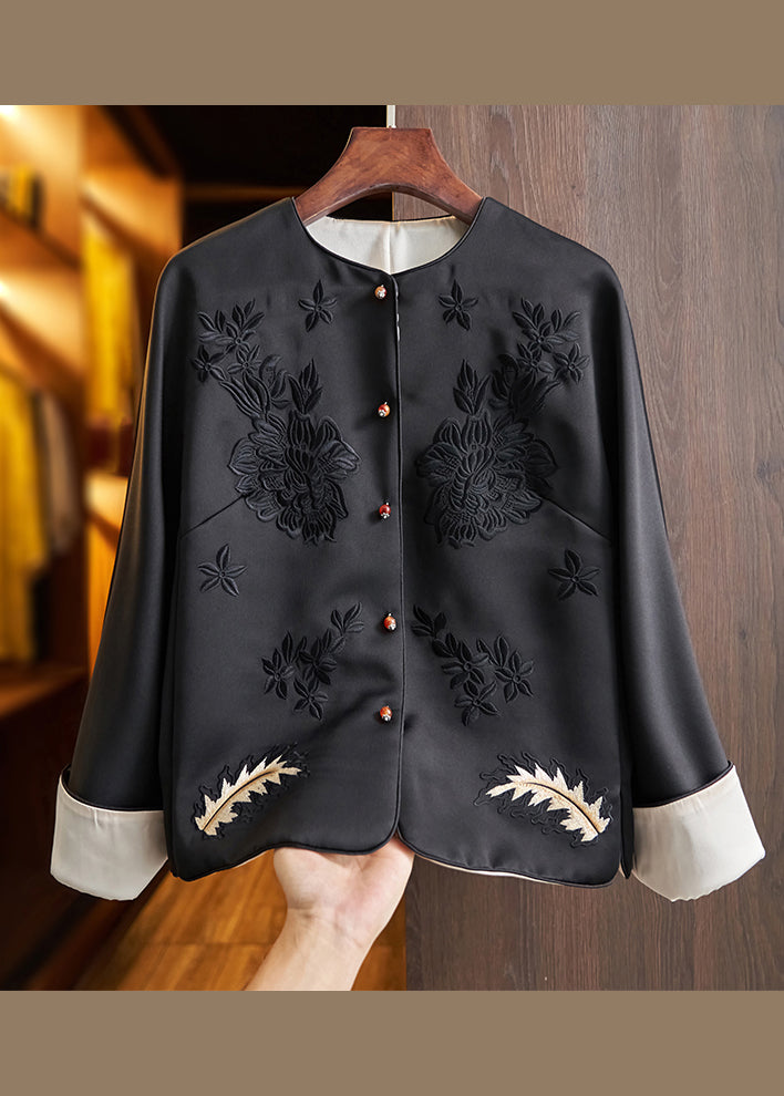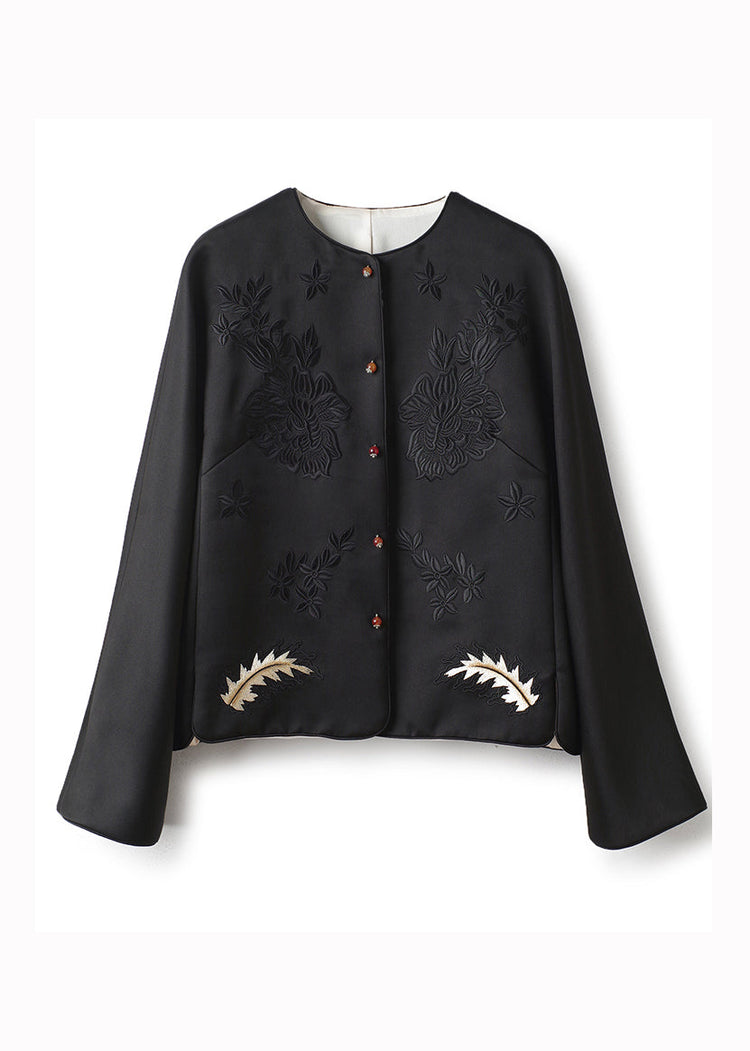 Boutique Black O-Neck Embroidered Patchwork Silk Coats Fall