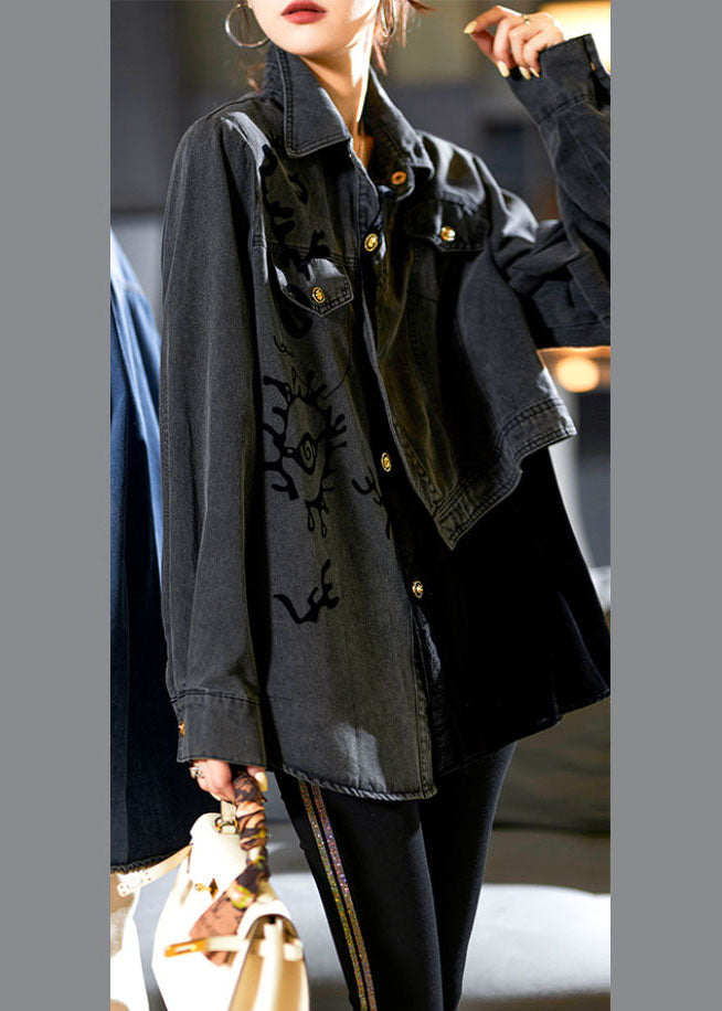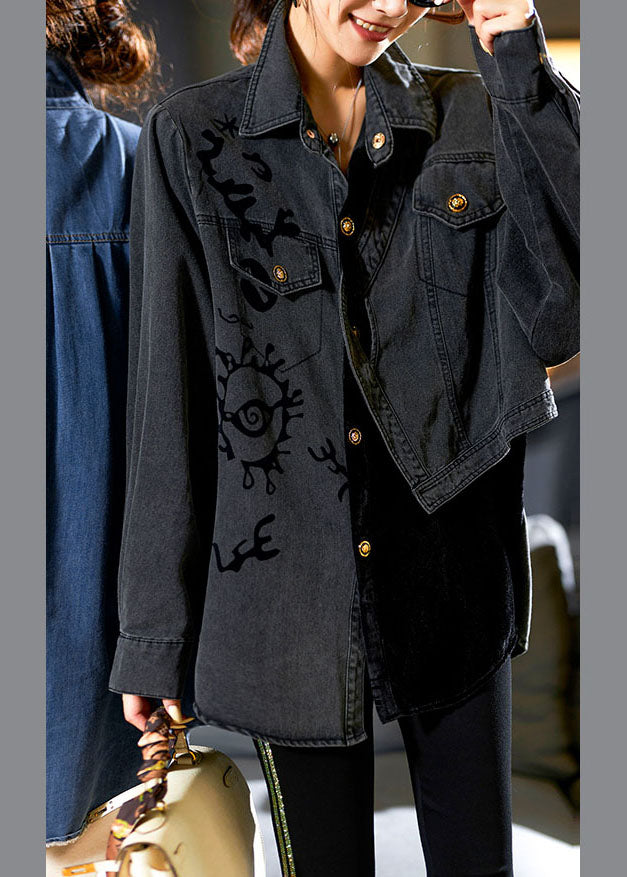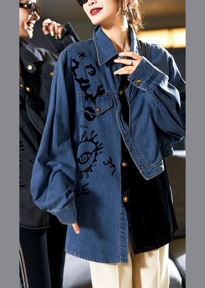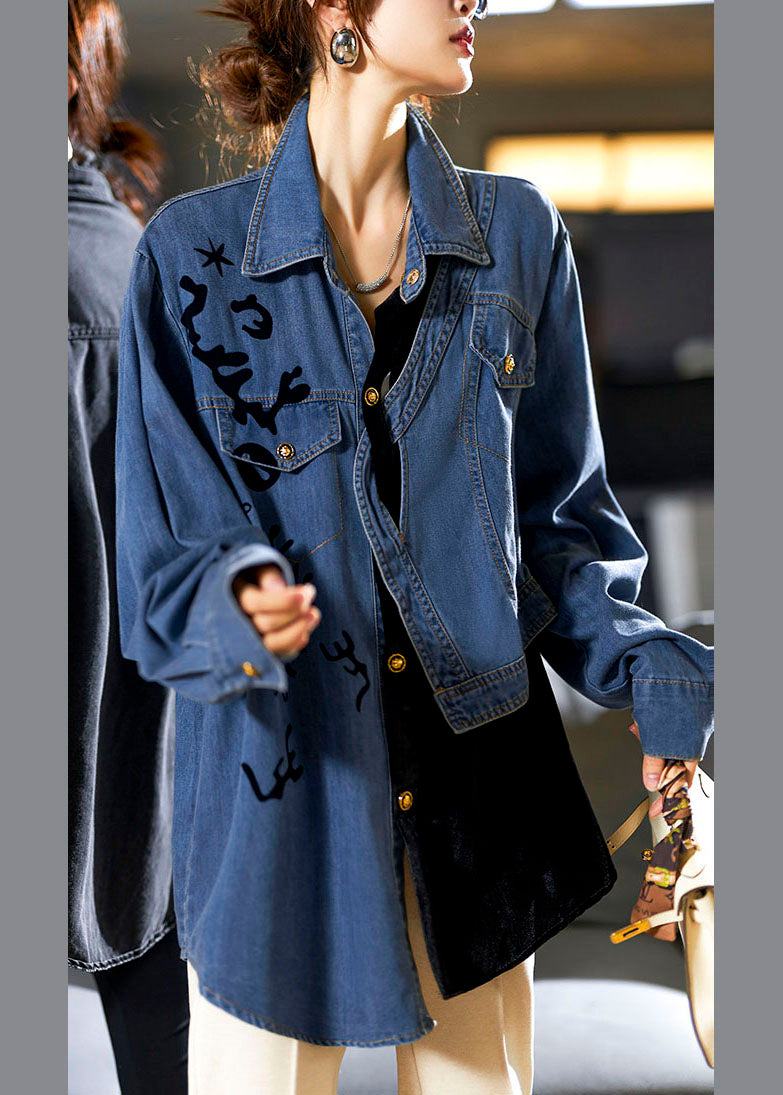 Casual Denim Blue Peter Pan Collar Asymmetrical Print Button Cotton Coats Long Sleeve