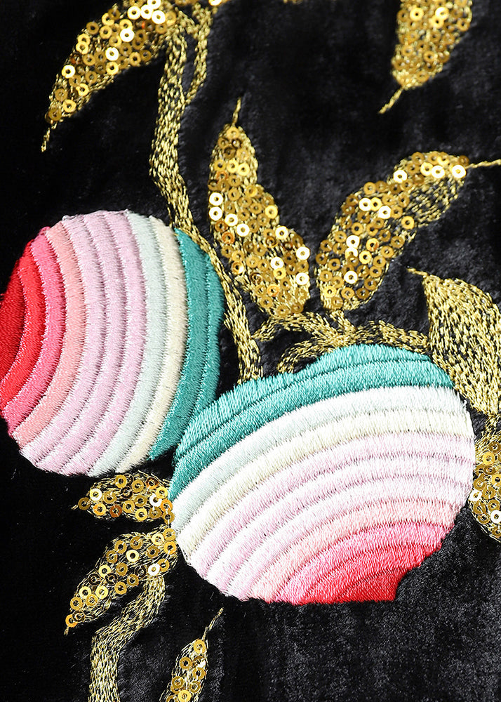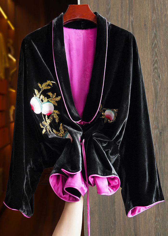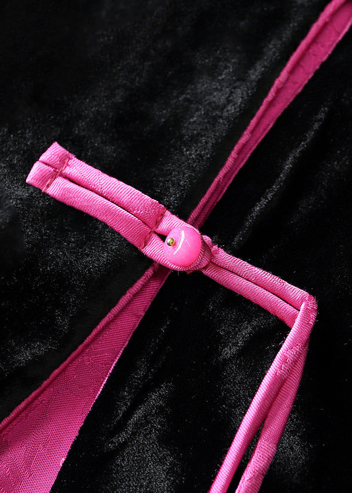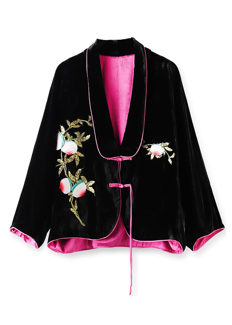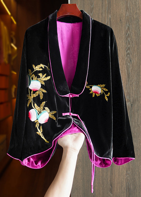 Chic Black Chinese Button Embroideried Silk Velour Coats Long Sleeve