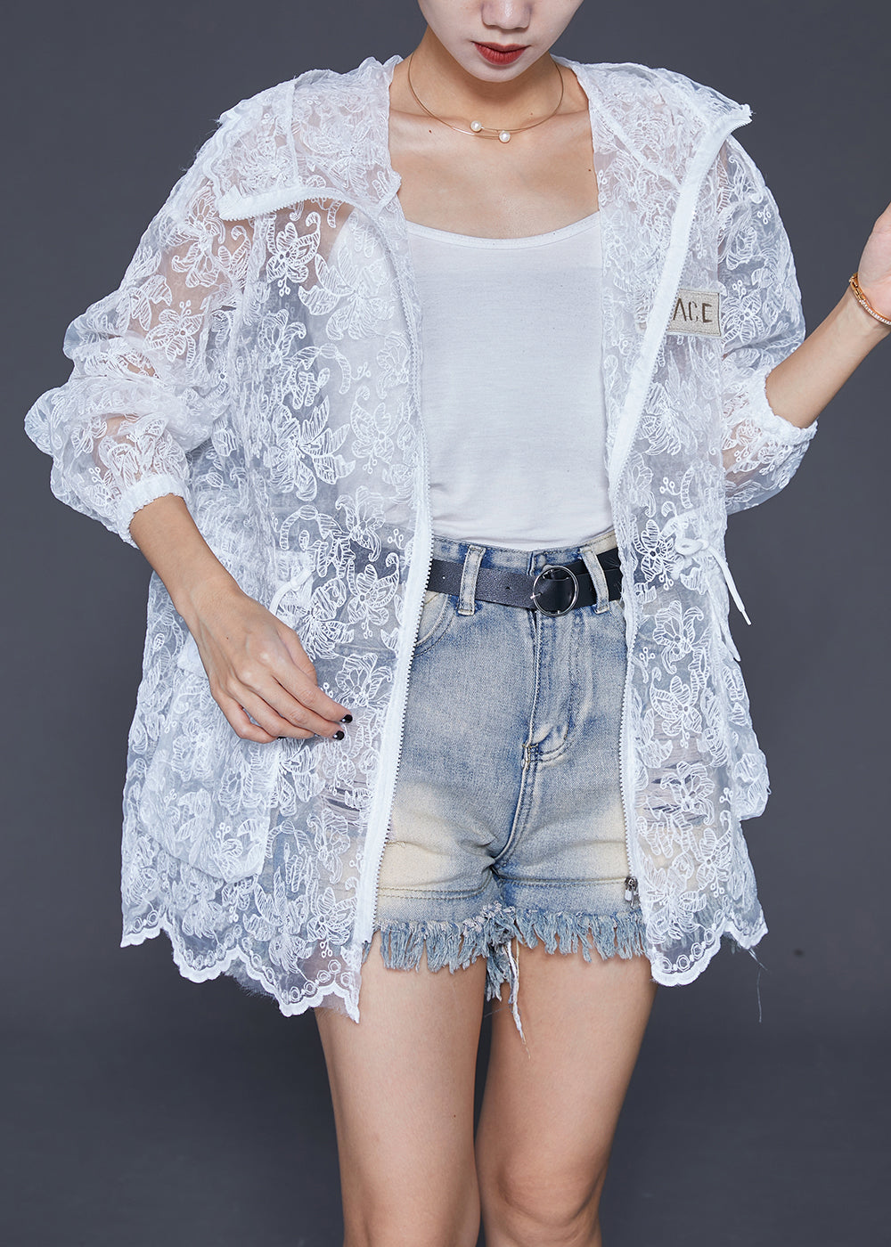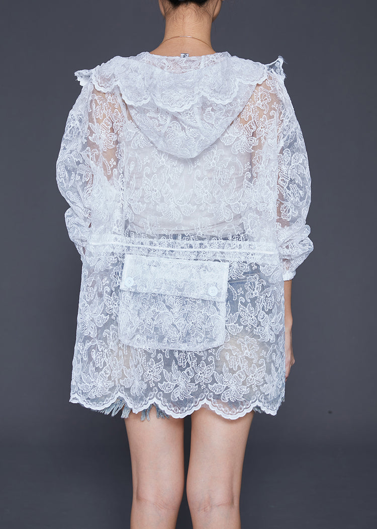 Elegant White Embroideried Drawstring Pockets Cotton Coat Outwear Fall