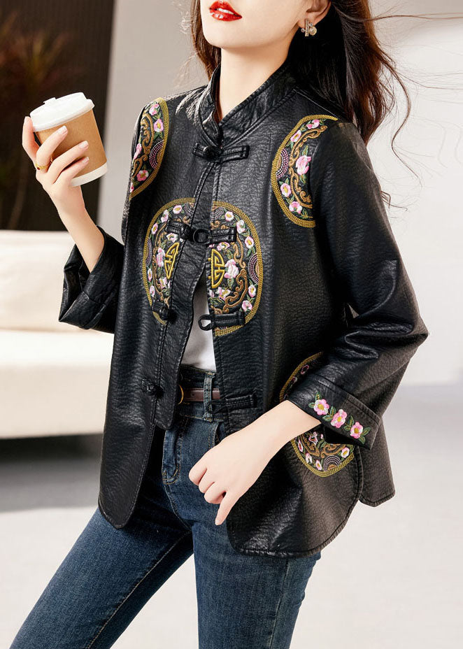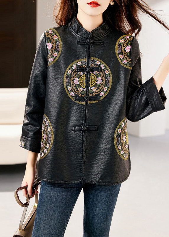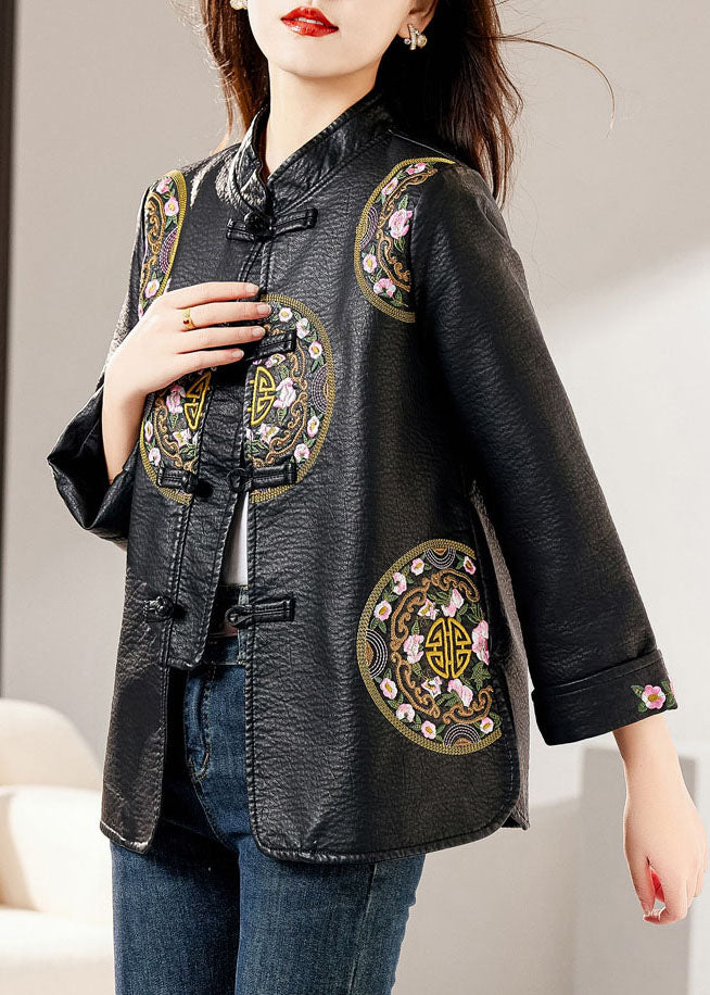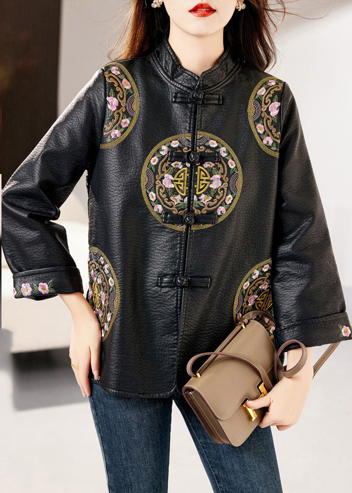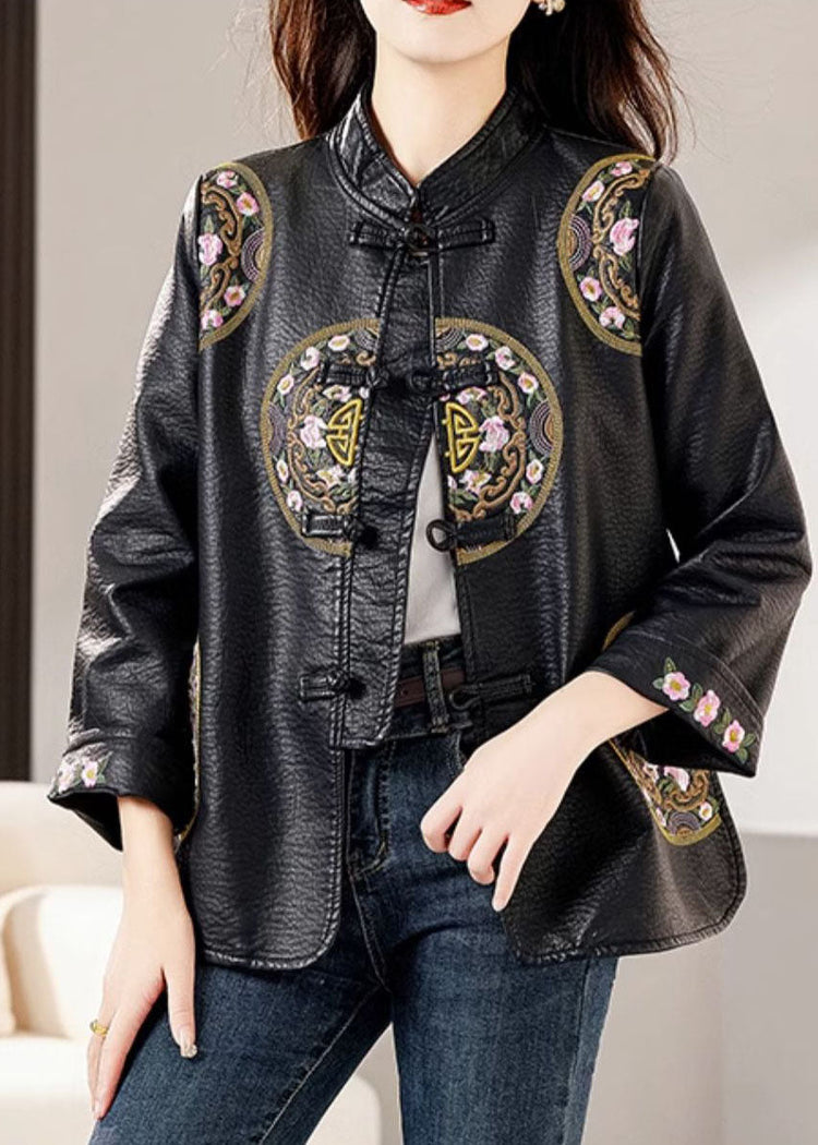 Fashion Black Stand Collar Embroideried Button Faux Leather Coats Fall