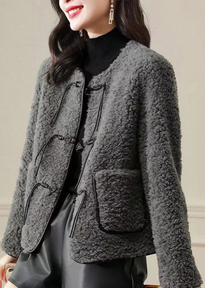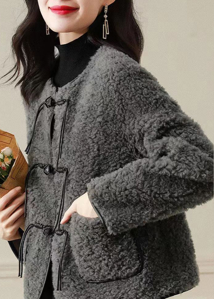 Fine Grey O Neck Tasseled Button Patchwork Wool Coats Winter