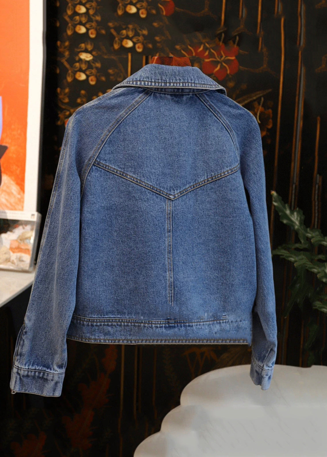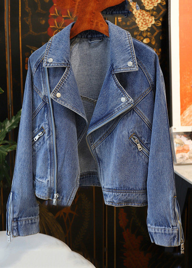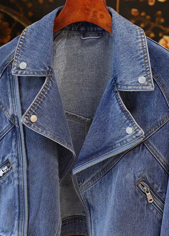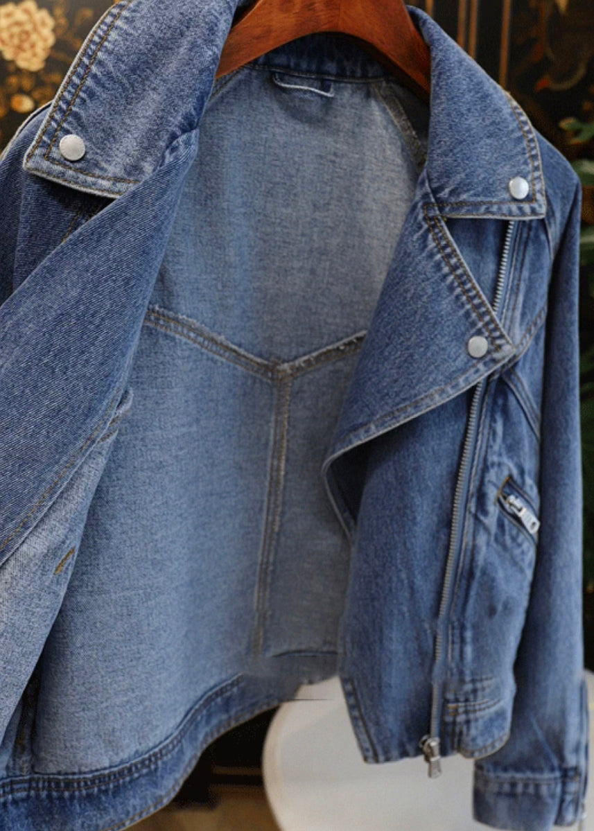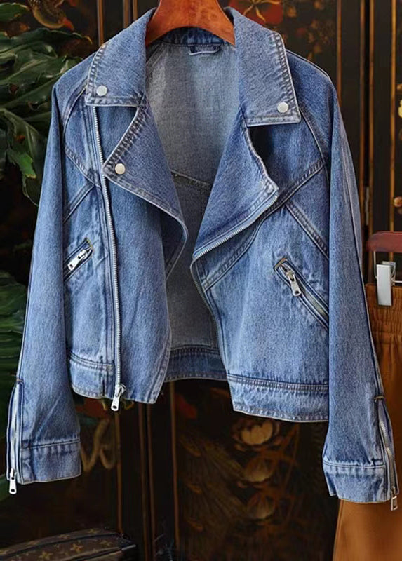 French Blue Peter Pan Collar Zip Up Patchwork Denim Coat Fall