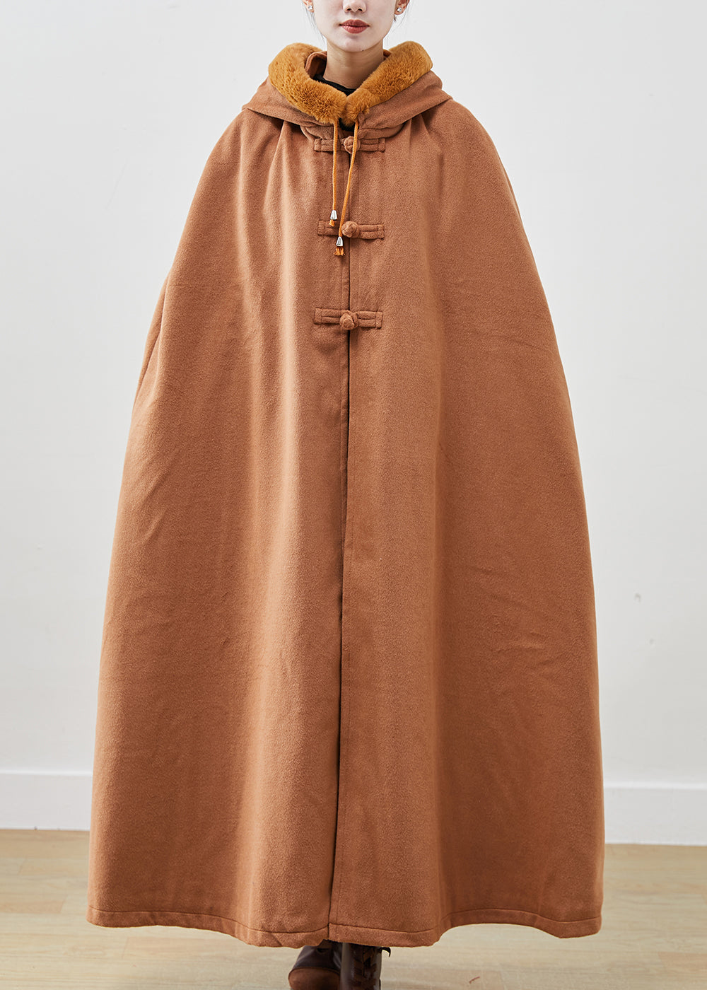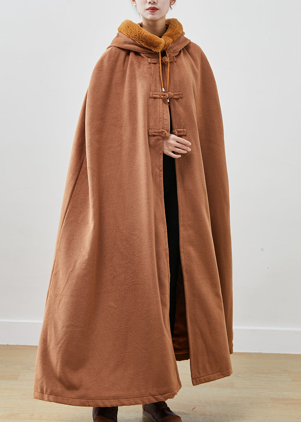 French Khaki Fur Collar Oversized Warm Fleece Hoodie Coat Cloak Sleeves