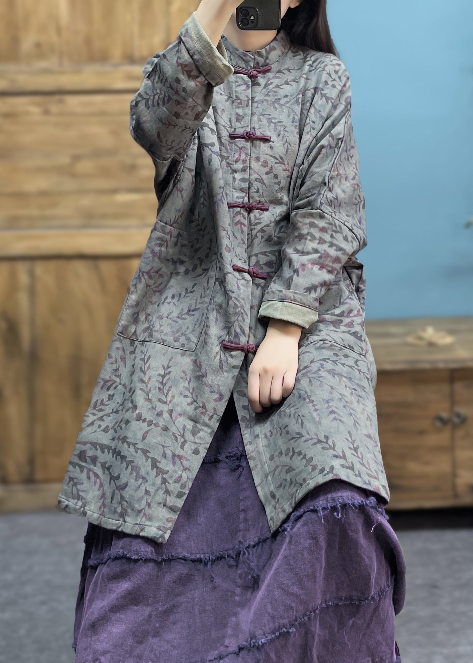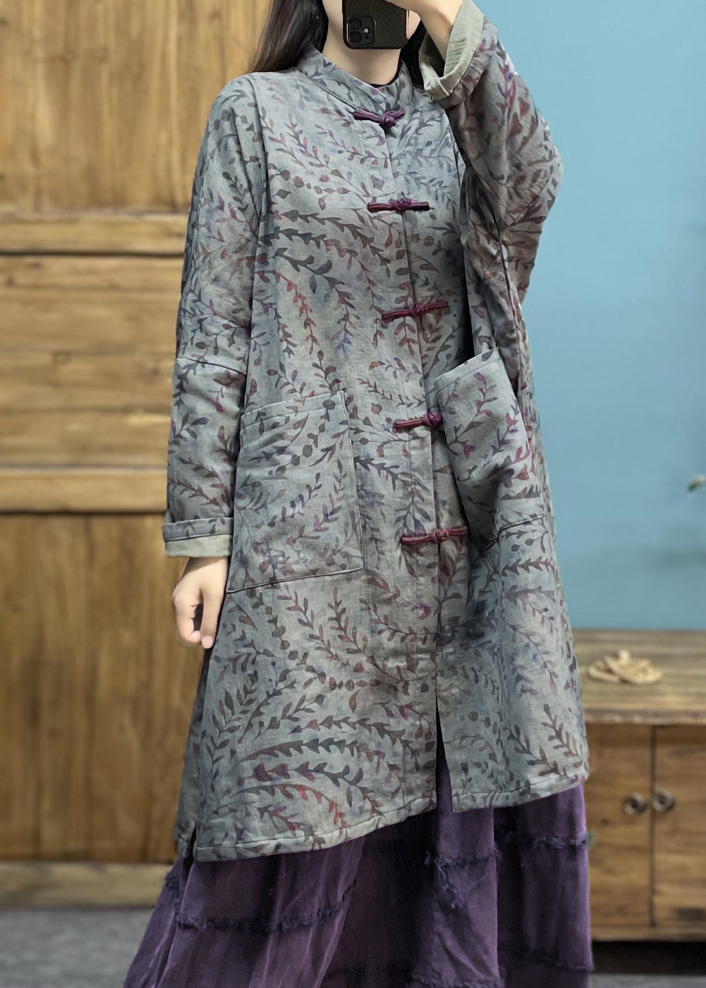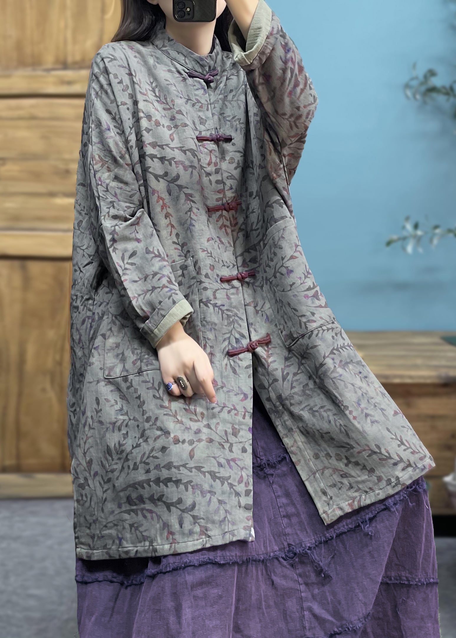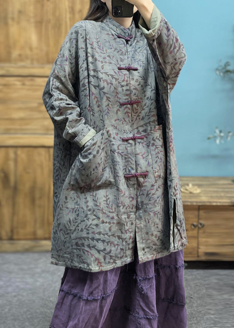 Grey Print Patchwork Linen Coat Stand Collar Spring