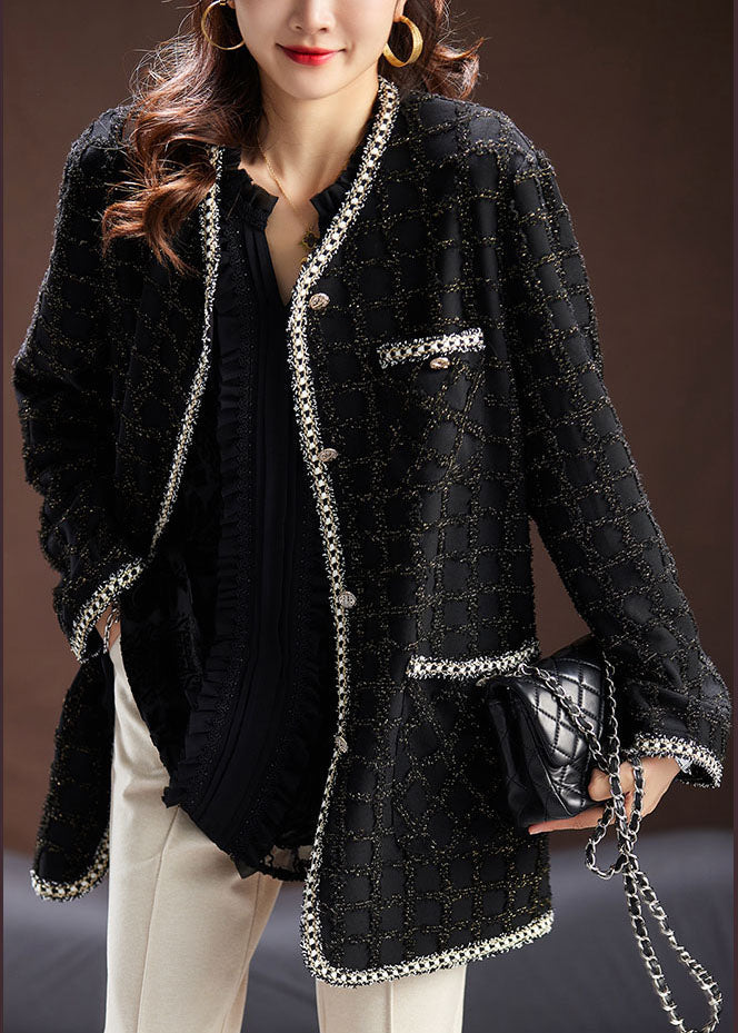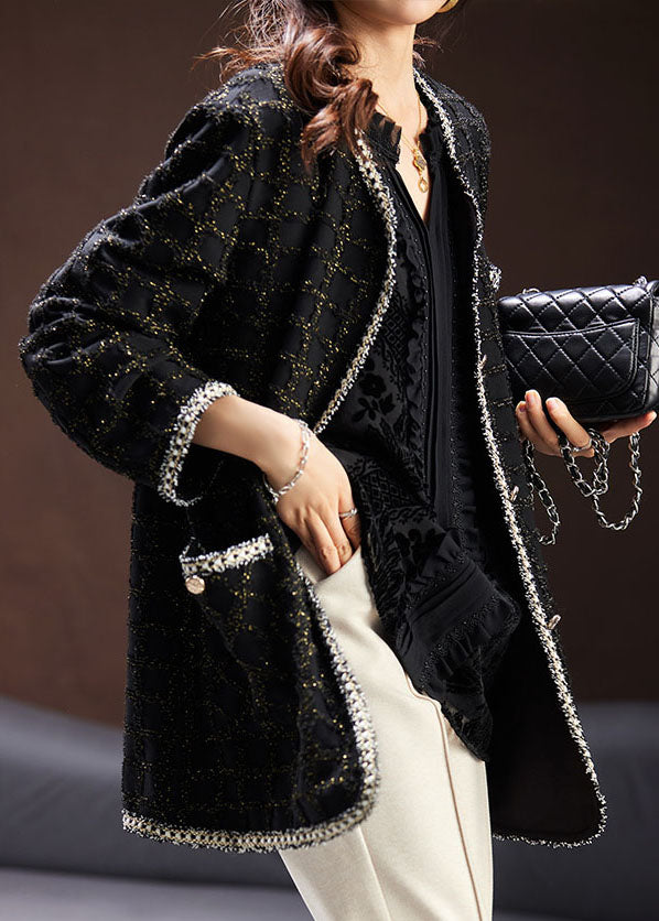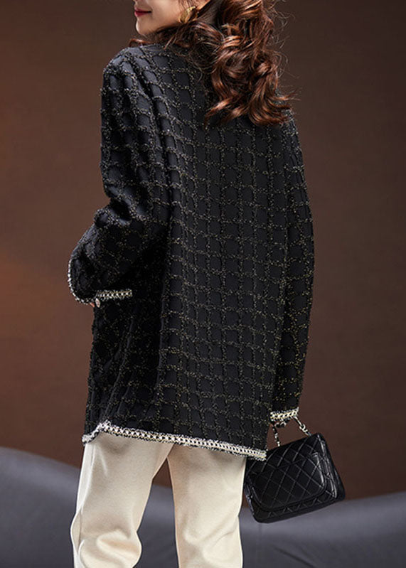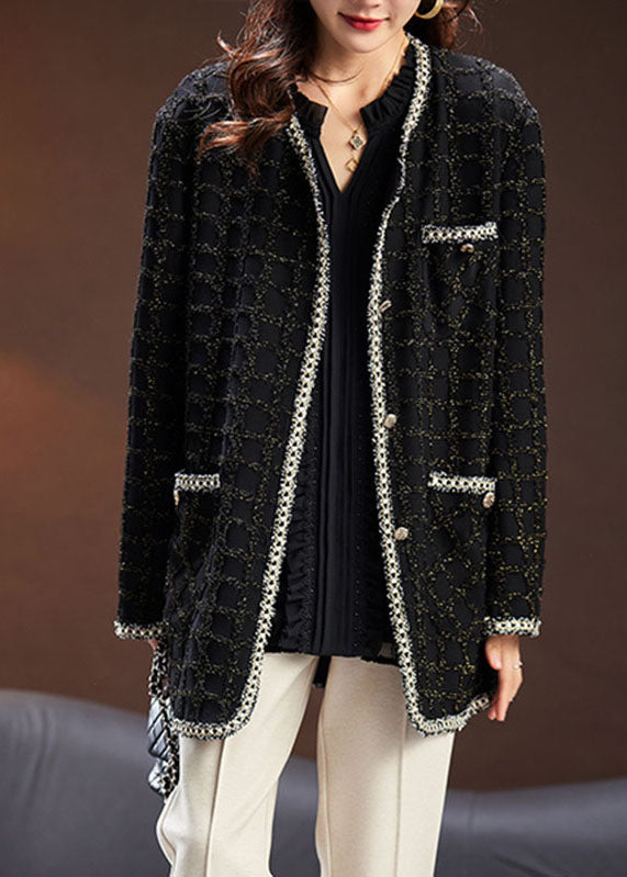 Handmade Black O-Neck Pockets Plaid Patchwork Knit Coats Long Sleeve