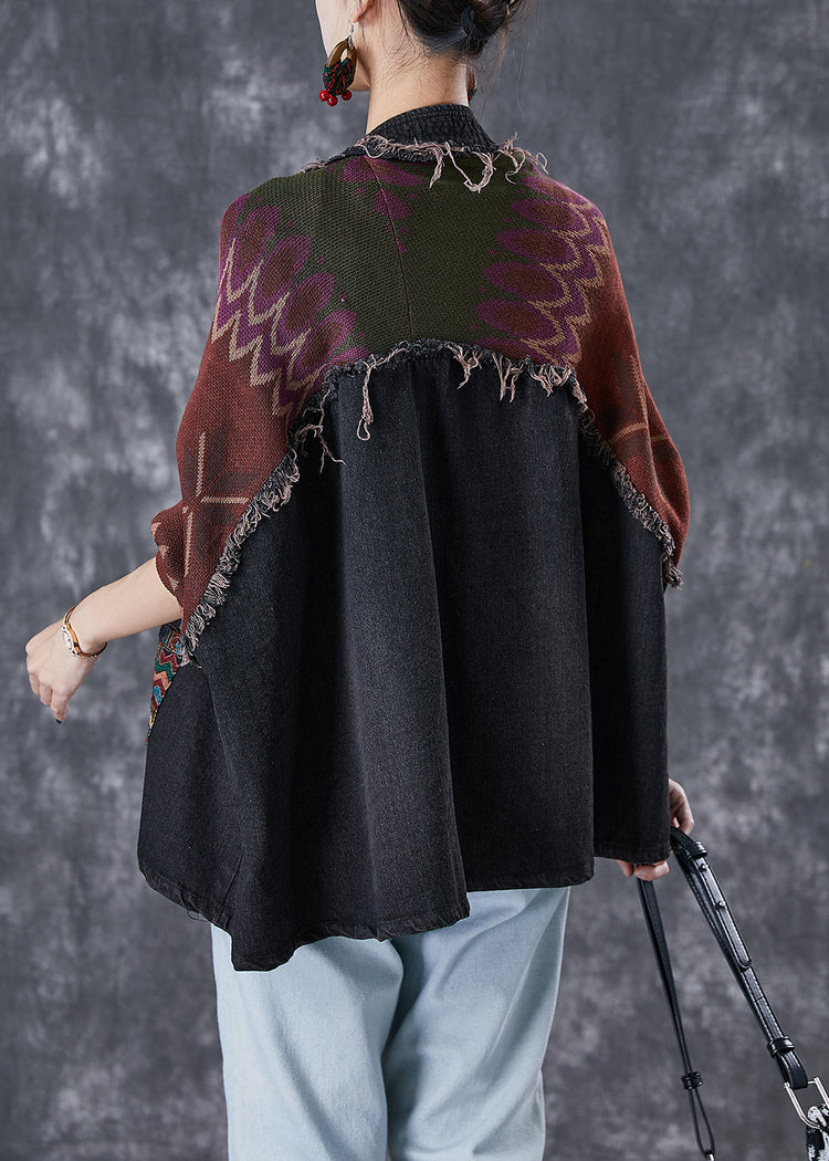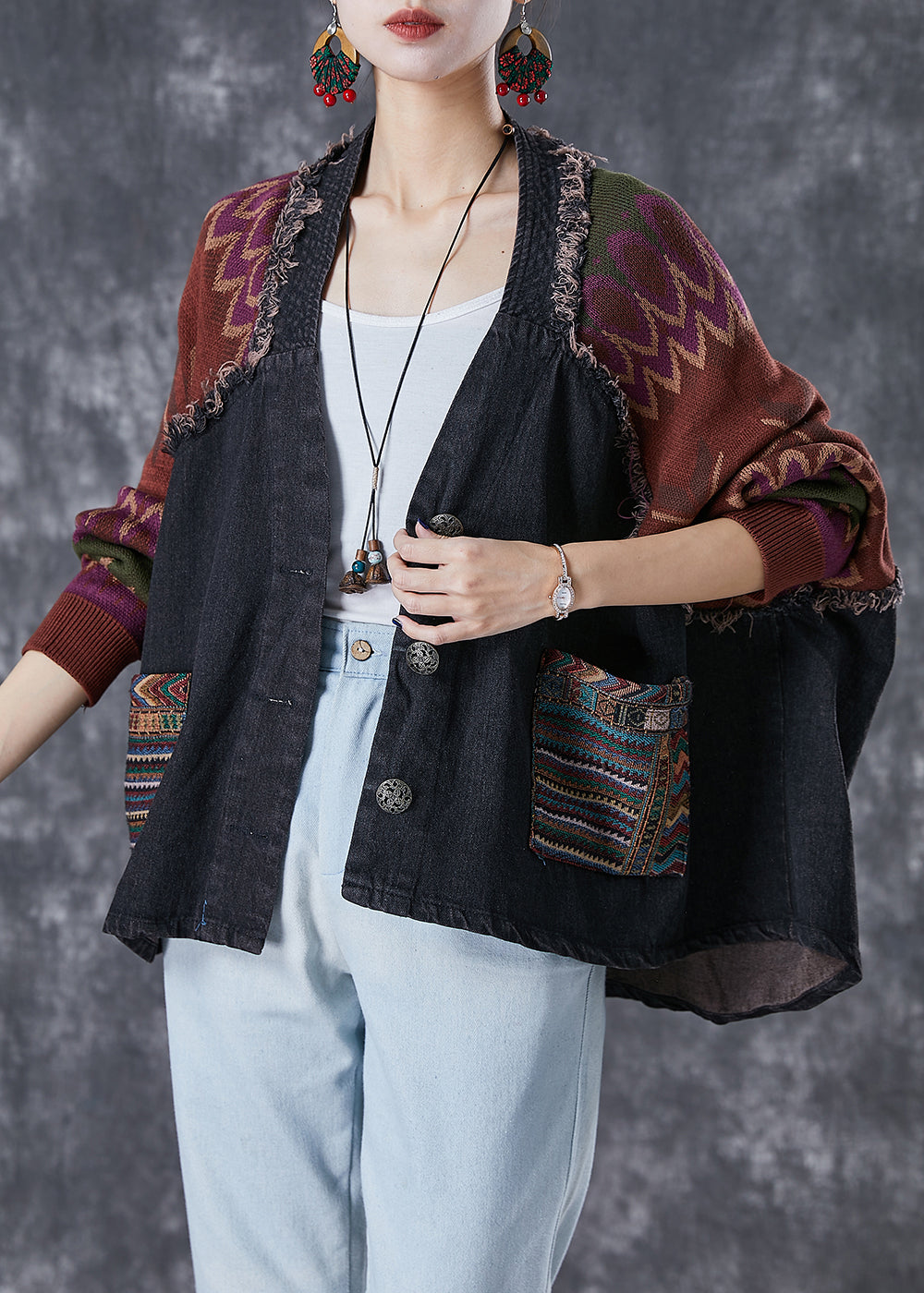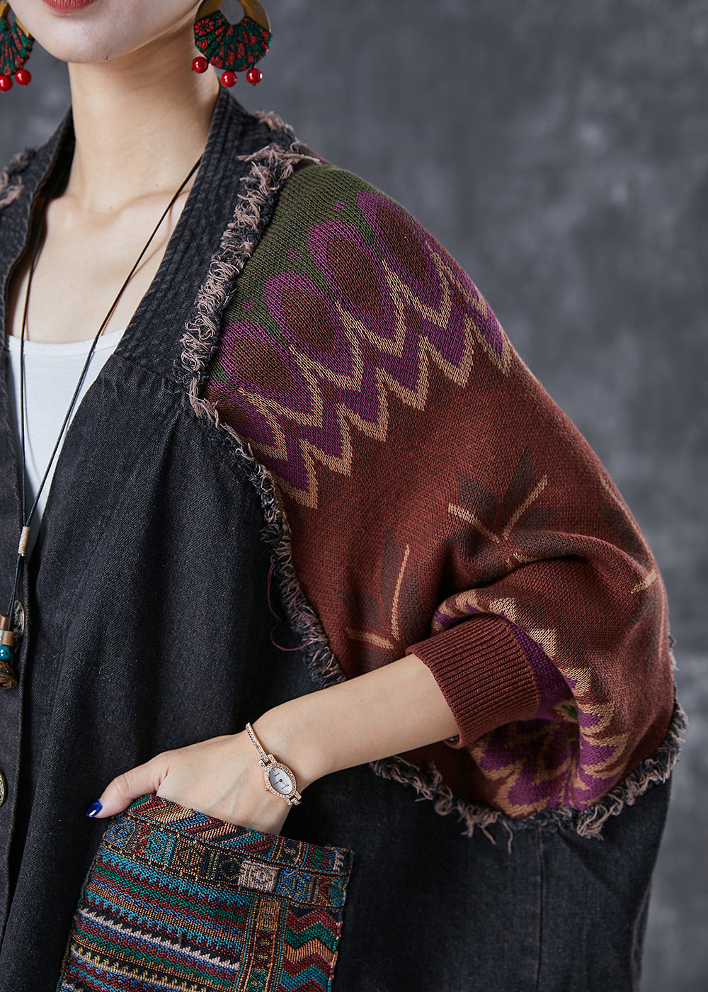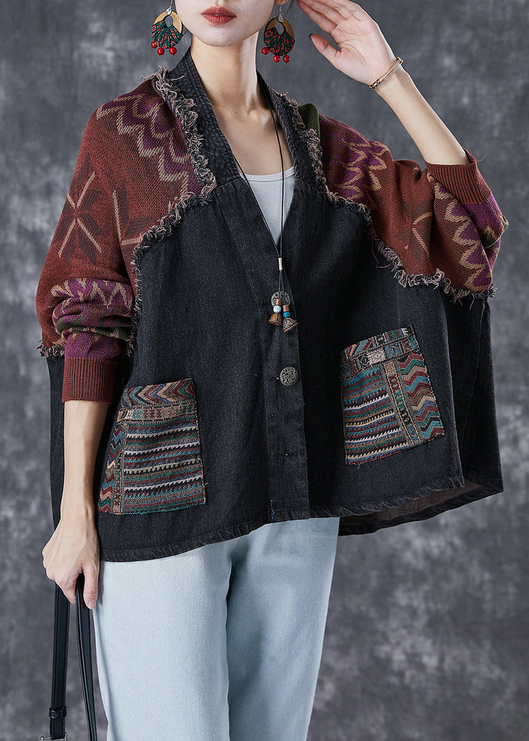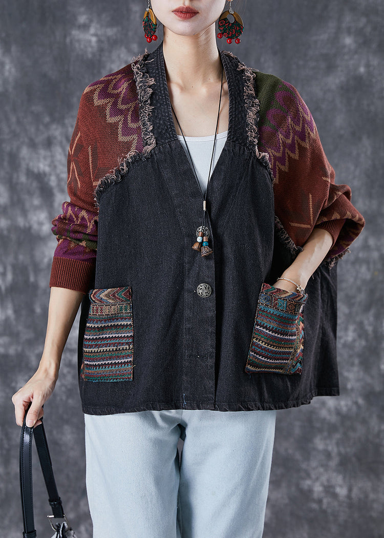 Handmade Black Oversized Patchwork Knit Denim Jackets Fall