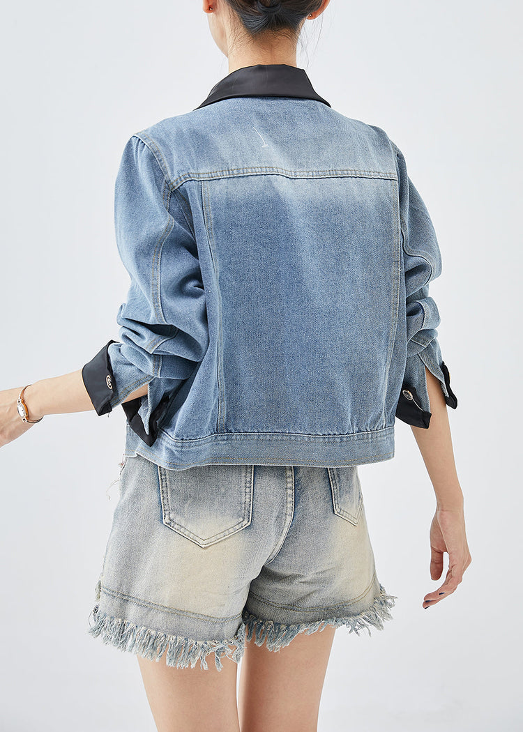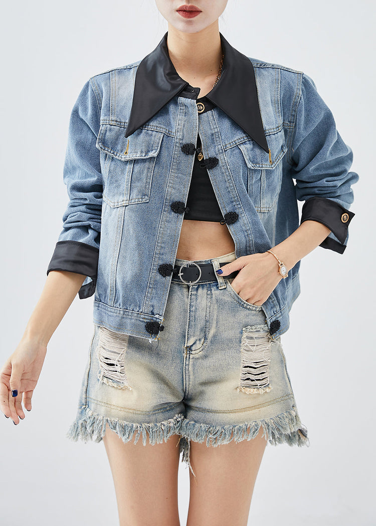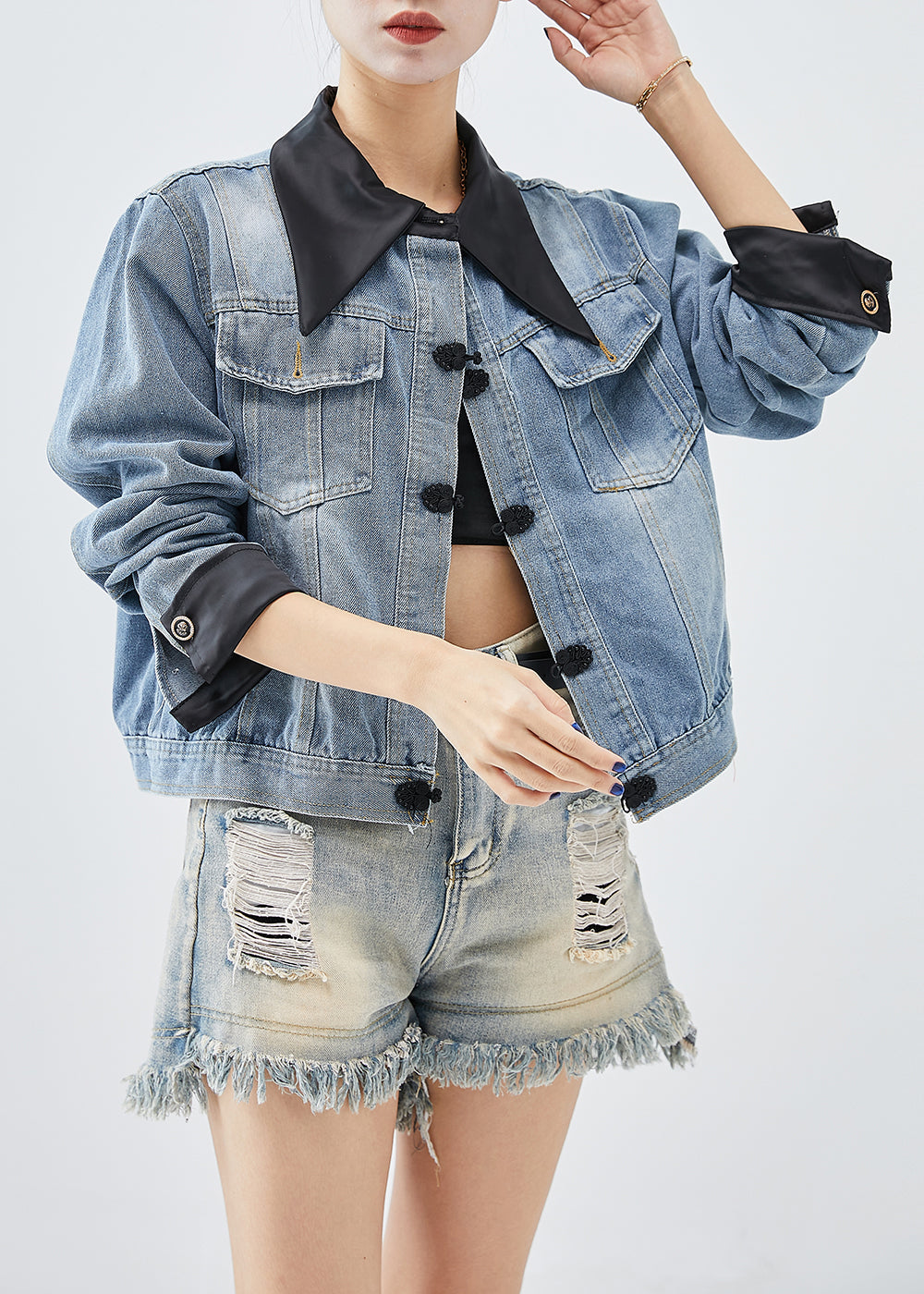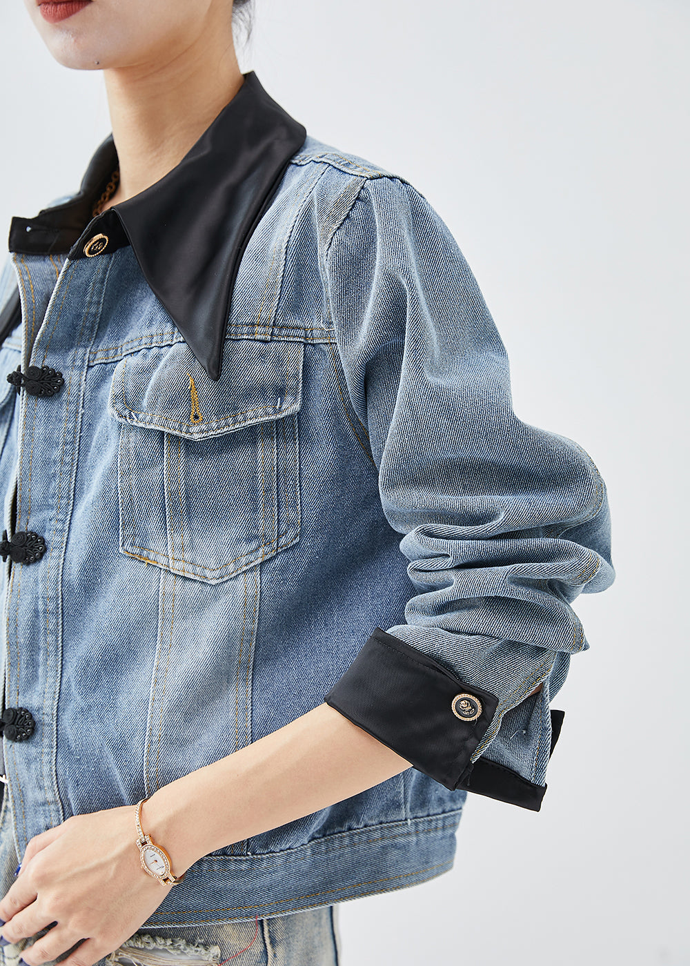 Italian Blue Peter Pan Collar Patchwork Chinese Button Denim Jacket Fall