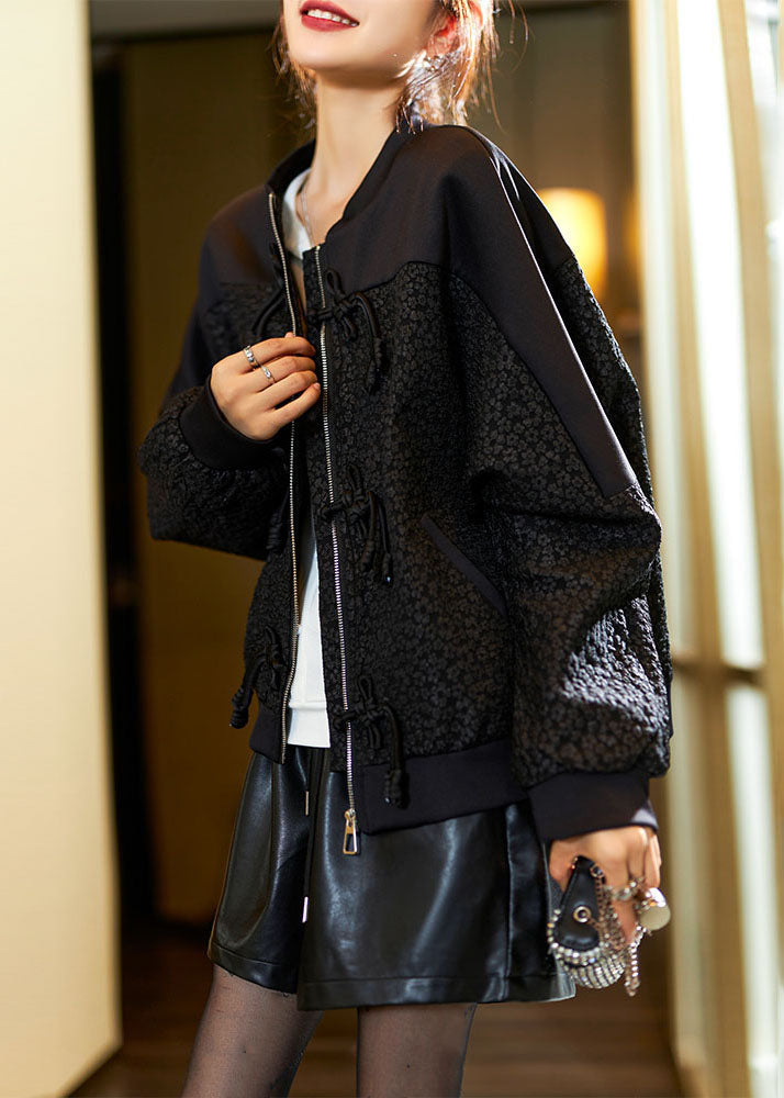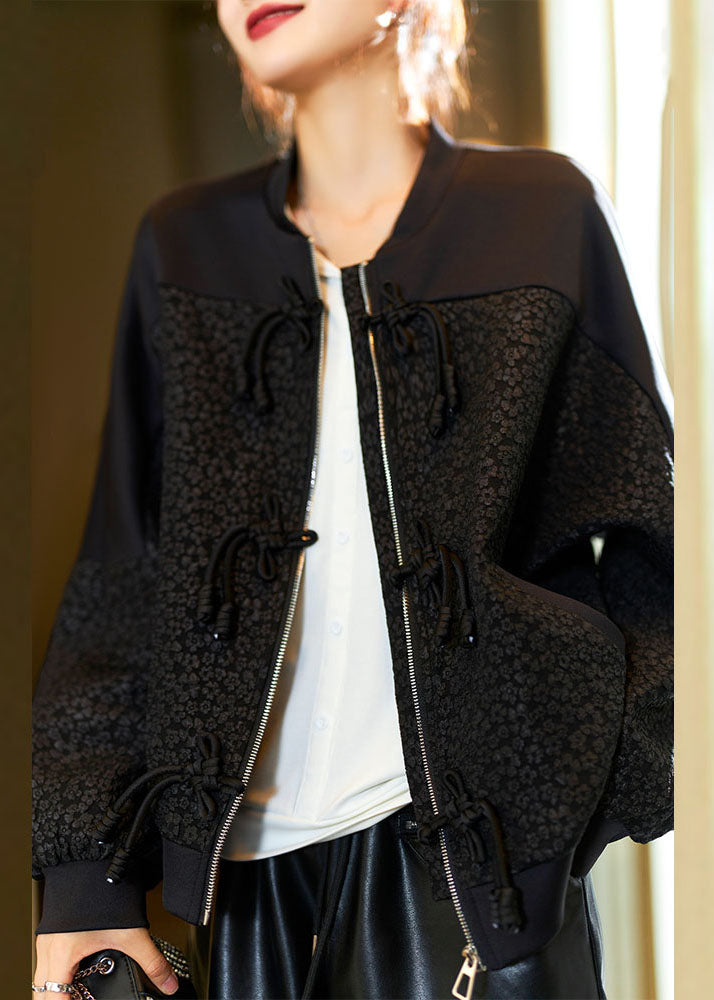 Jacquard Black O-Neck Zippered Pockets Coats Fall