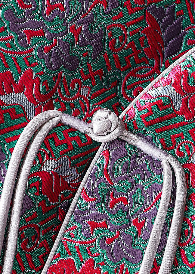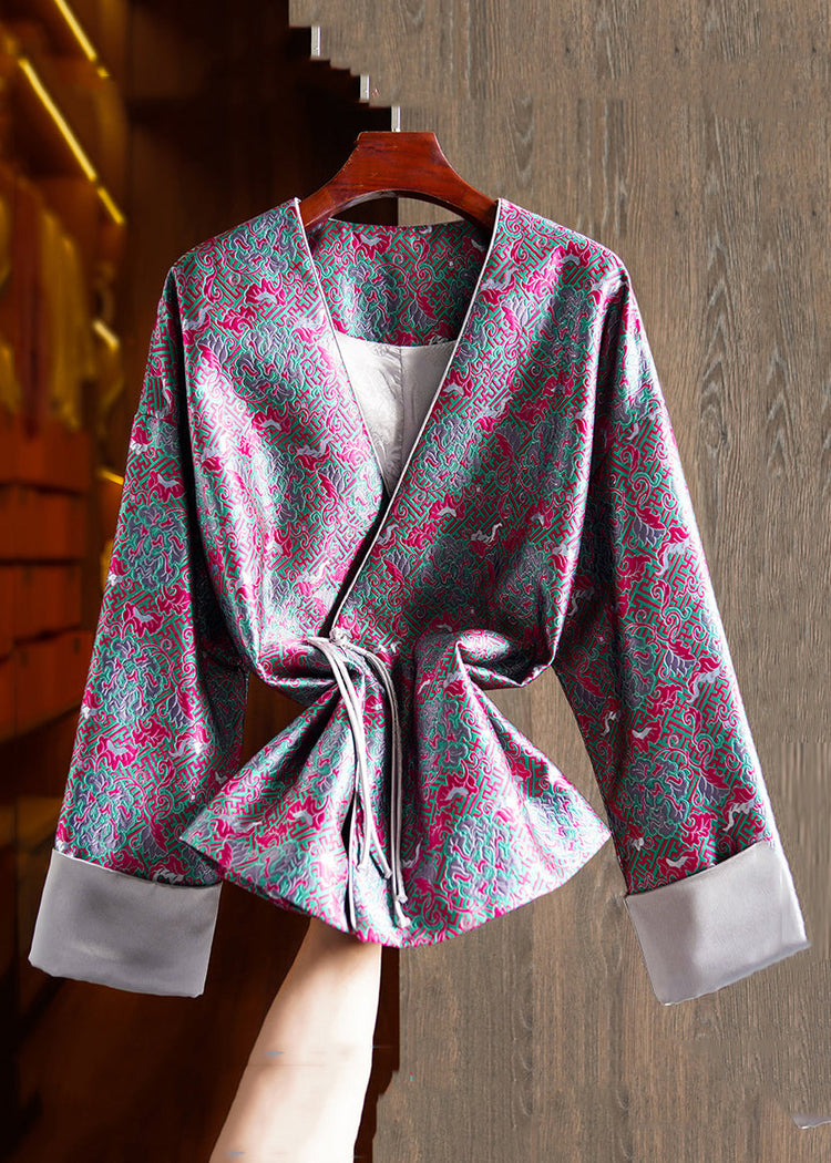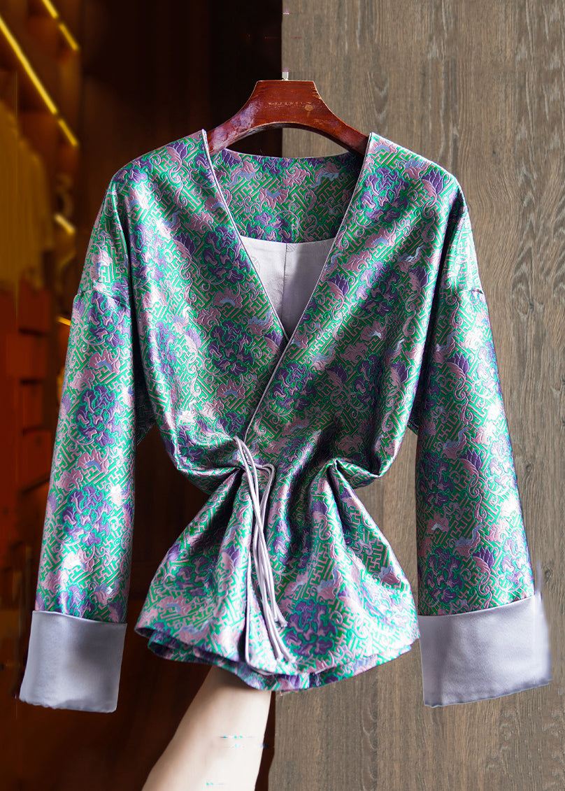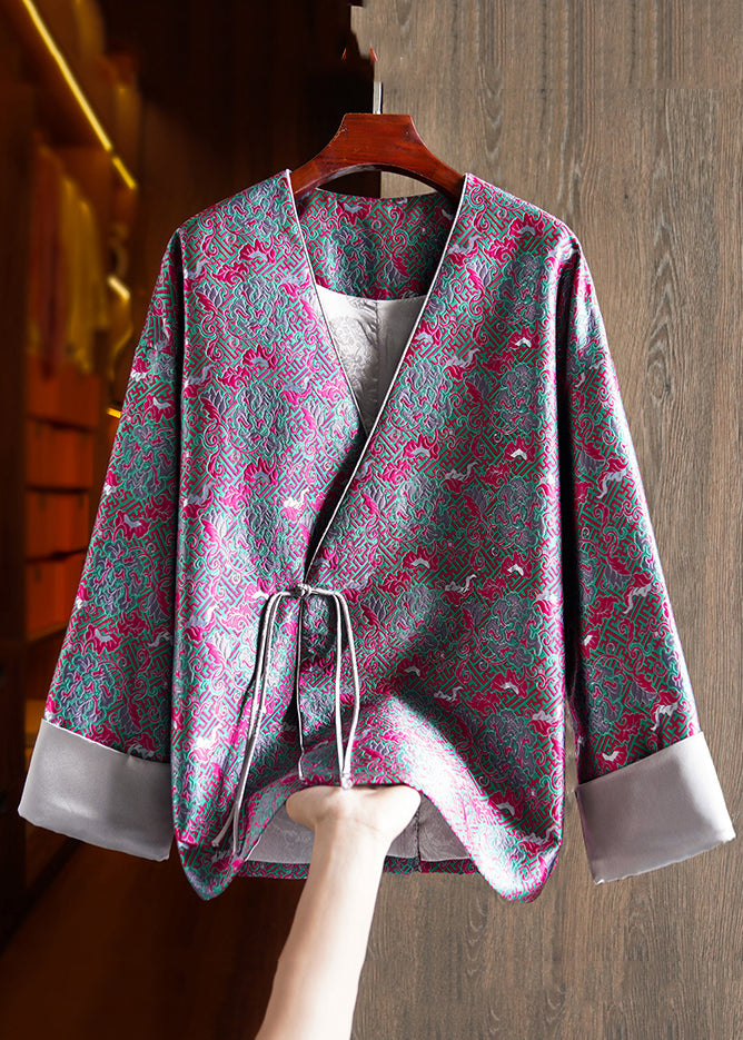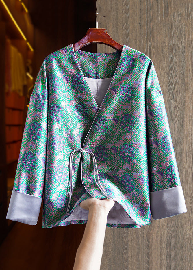 Jacquard Green V Neck Chinese Button Patchwork Silk Coats Long Sleeve