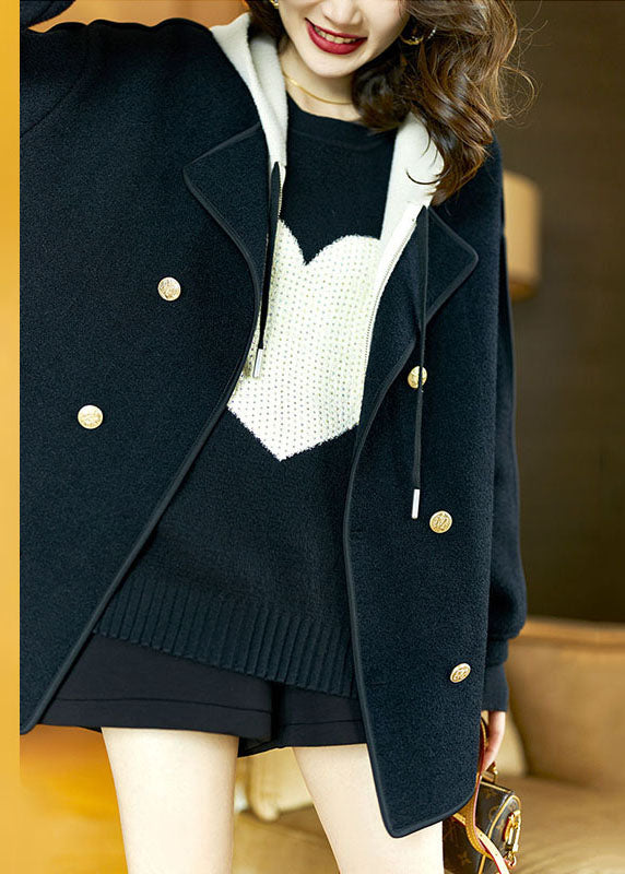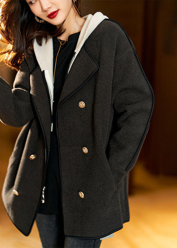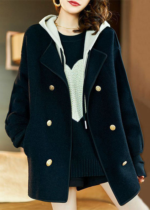 Loose Black Drawstring Patchwork Pockets Woolen Hooded Coats Long Sleeve