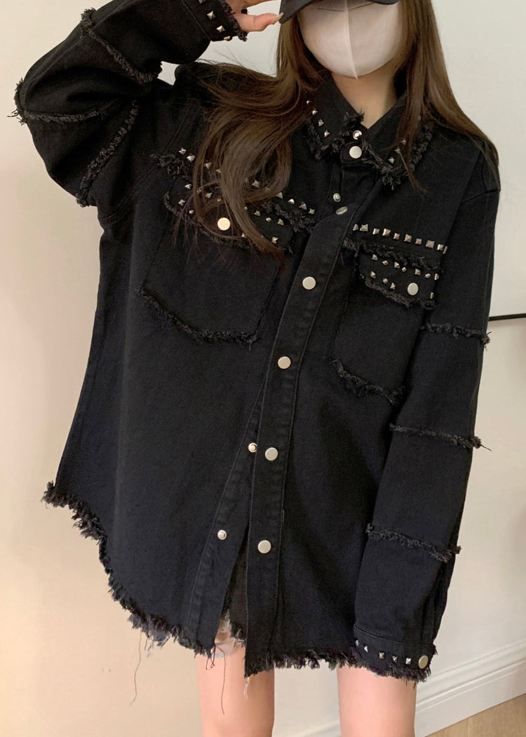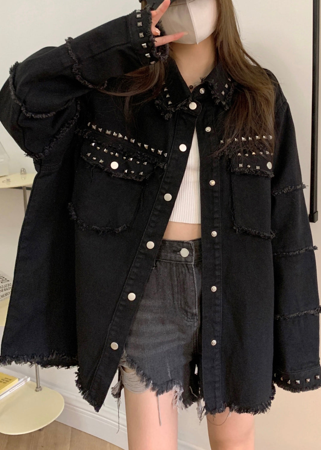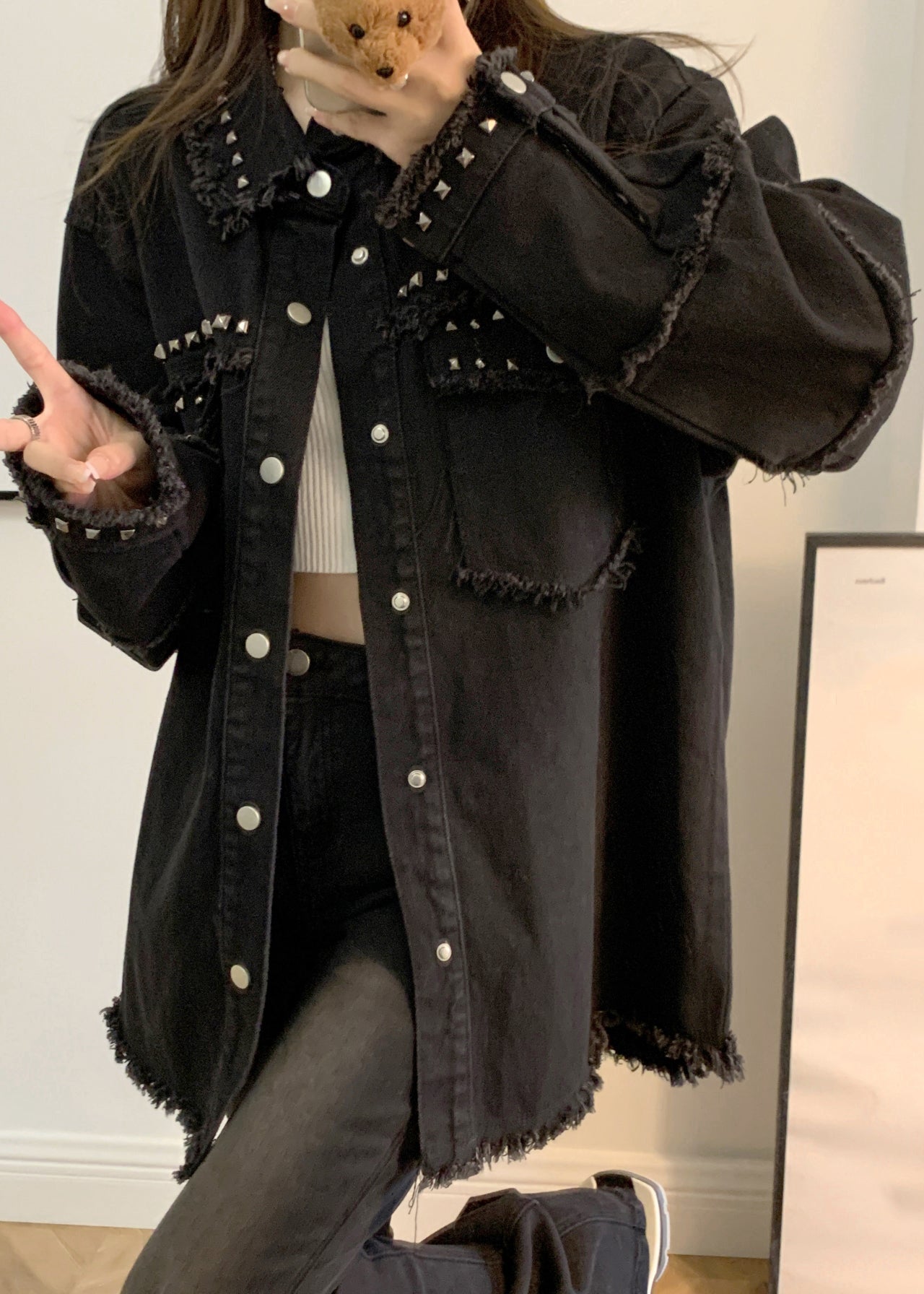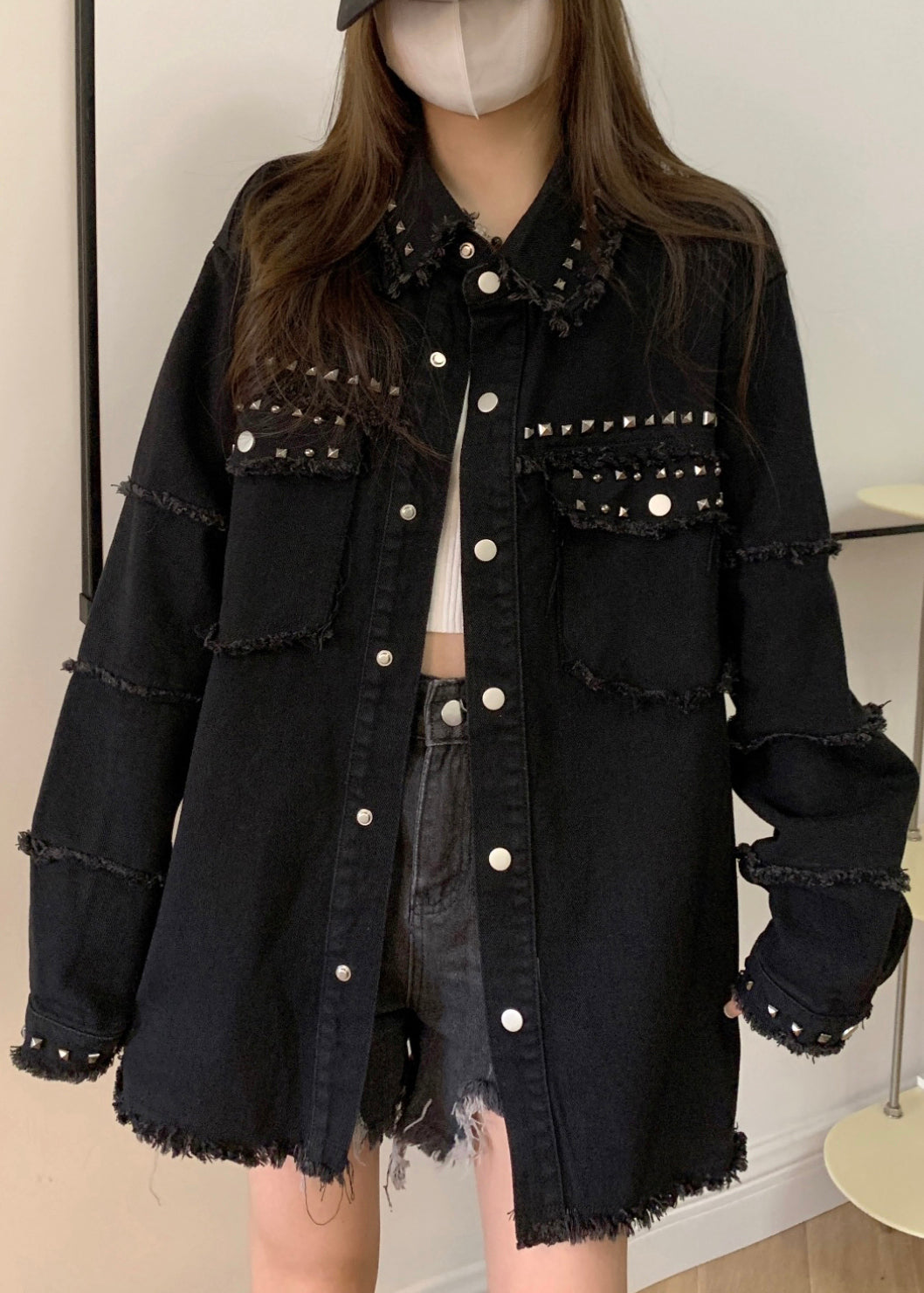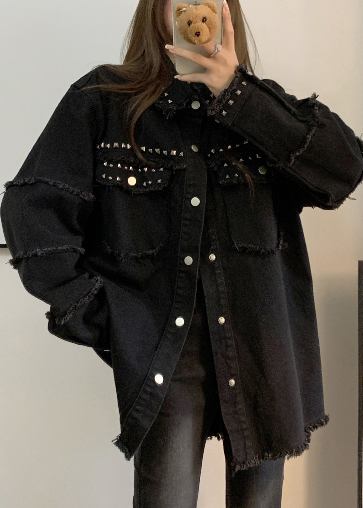 Loose Black Pockets Nail Bead Denim Coats Long Sleeve