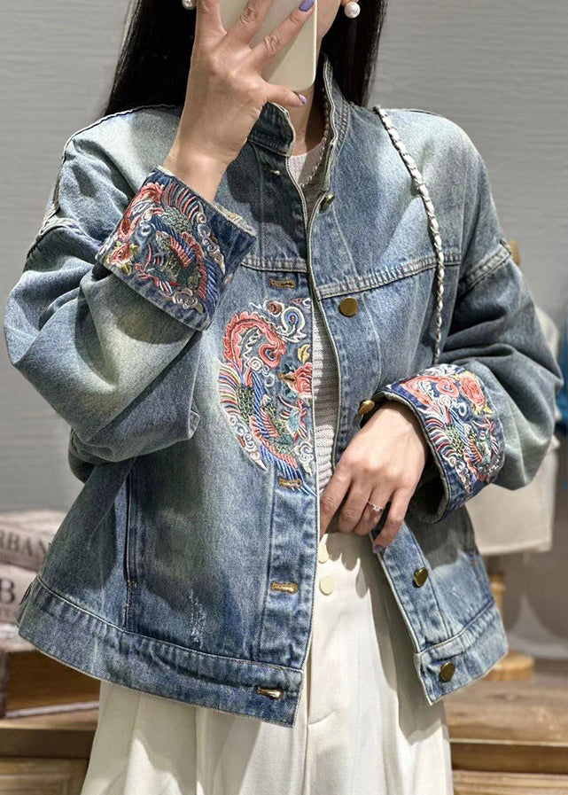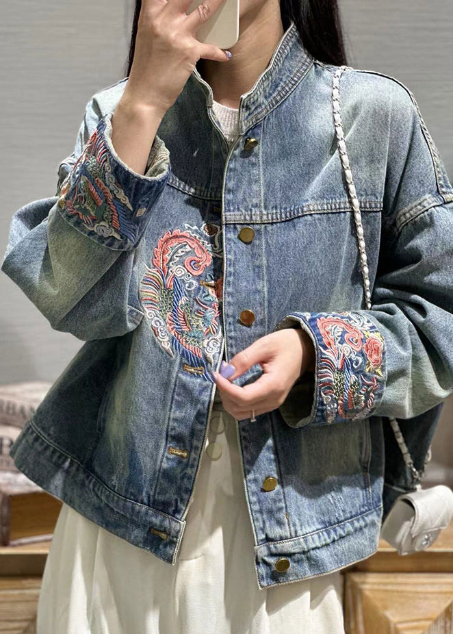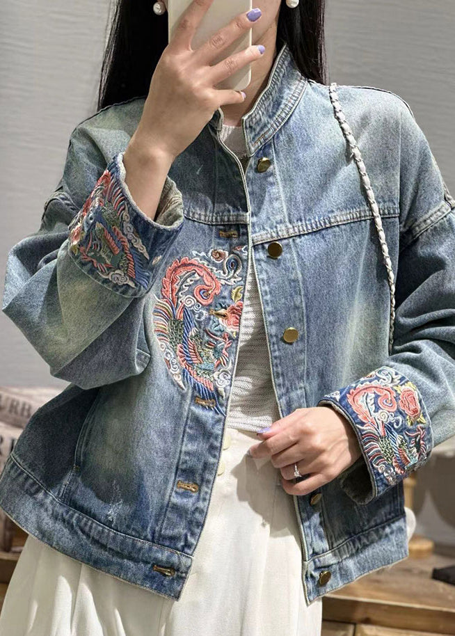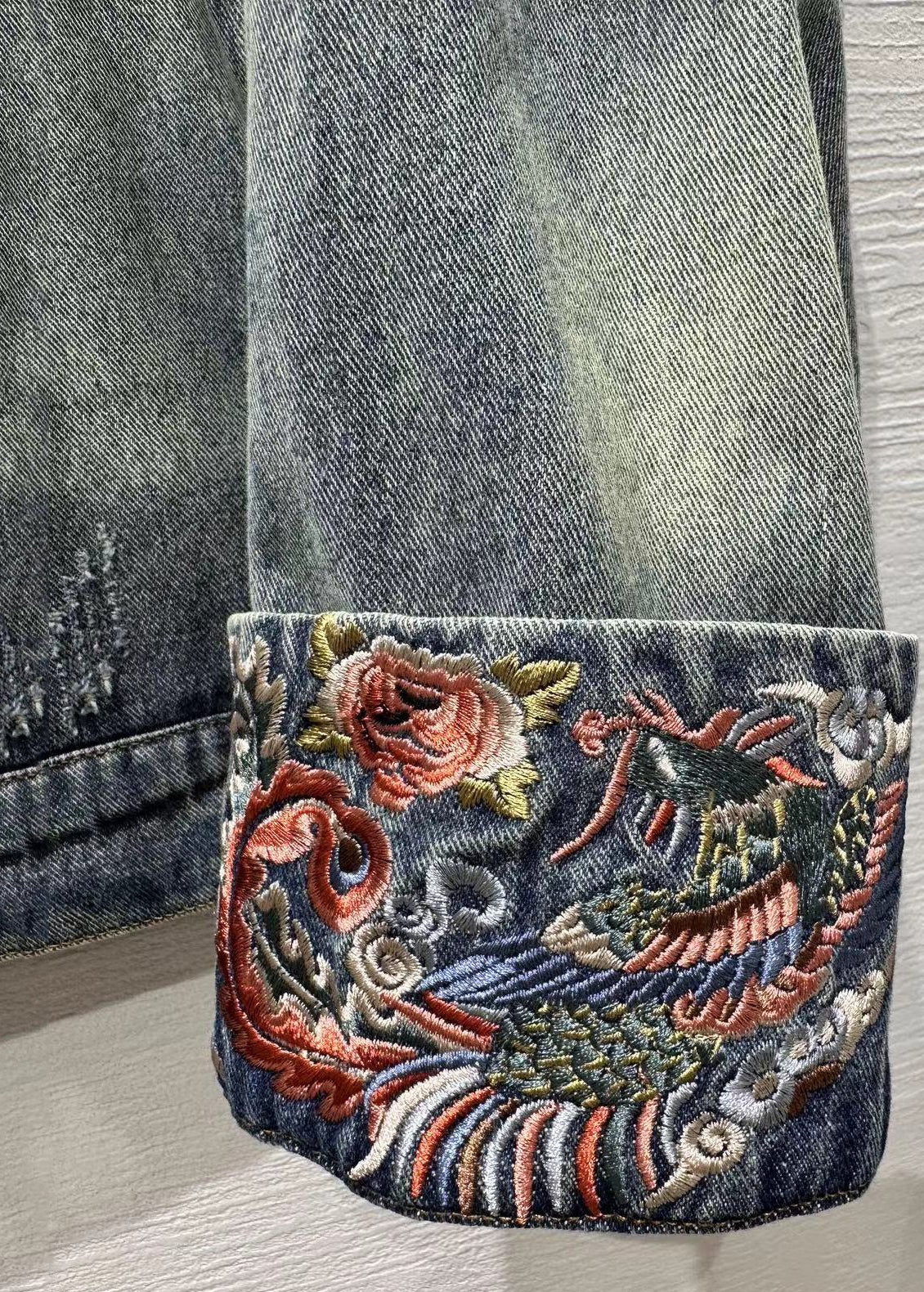 Loose Blue Embroideried Button Patchwork Denim Coat Fall