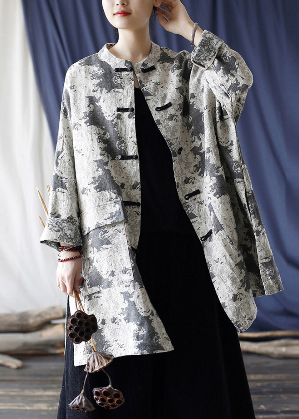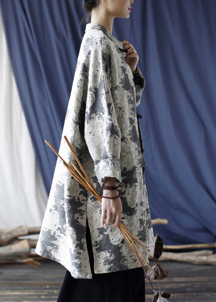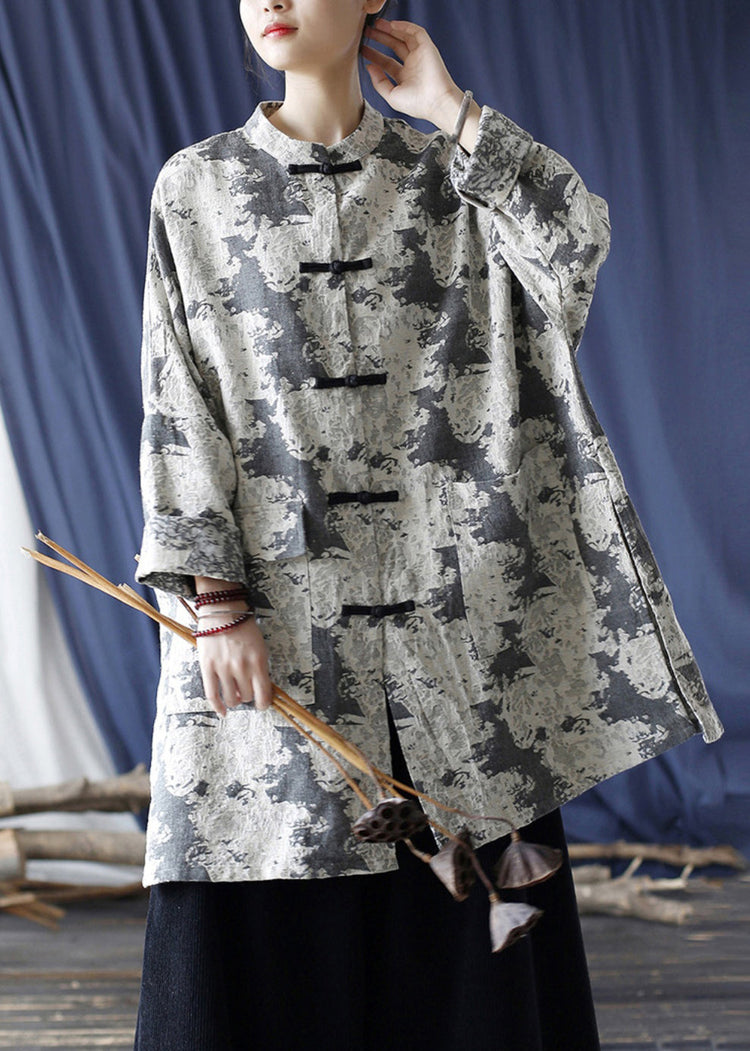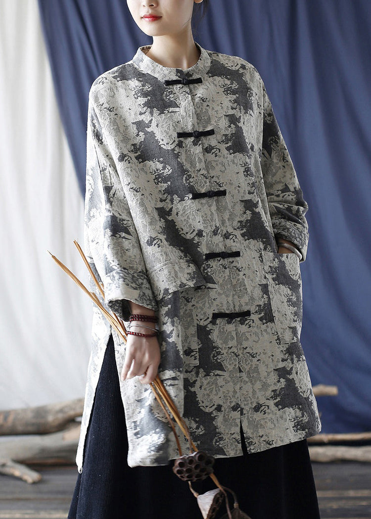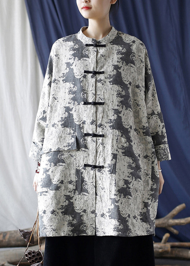 Loose Grey Button Print Pockets Cotton Coats Long Sleeve