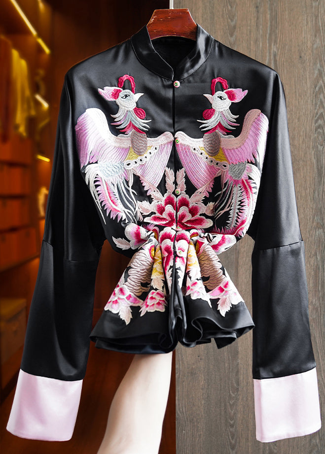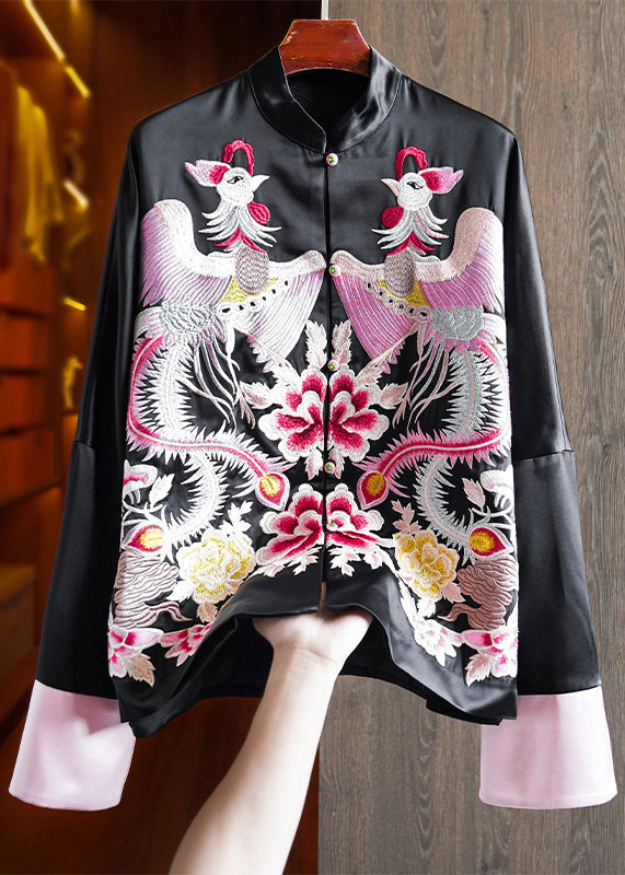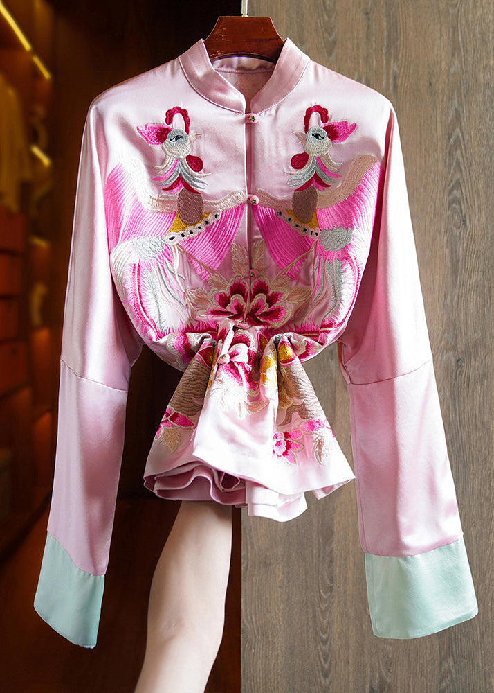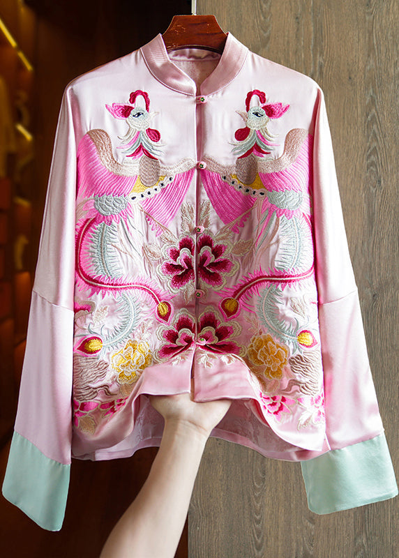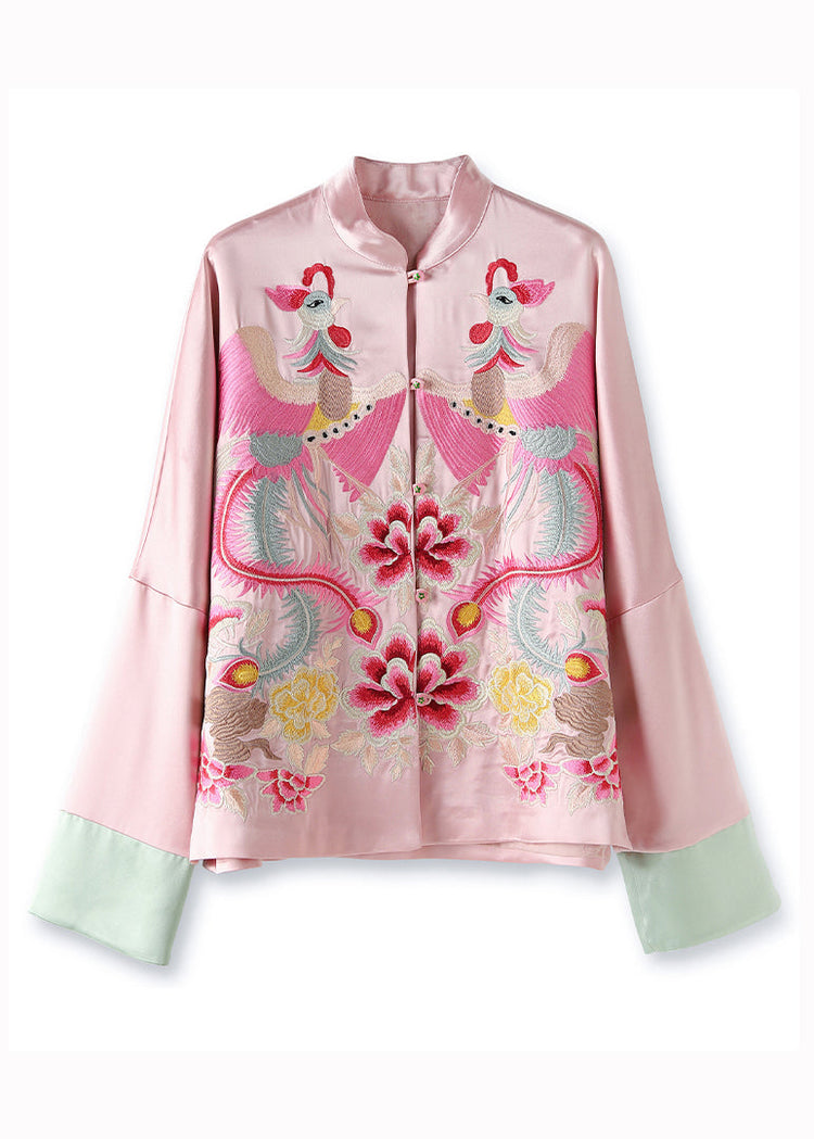 Loose Pink Stand Collar Embroideried Patchwork Silk Coats Fall