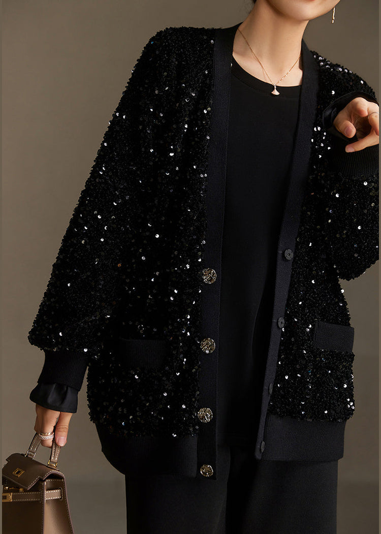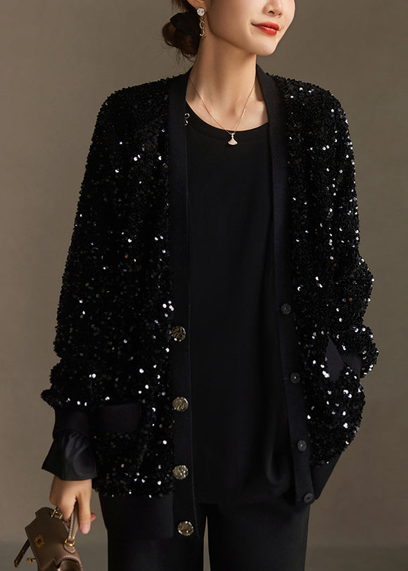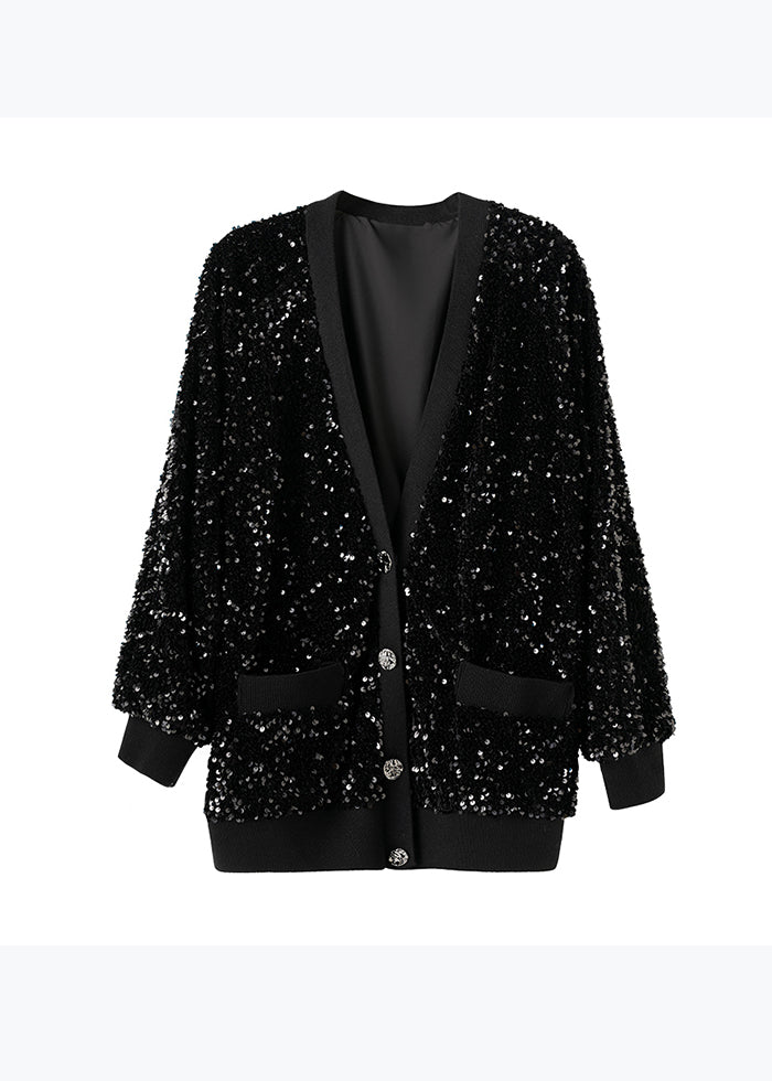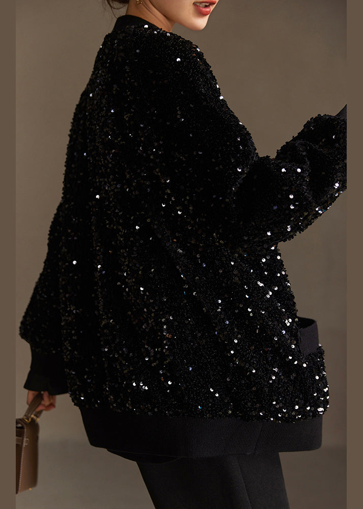 Modern Boutique Black V Neck Pockets Sequins Short Coat Spring