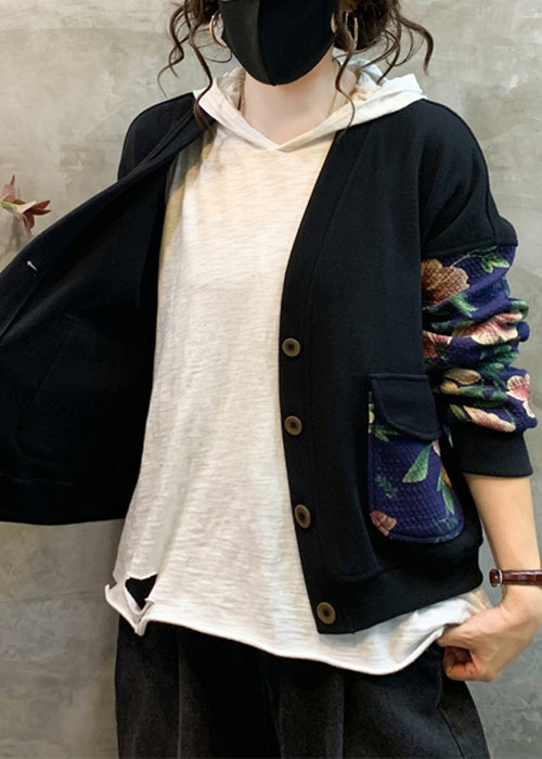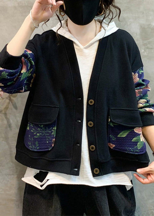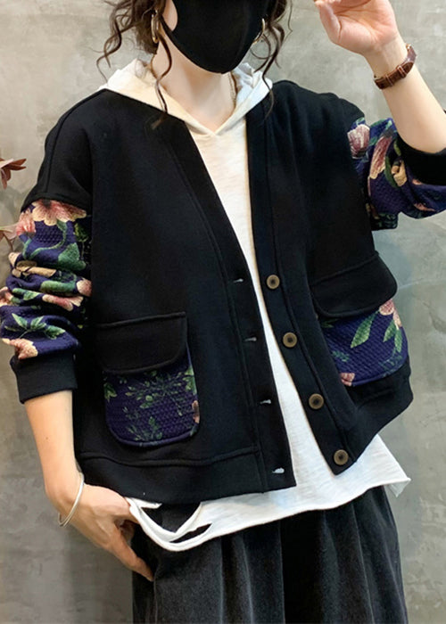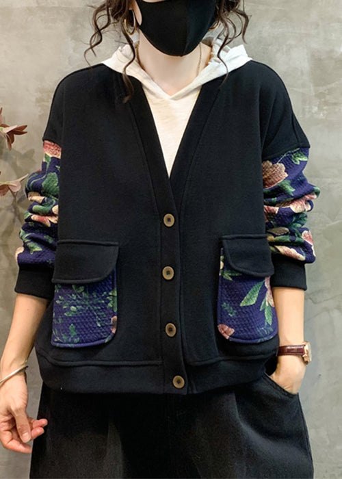 Navy Print Patchwork Warm Fleece Coat V Neck Long Sleeve