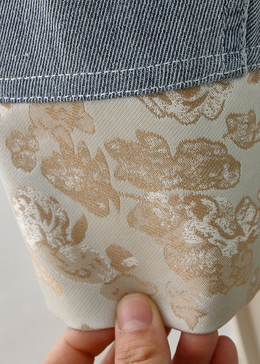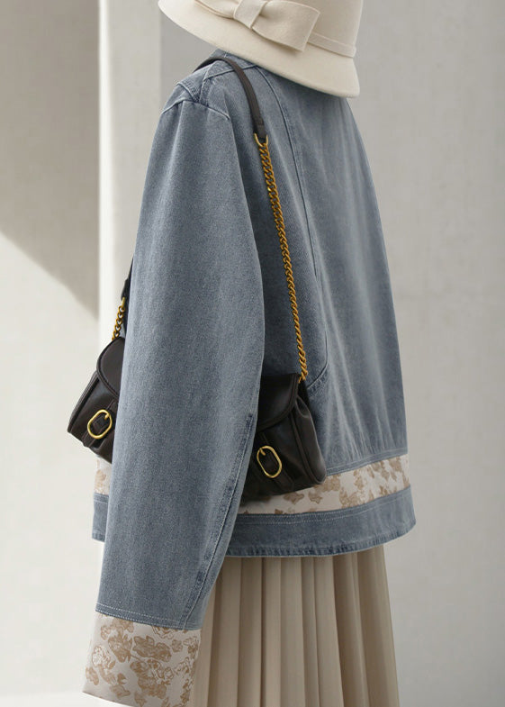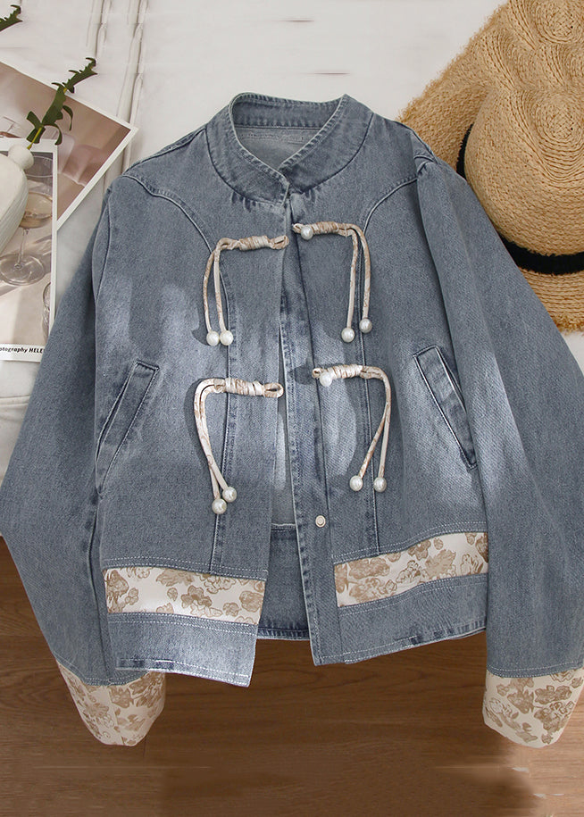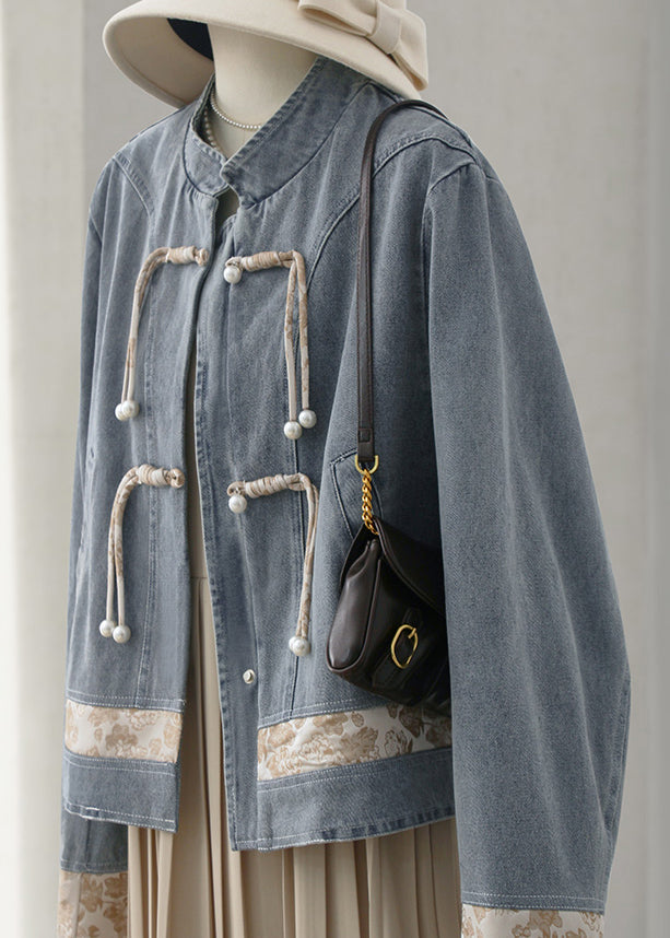 New Blue Stand Collar Button Patchwork Denim Coats Long Sleeve