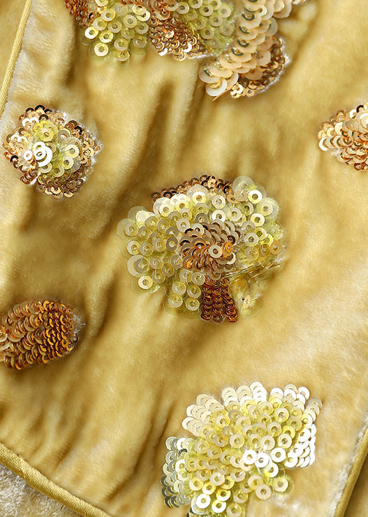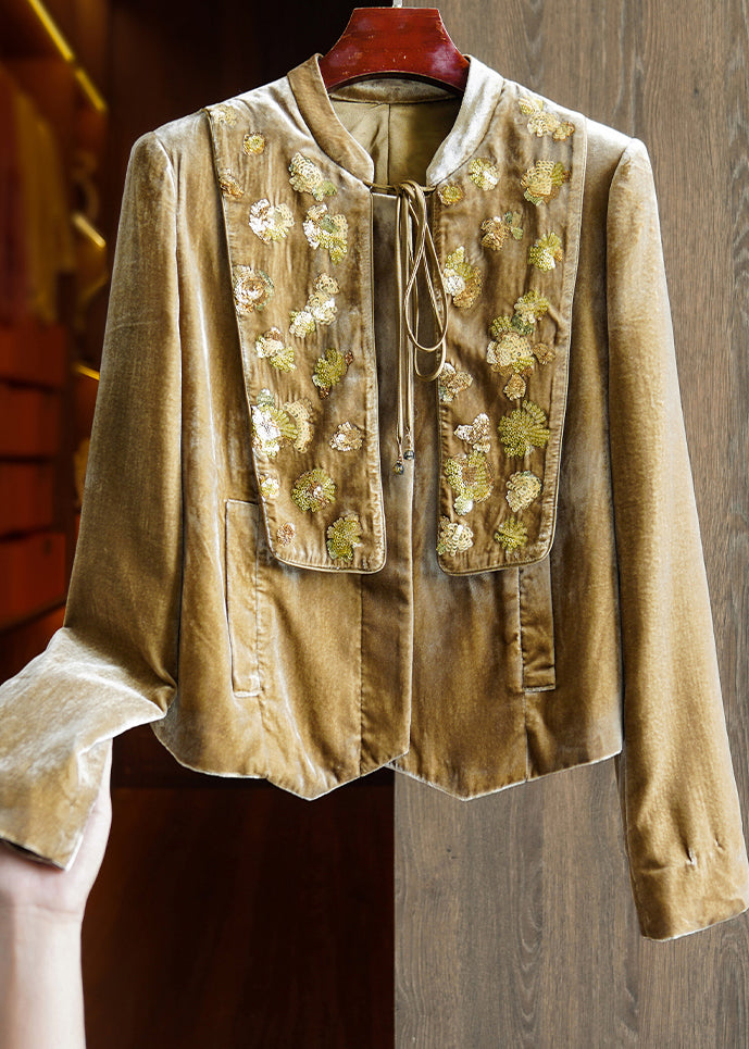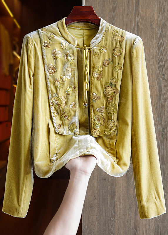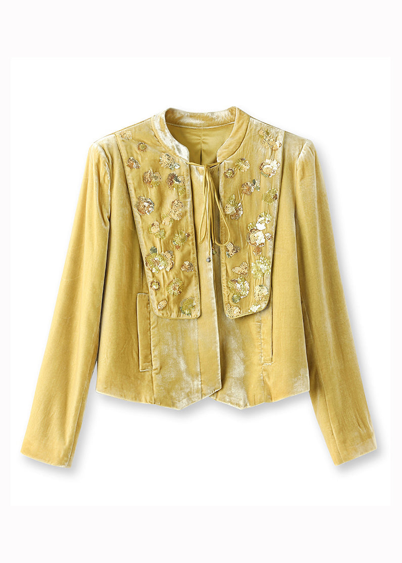 New Dark Yellow Sequins Lace Up Patchwork Silk Velour Coats Fall