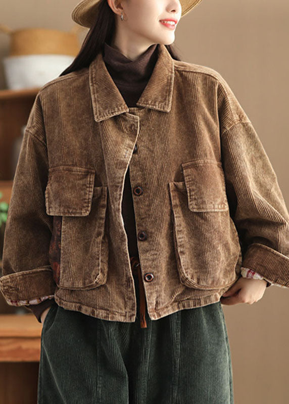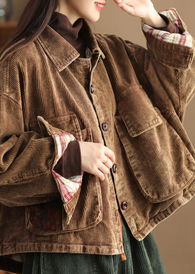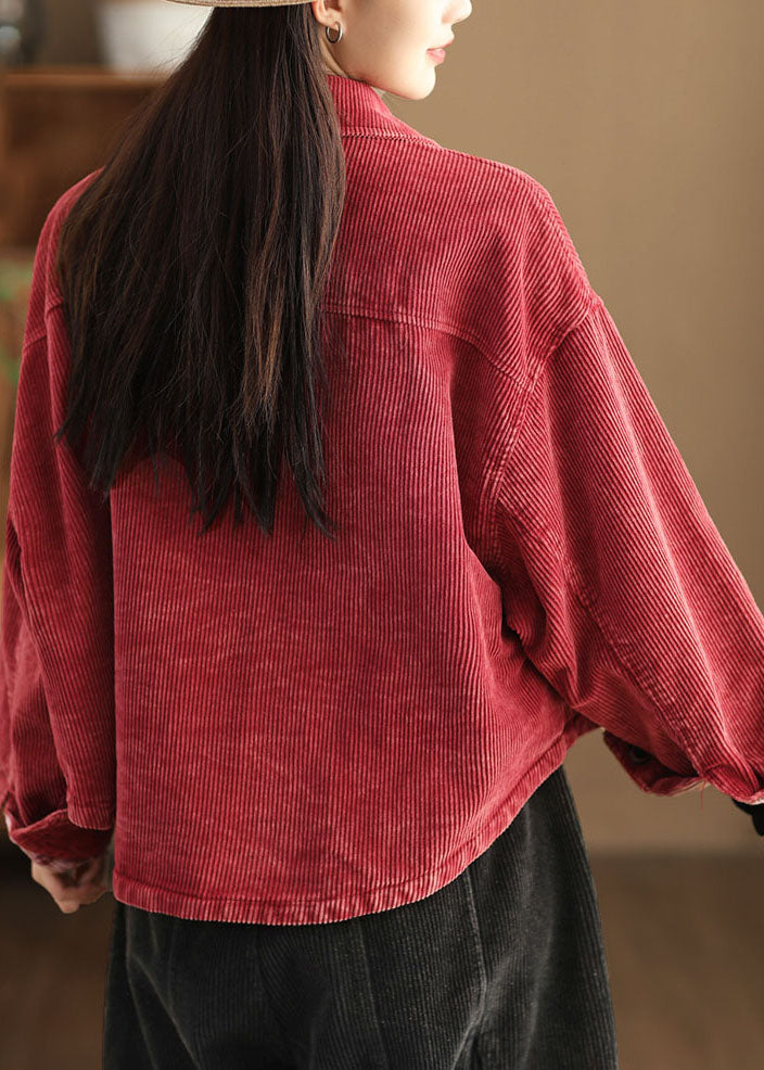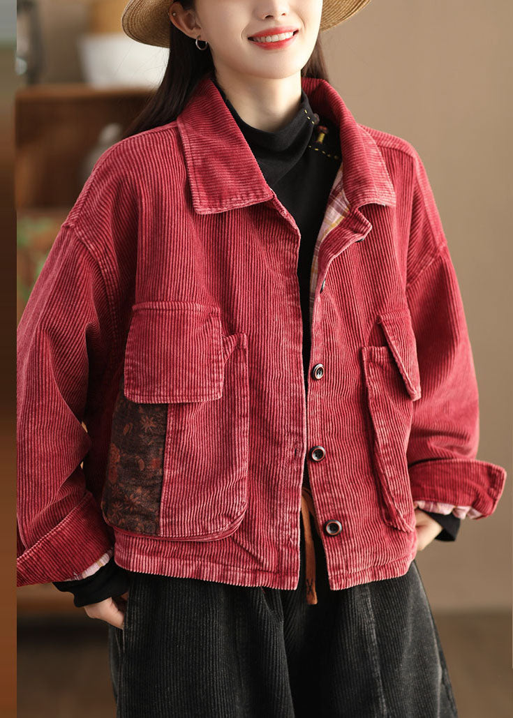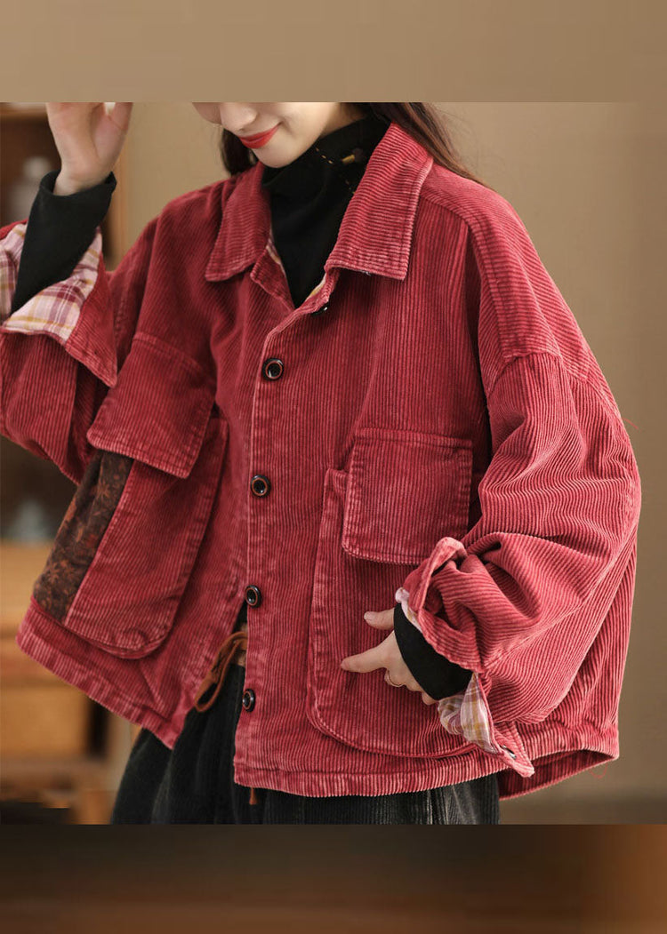 Retro Red Peter Pan Collar Pockets Patchwork Button Corduroy Coat Long Sleeve
