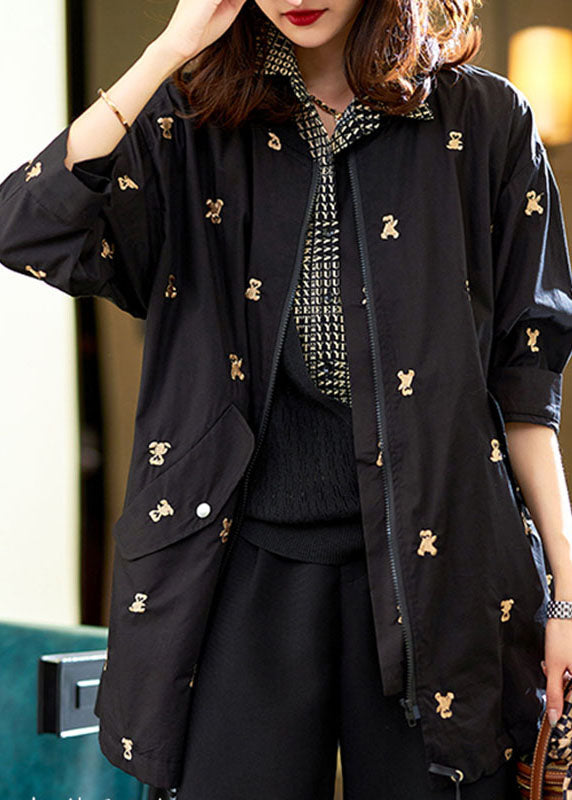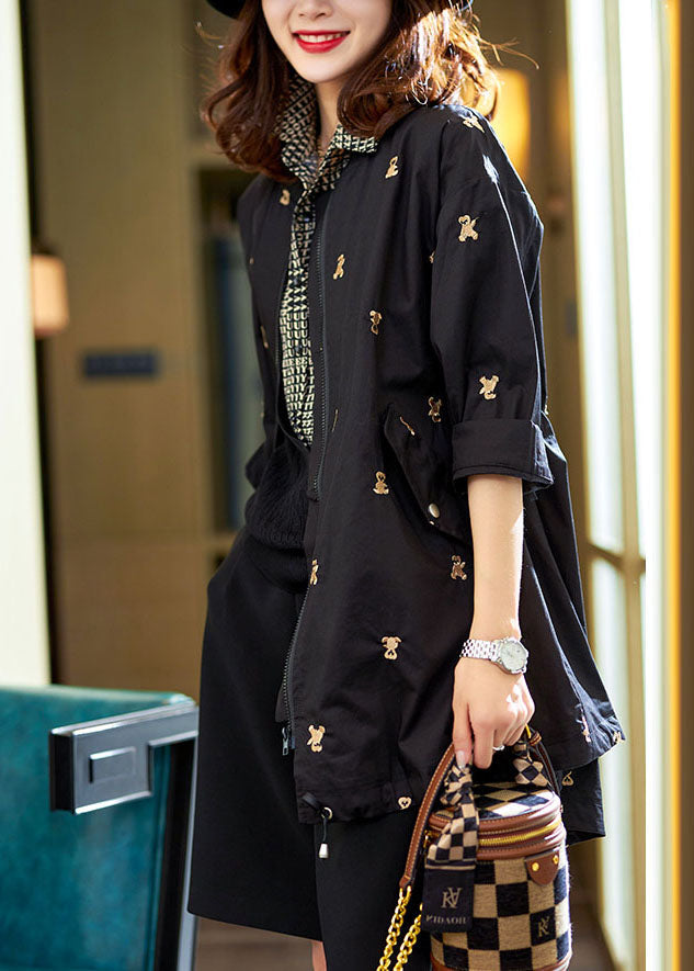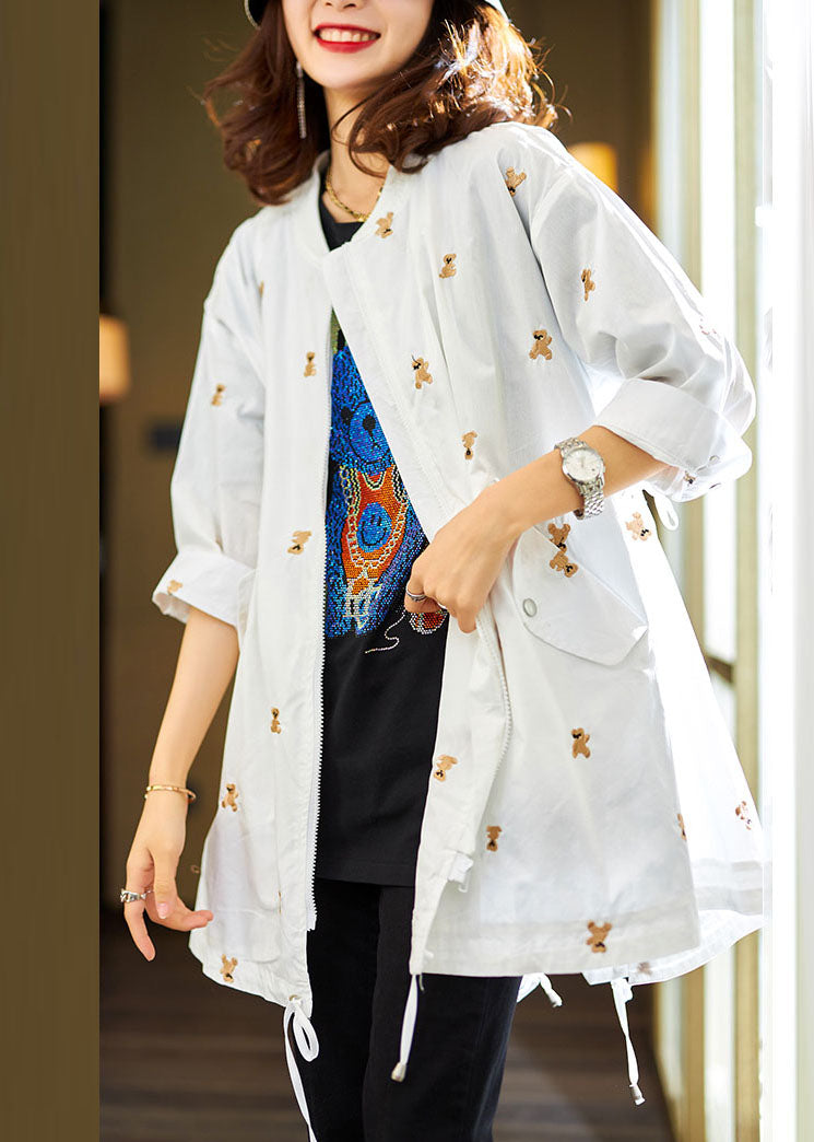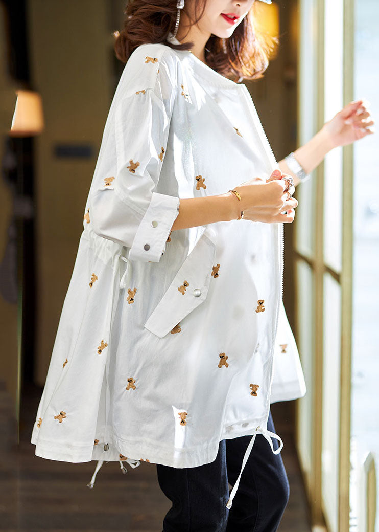 Simple White Little Bear Embroideried Zippered Drawstring Cotton Coats Fall