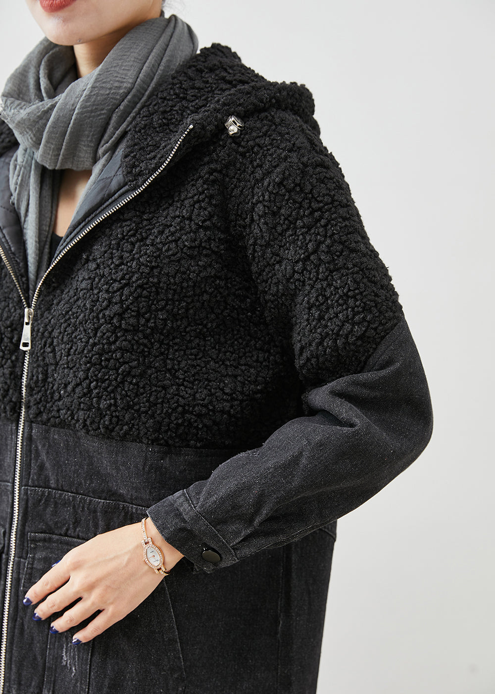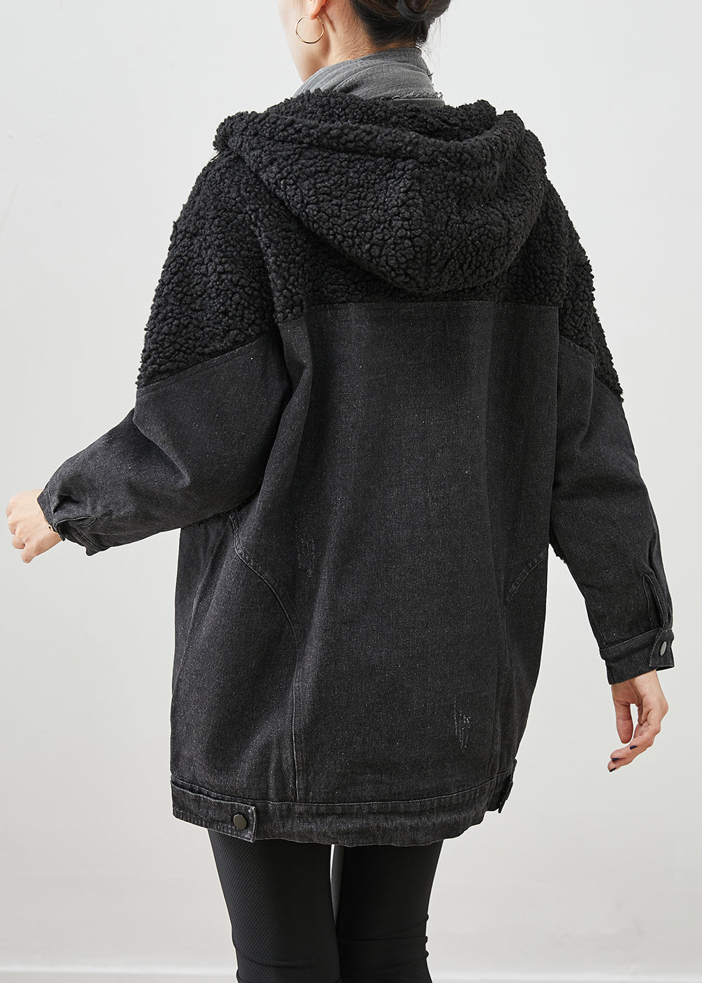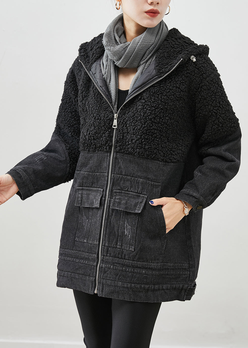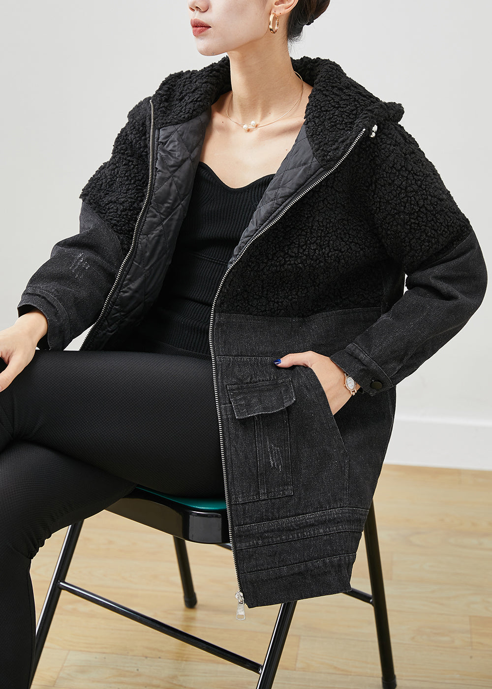 Unique Black Hooded Patchwork Woolen Denim Fine Cotton Filled Jackets Winter